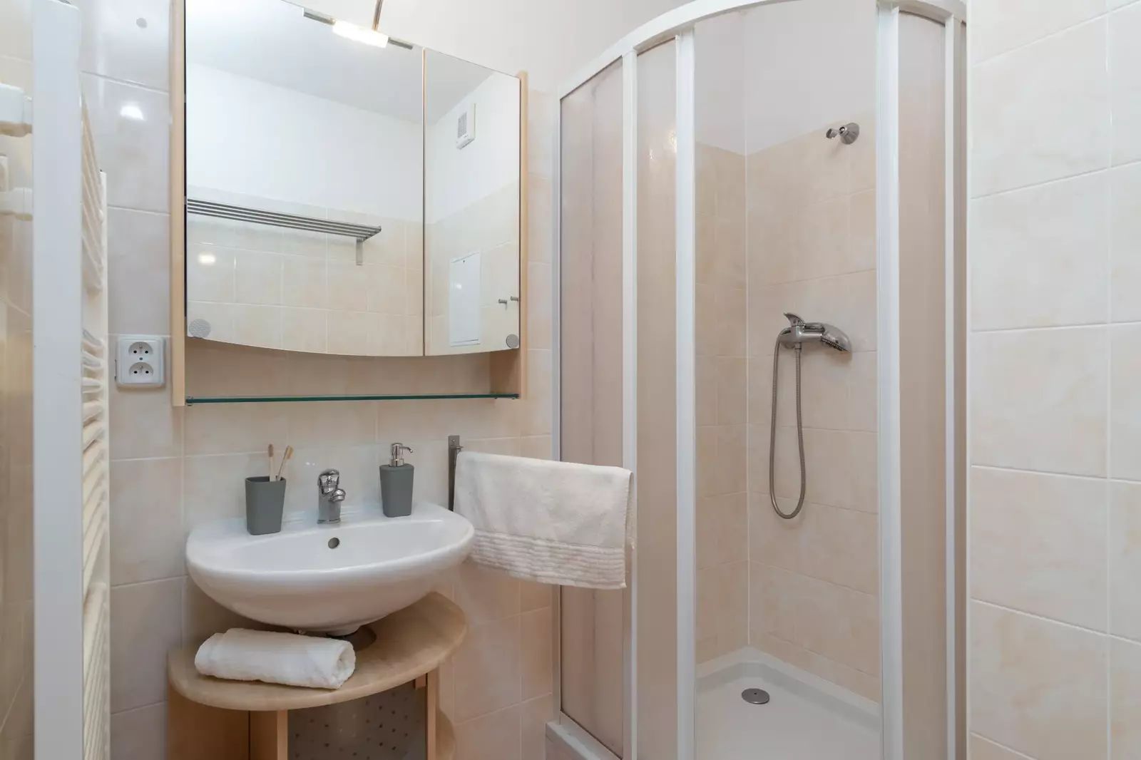 • Koupelna s WC: Třetí dveře z chodby vedou do koupelny, která je vybavena sprchovým koutem, umyvadlem a toaletou