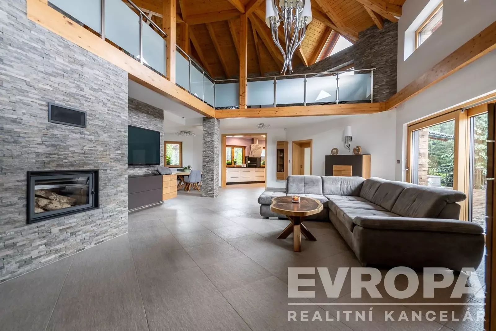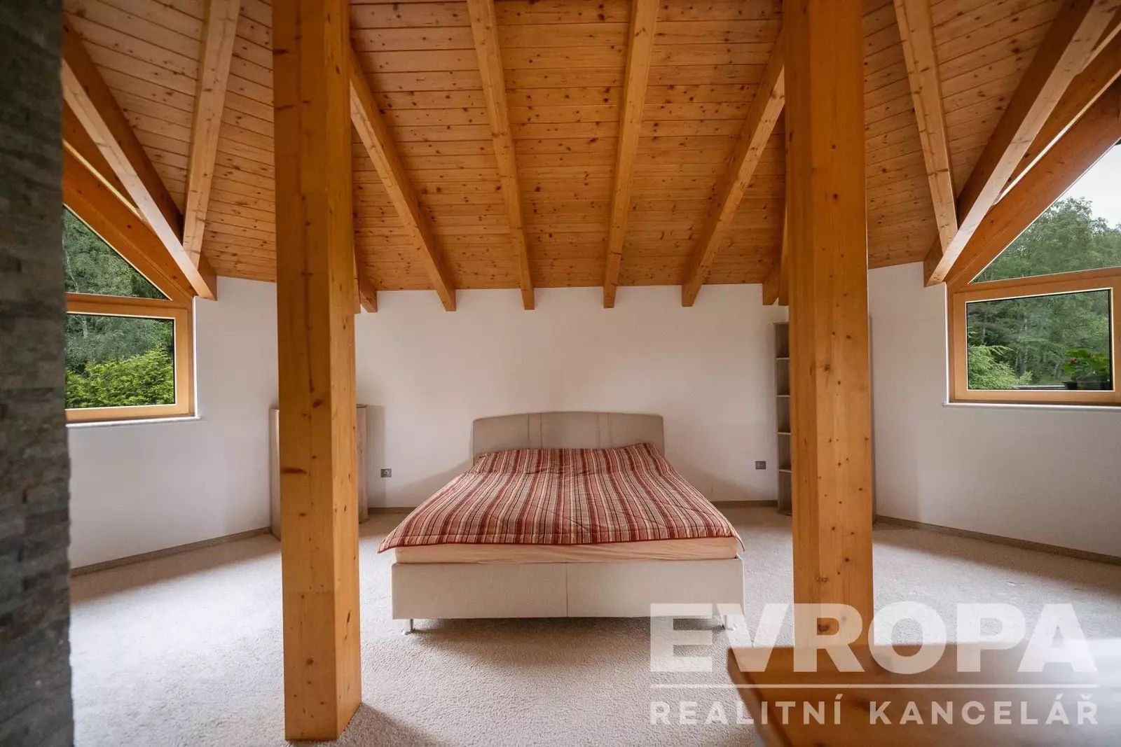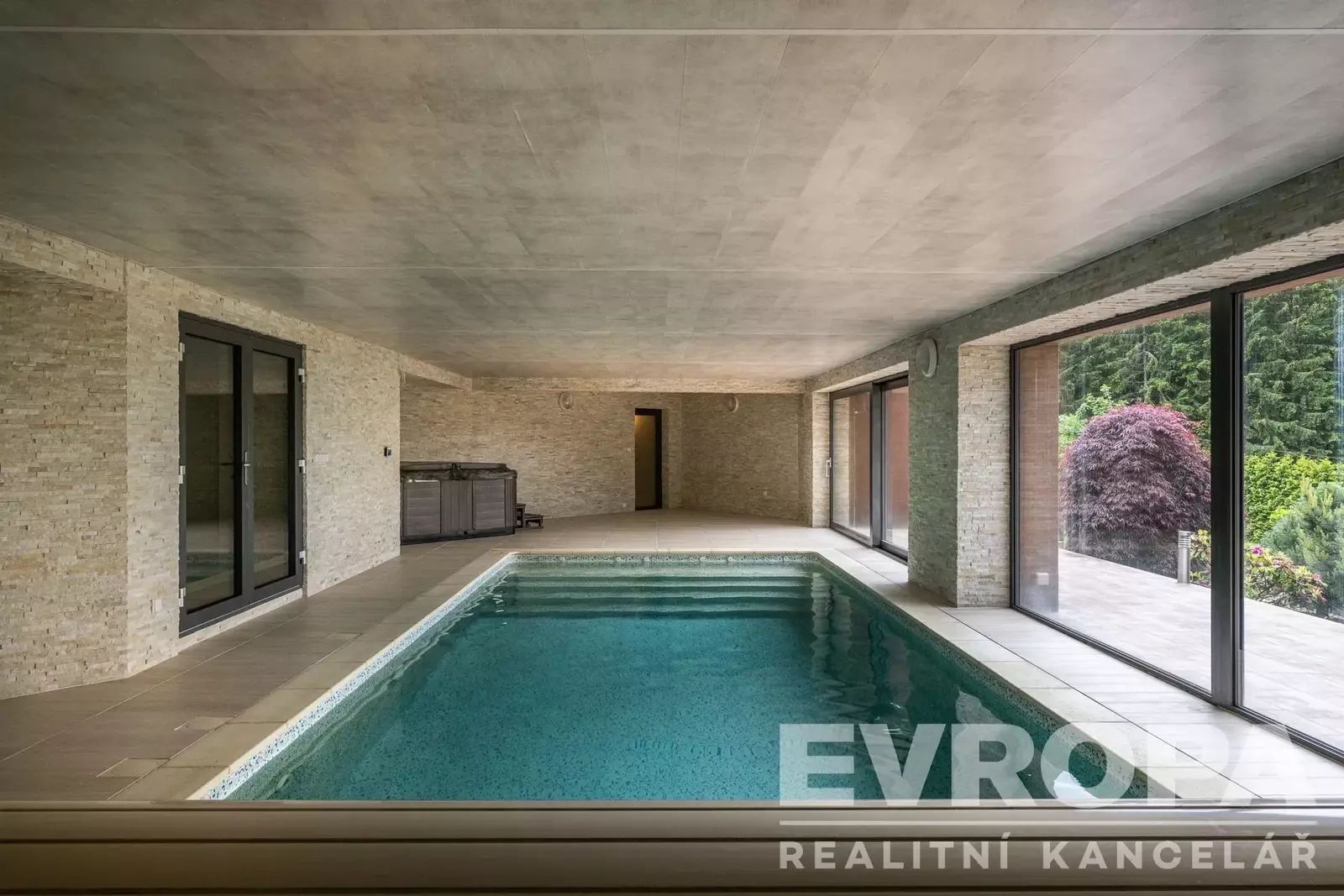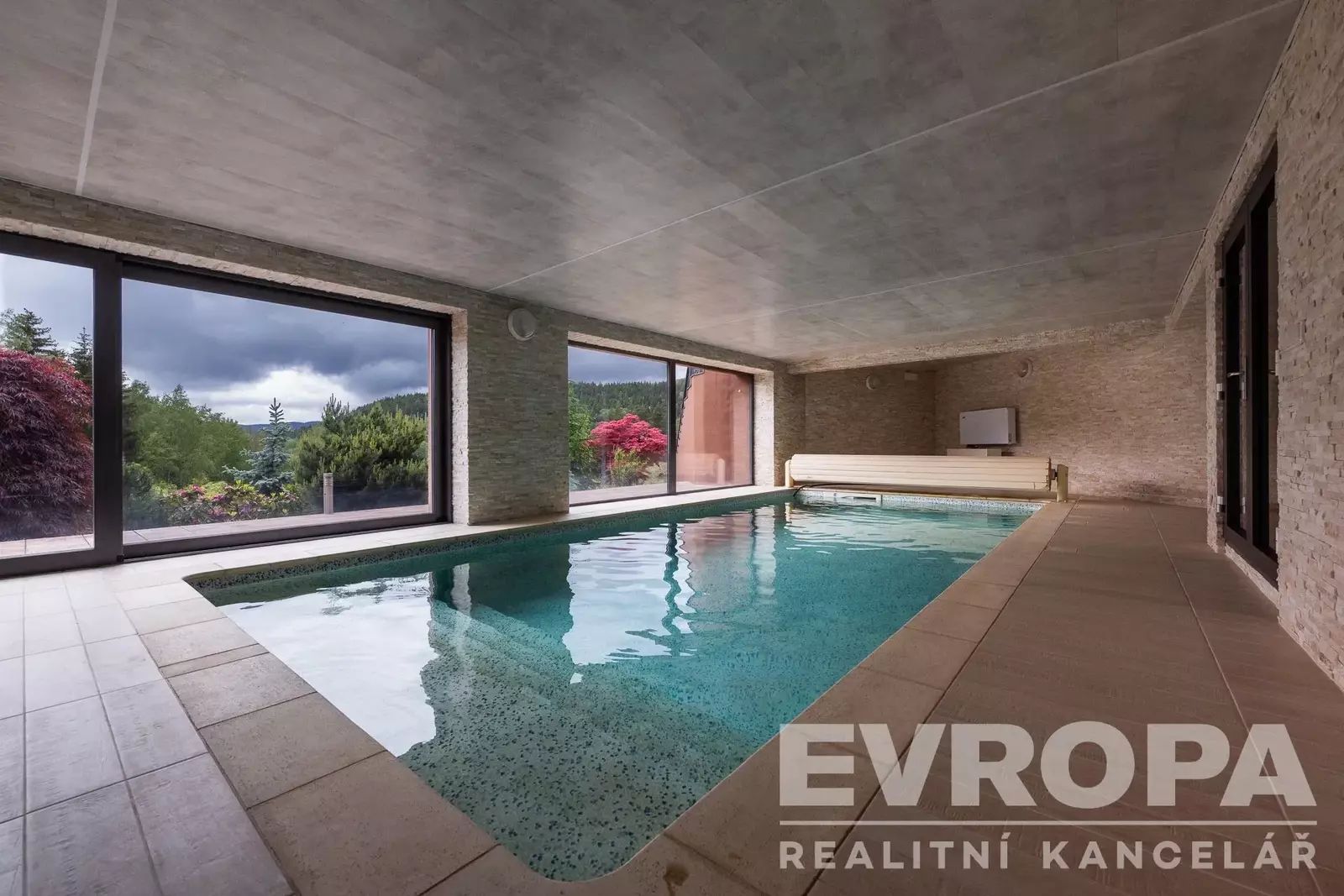 Otevřené patro galerie s ložnicí a vlastní koupelnou nabízí ničím nerušený výhled do okolní krajiny. Pro relaxaci je tu domácí wellness s bazénem 4x10 m, saunou s odpočívárnou a vířivkou výhledem do údolí, klubovna. Ať už hledáte únik před stresem každodenního života, nebo místo pro setkávání s přáteli, toto sídlo vám poskytne obojí.