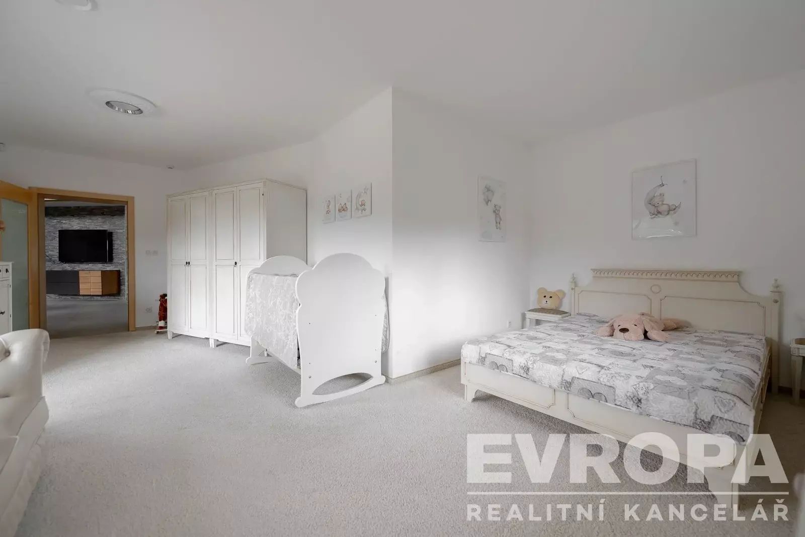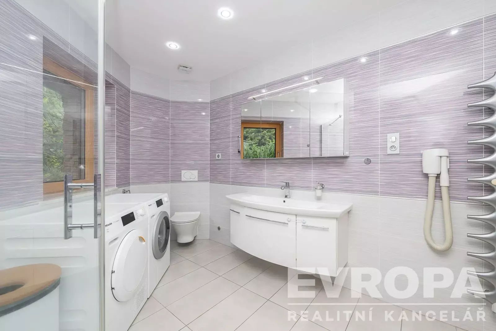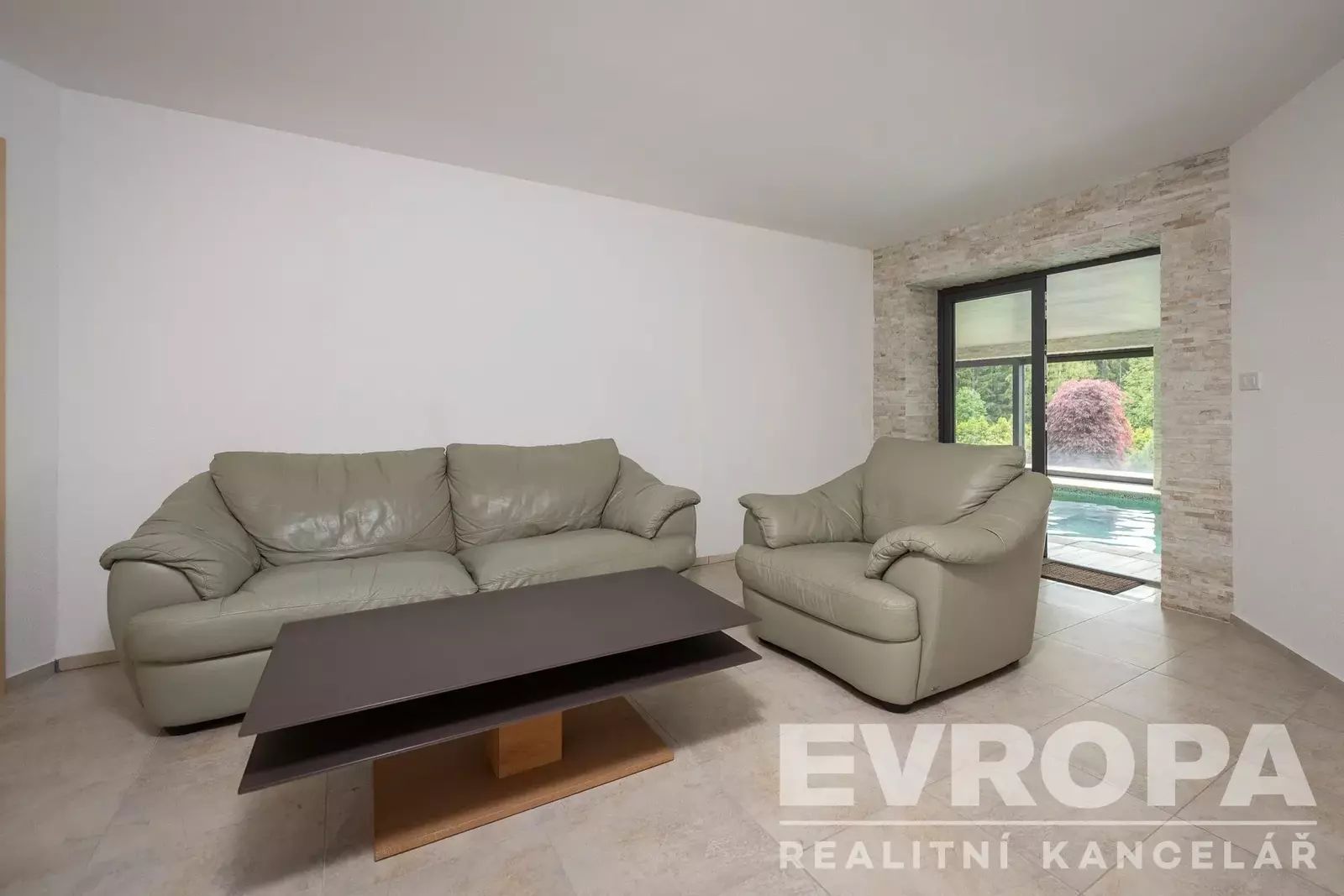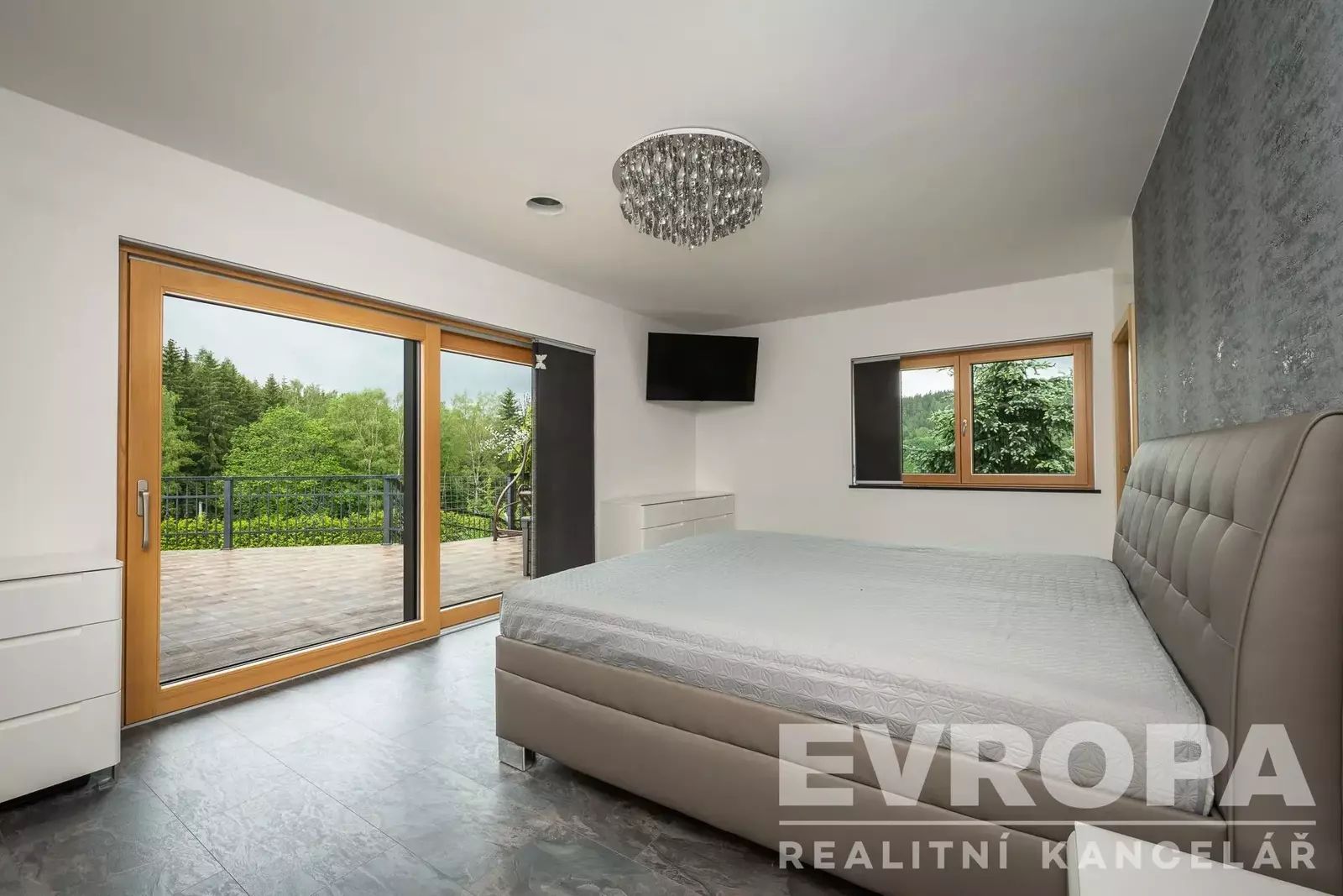 Otevřené patro galerie s ložnicí a vlastní koupelnou nabízí ničím nerušený výhled do okolní krajiny. Pro relaxaci je tu domácí wellness s bazénem 4x10 m, saunou s odpočívárnou a vířivkou výhledem do údolí, klubovna. Ať už hledáte únik před stresem každodenního života, nebo místo pro setkávání s přáteli, toto sídlo vám poskytne obojí.