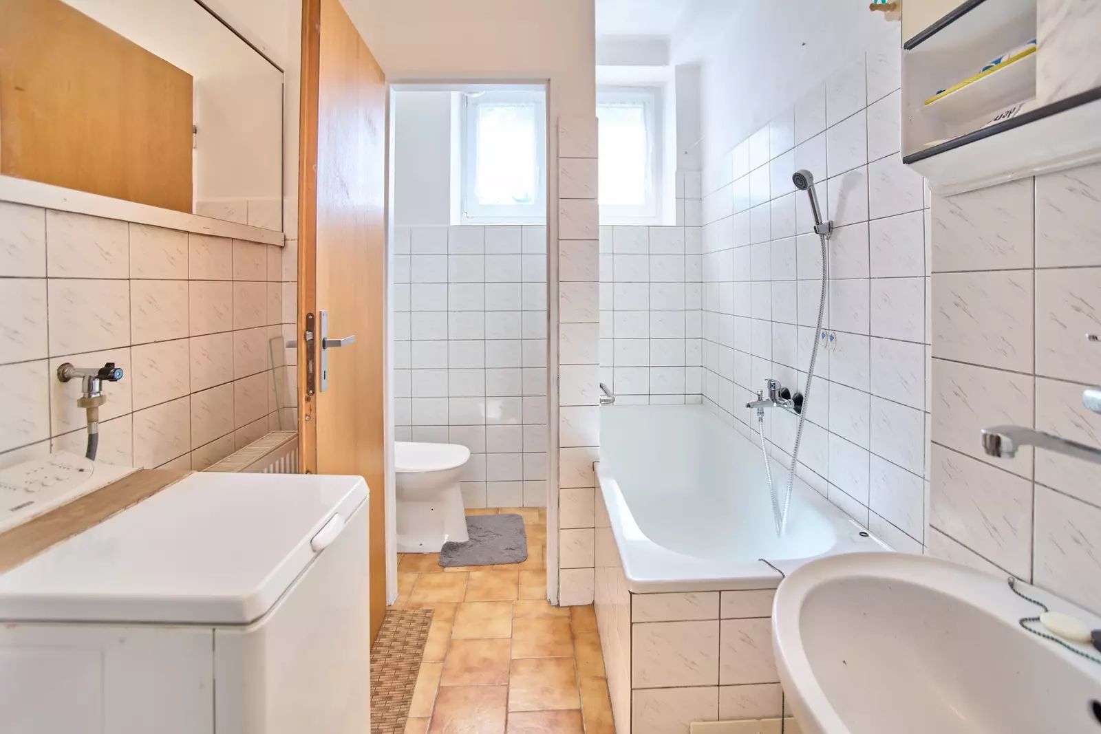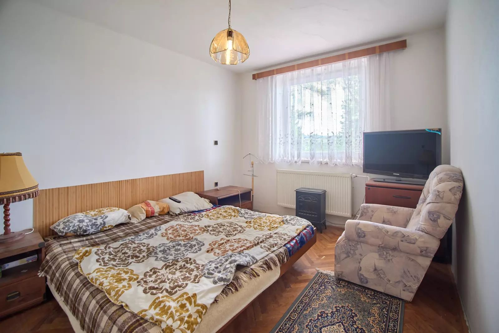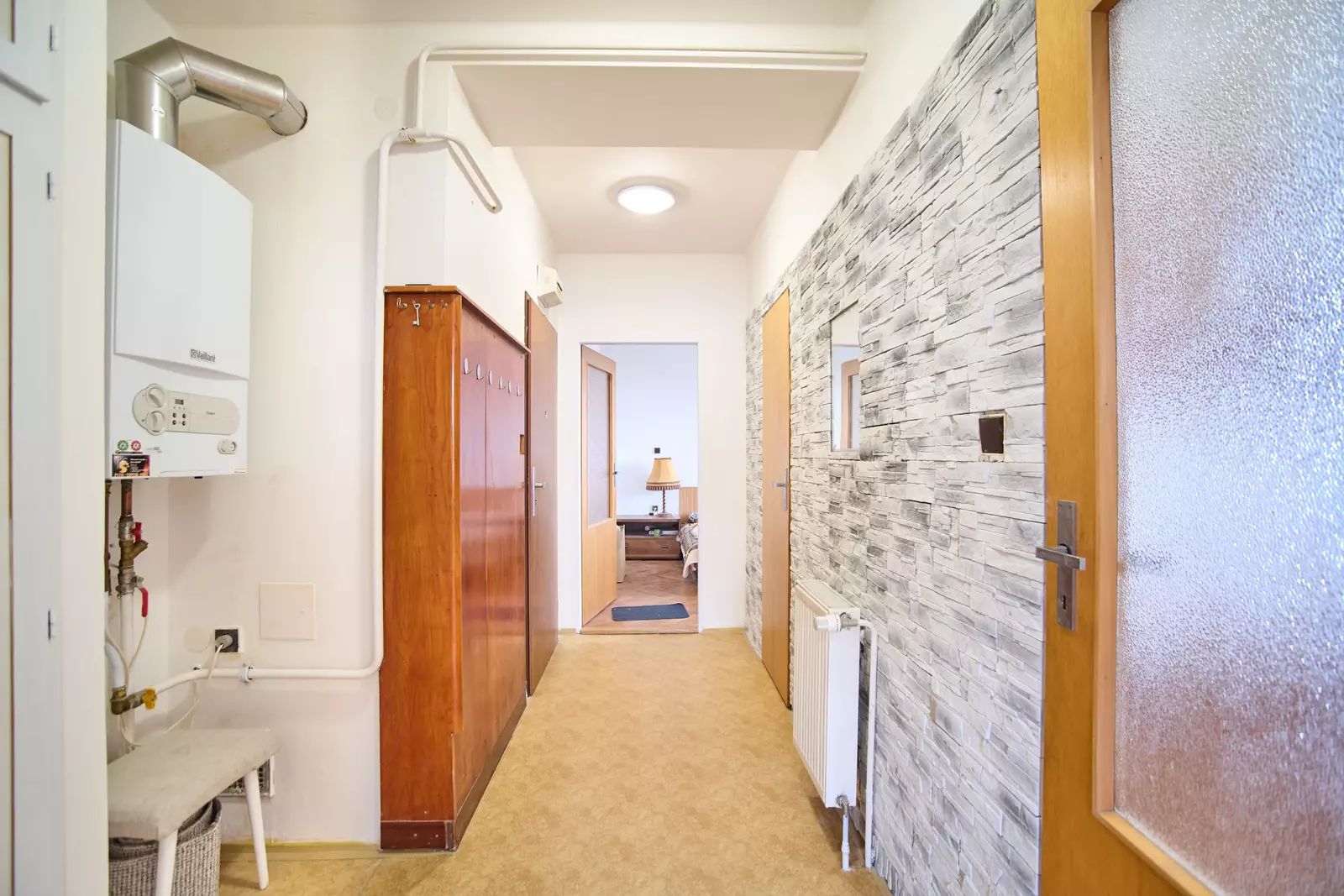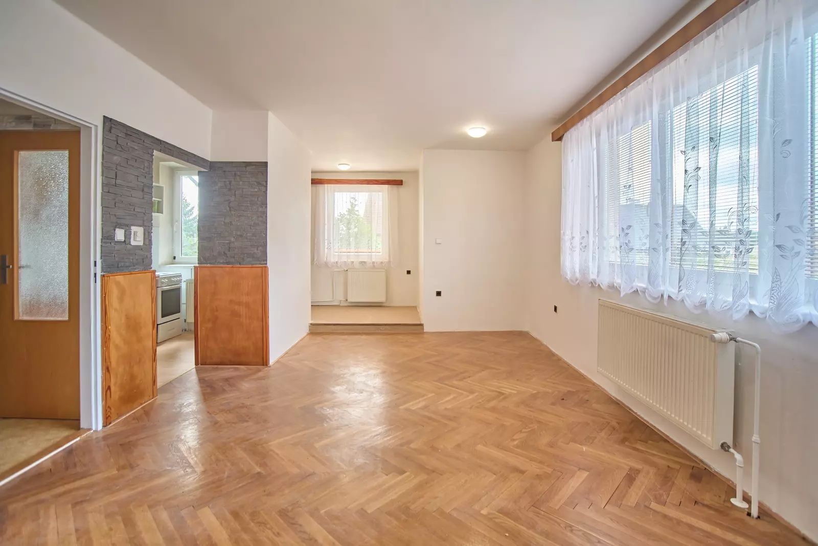 Vnitřní dispozice: prostorná chodba, kuchyňský kout, jídelna ve výklenku obývacího pokoje, prostorný obývací pokoj, koupelna s odděleným WC.