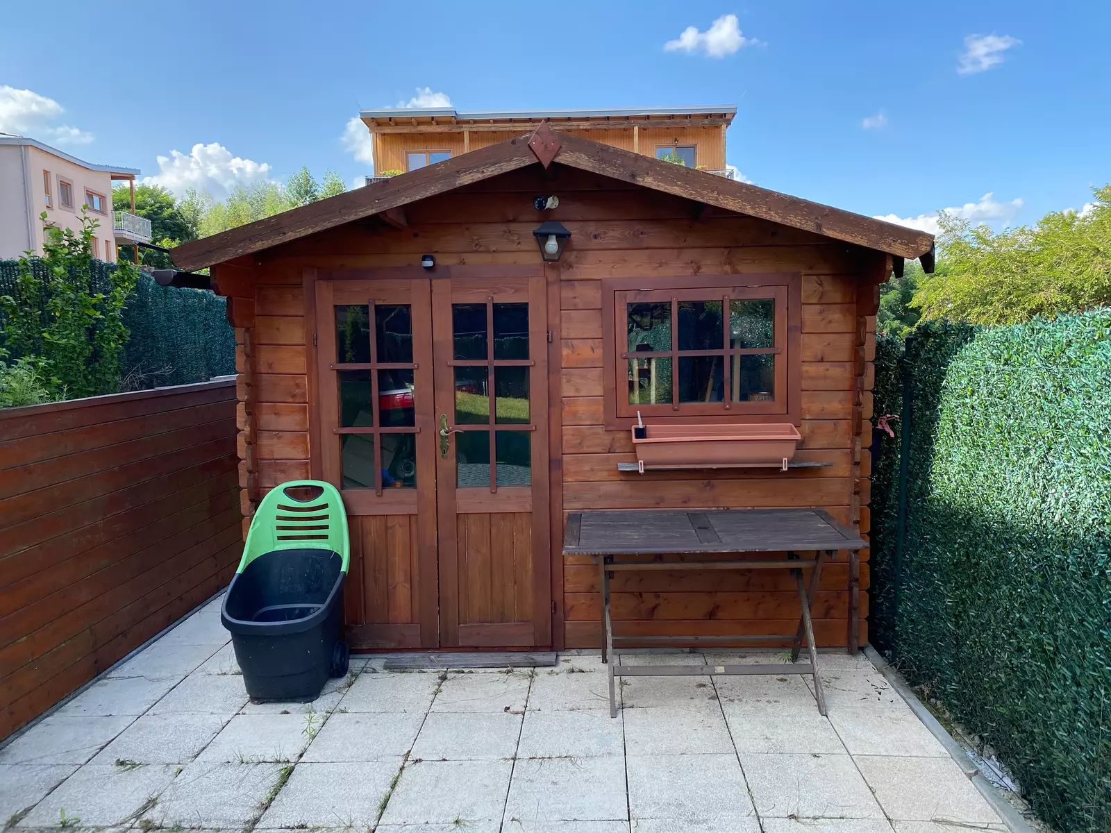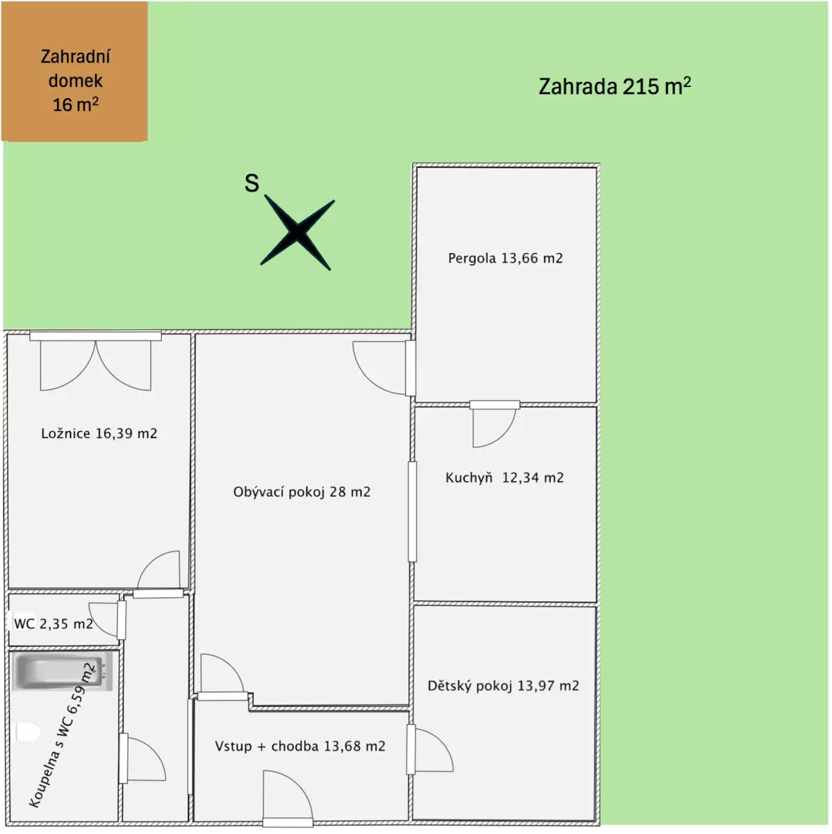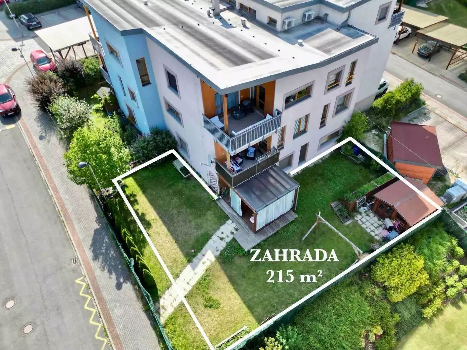 Dále k bytu náleží oplocená zahrada o rozloze 215 m2 se zahradním domkem 4x4 m, vlastní zastřešené parkovací stání a sklepní box 2,1 m2.