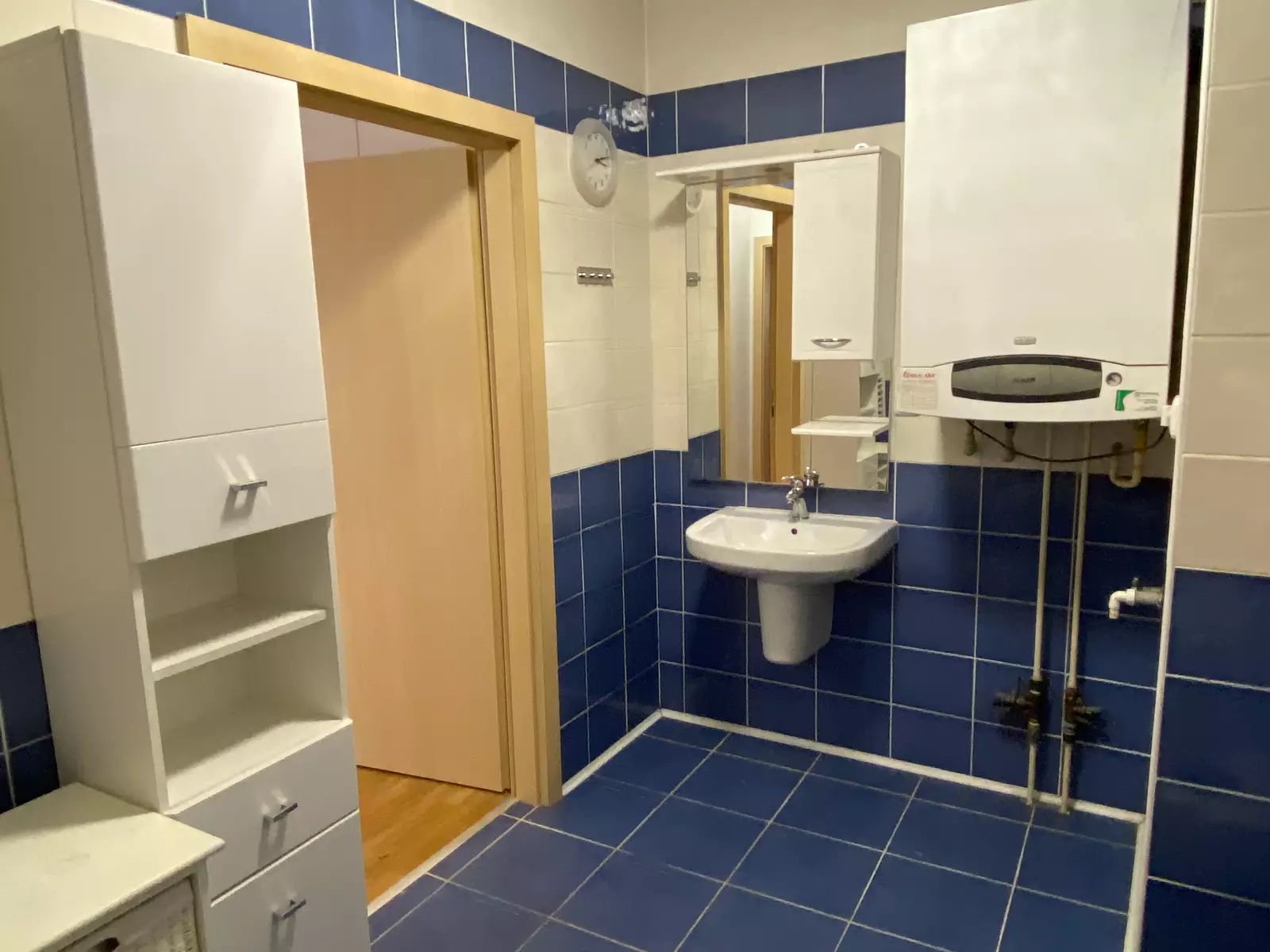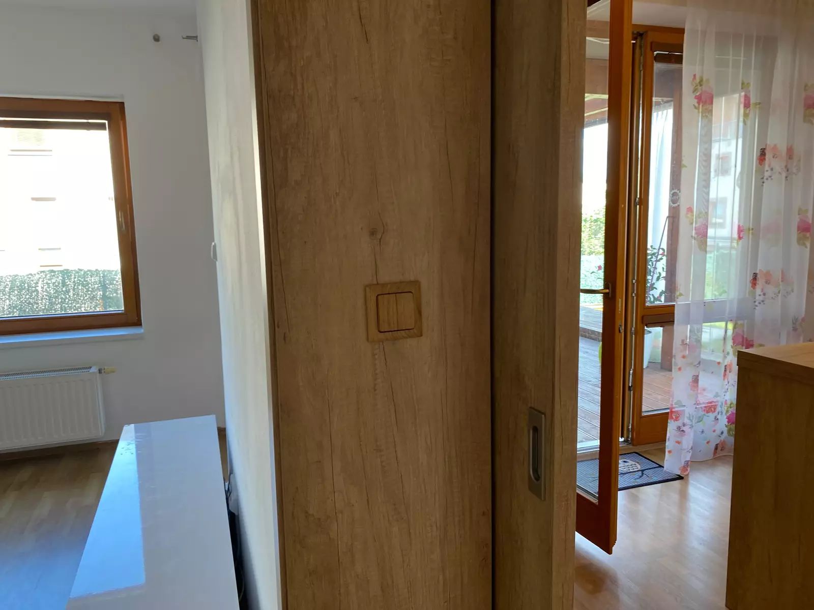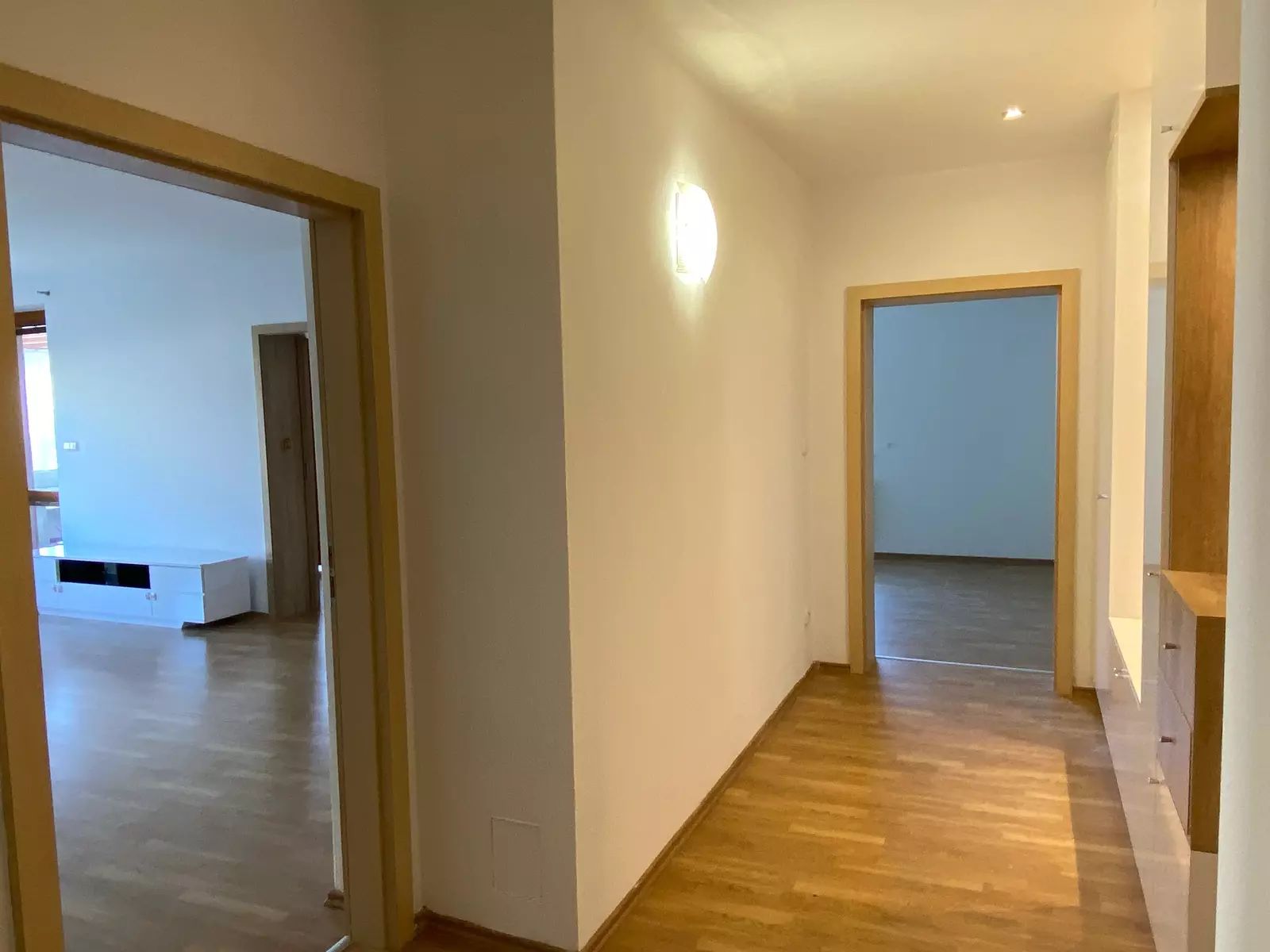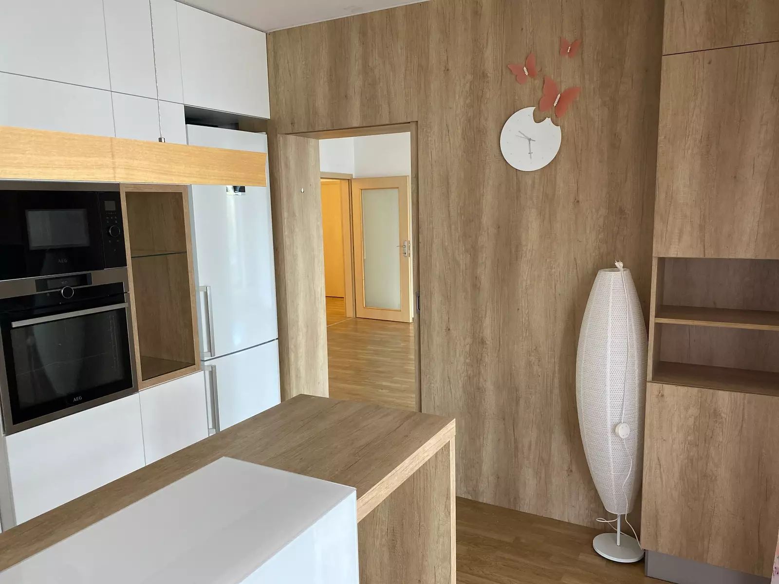 Kuchyň je vybavená kuchyňskou linkou s vestavěnými spotřebiči včetně lednice, tak jak vidíte na fotografiích. V koupelně je umístěn plynový kotel, vana a WC. V bytě je navíc i samostatná toaleta. V prostorné chodbě jsou skříně s úložnými prostory. Bezbariérový byt má všechny interiérové dveře o velikosti 90 cm. Venkovní prostor bytu je snímán kamerovým systémem.