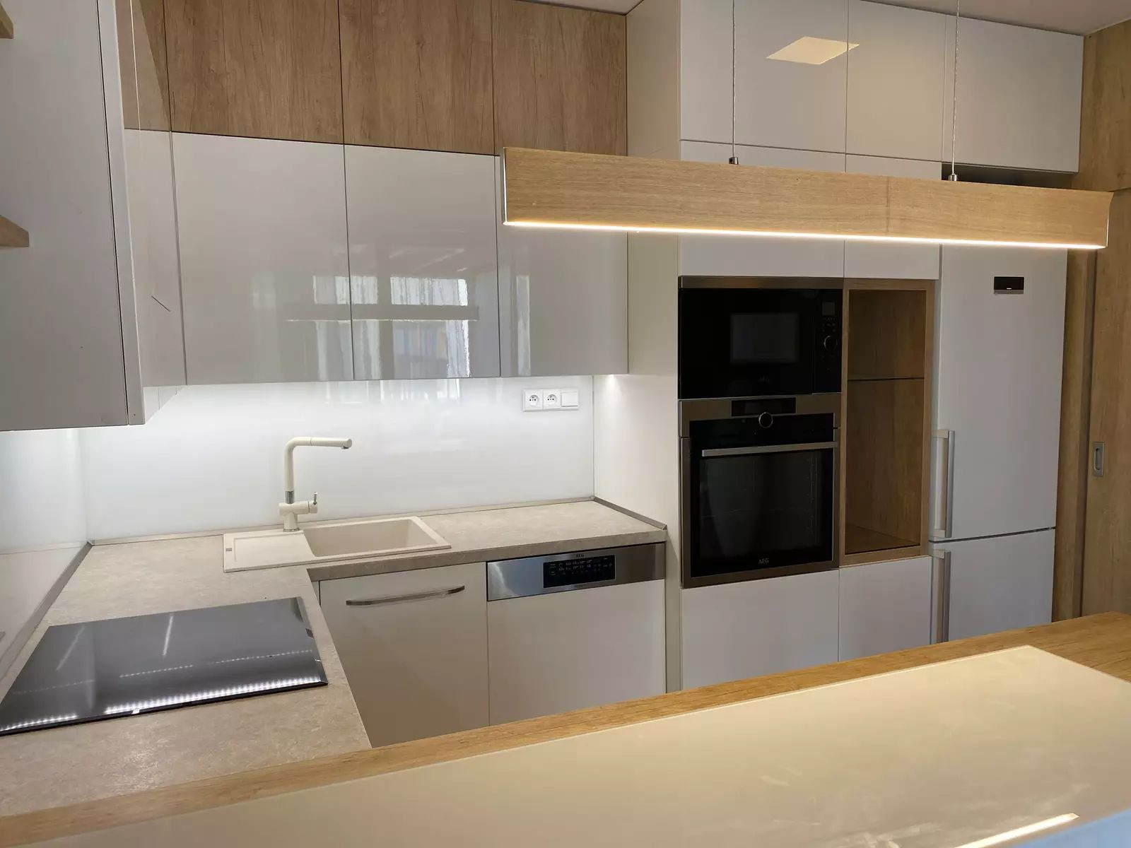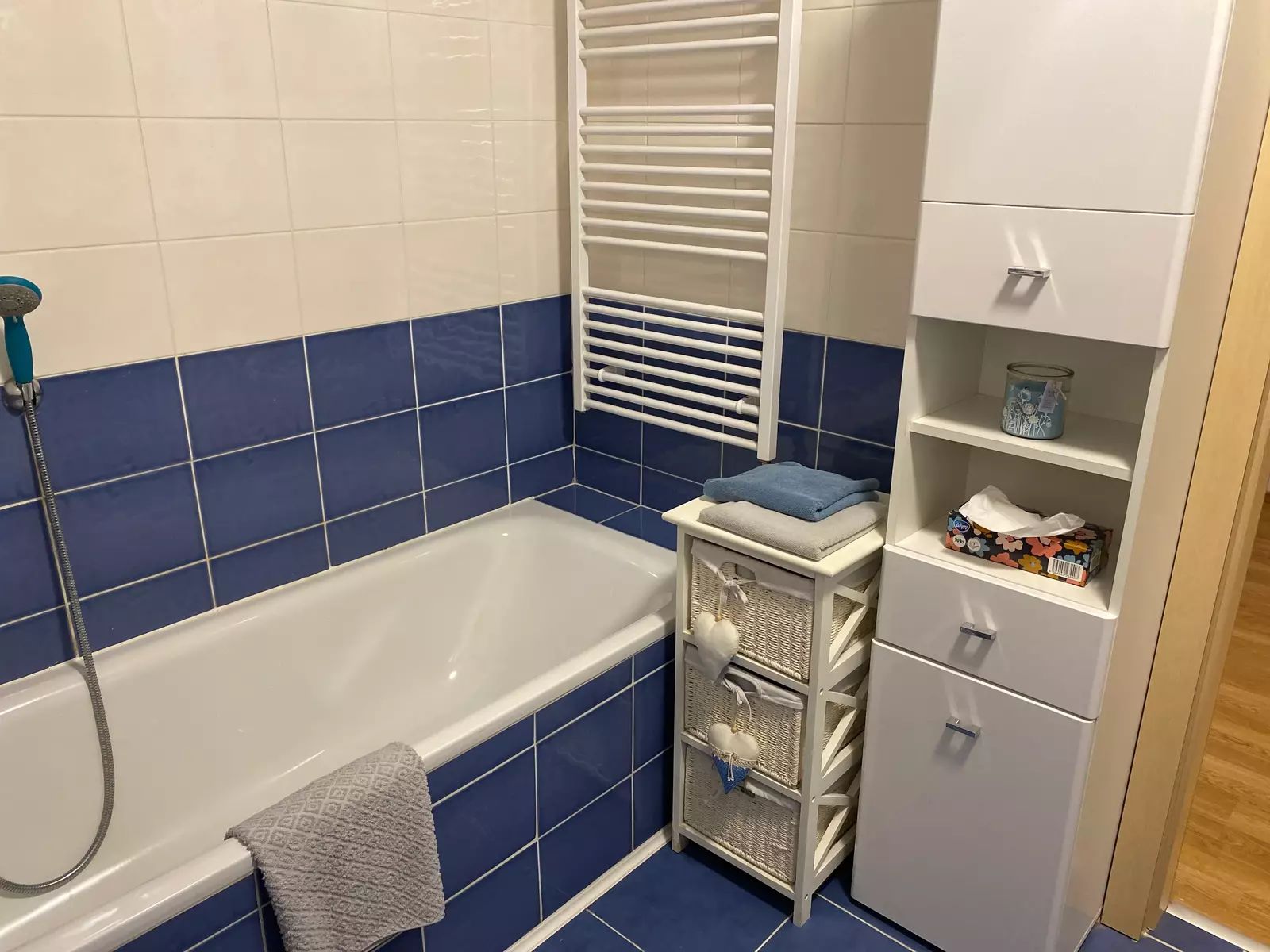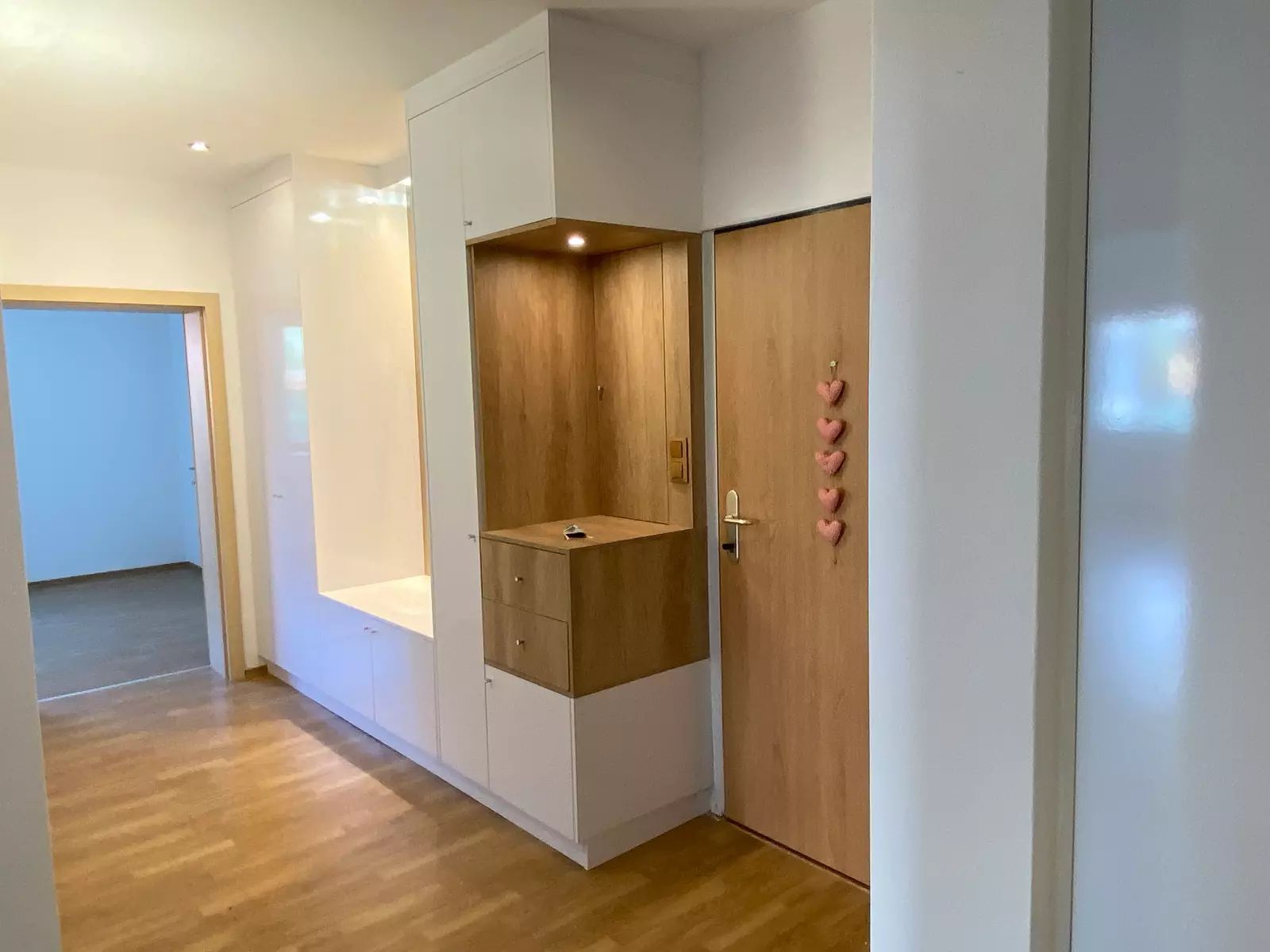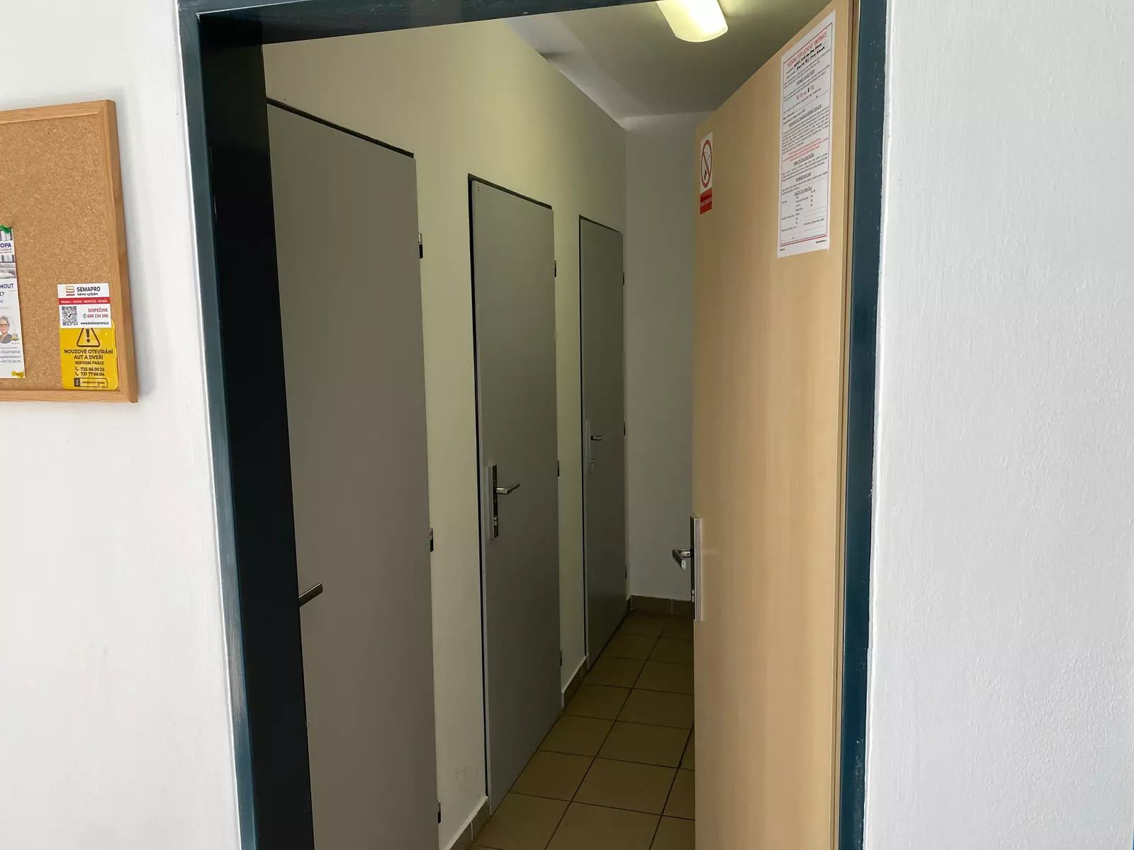 Kuchyň je vybavená kuchyňskou linkou s vestavěnými spotřebiči včetně lednice, tak jak vidíte na fotografiích. V koupelně je umístěn plynový kotel, vana a WC. V bytě je navíc i samostatná toaleta. V prostorné chodbě jsou skříně s úložnými prostory. Bezbariérový byt má všechny interiérové dveře o velikosti 90 cm. Venkovní prostor bytu je snímán kamerovým systémem.