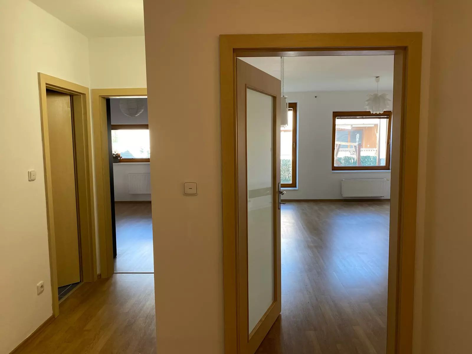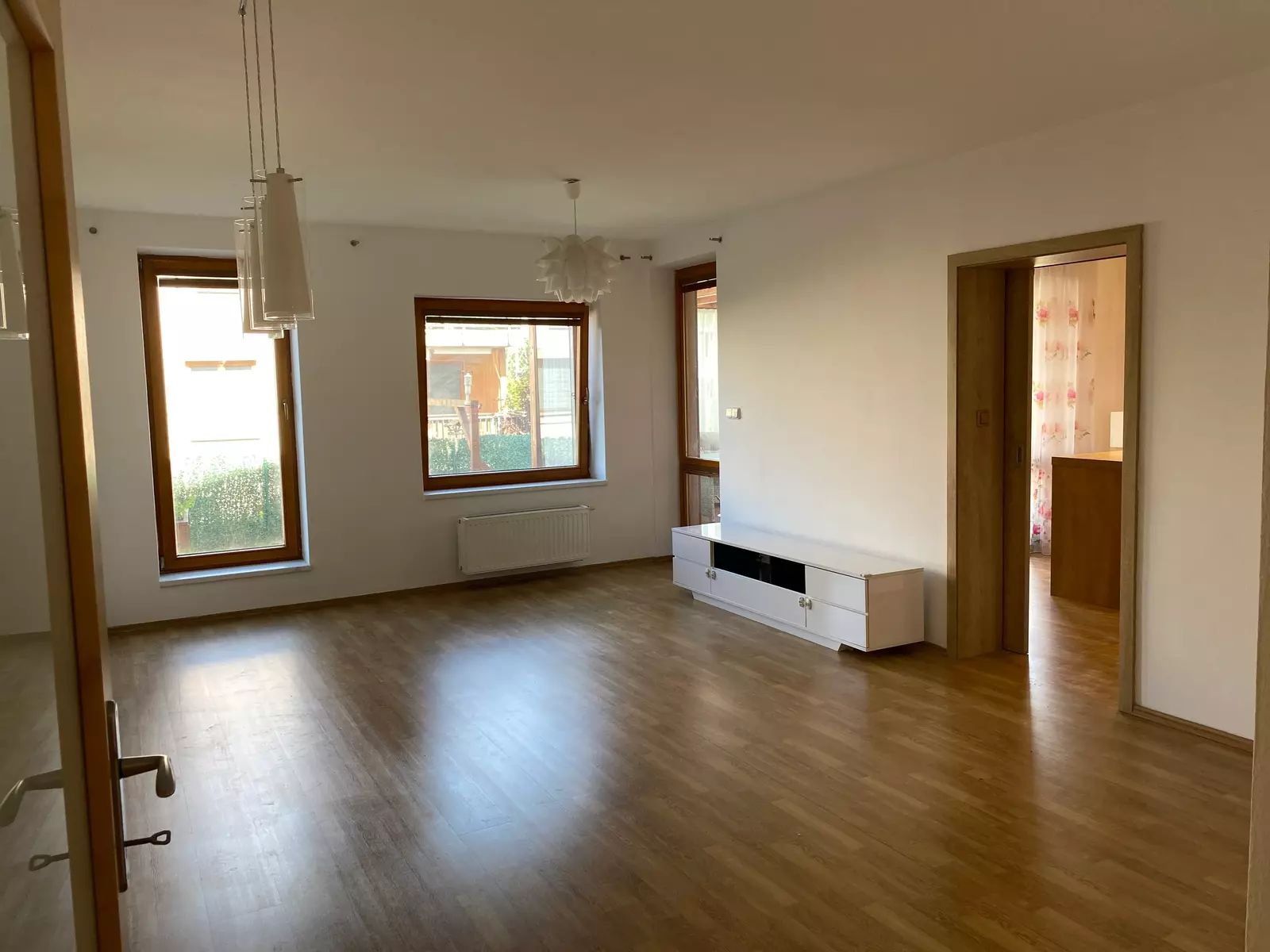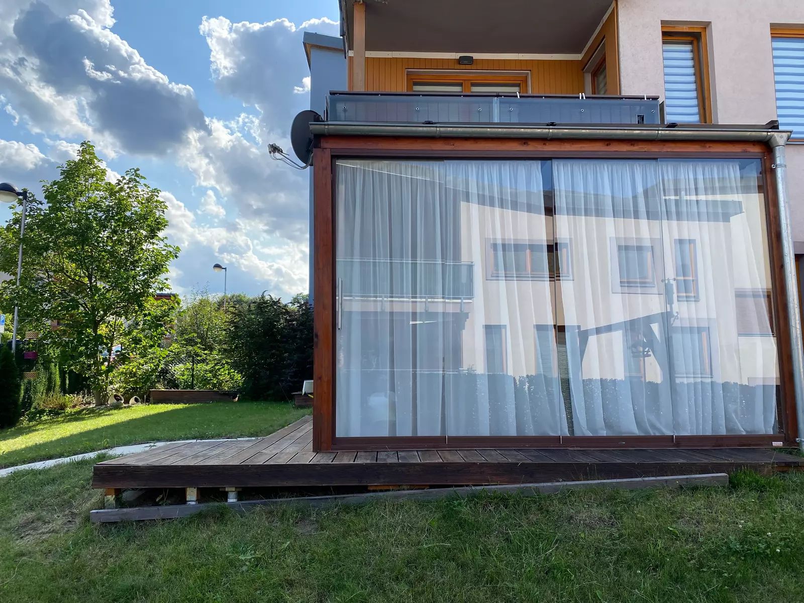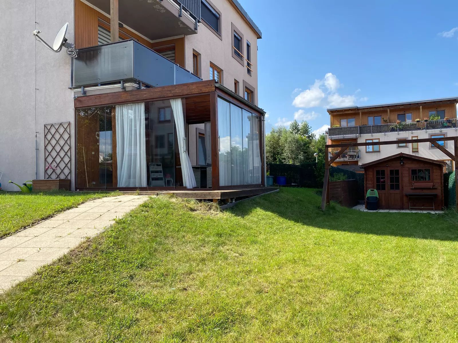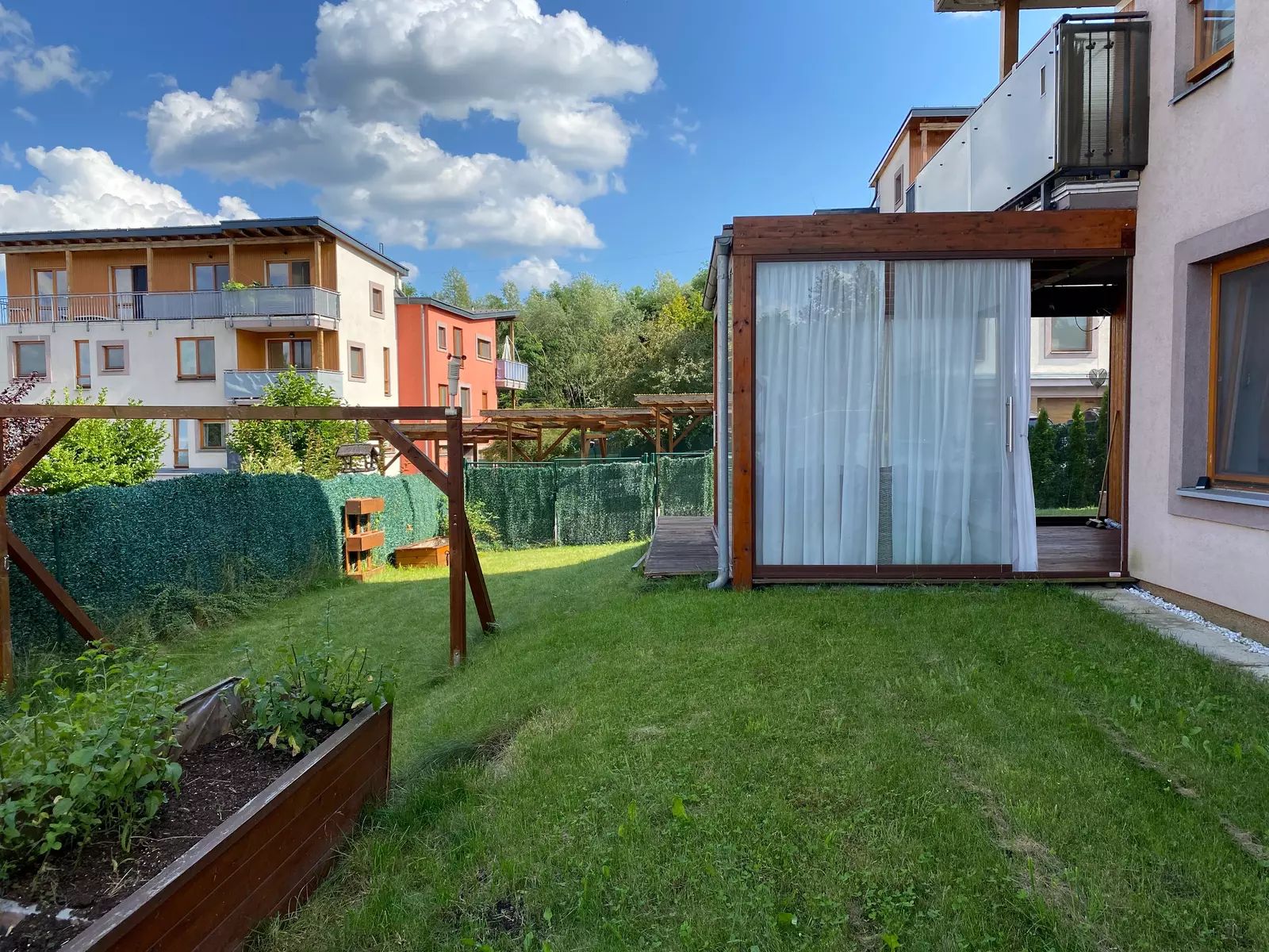 Prostorný byt o velikosti podlahové plochy 95,42 m2 v osobním vlastnictví s dispozicí 3+1 v 1.NP s bezbariérovým přístupem. Součástí bytu je zastřešená a prosklená pergola (14 m2) s možností otevření třech posuvných skleněných stěn a možností téměř celoročního užívání.