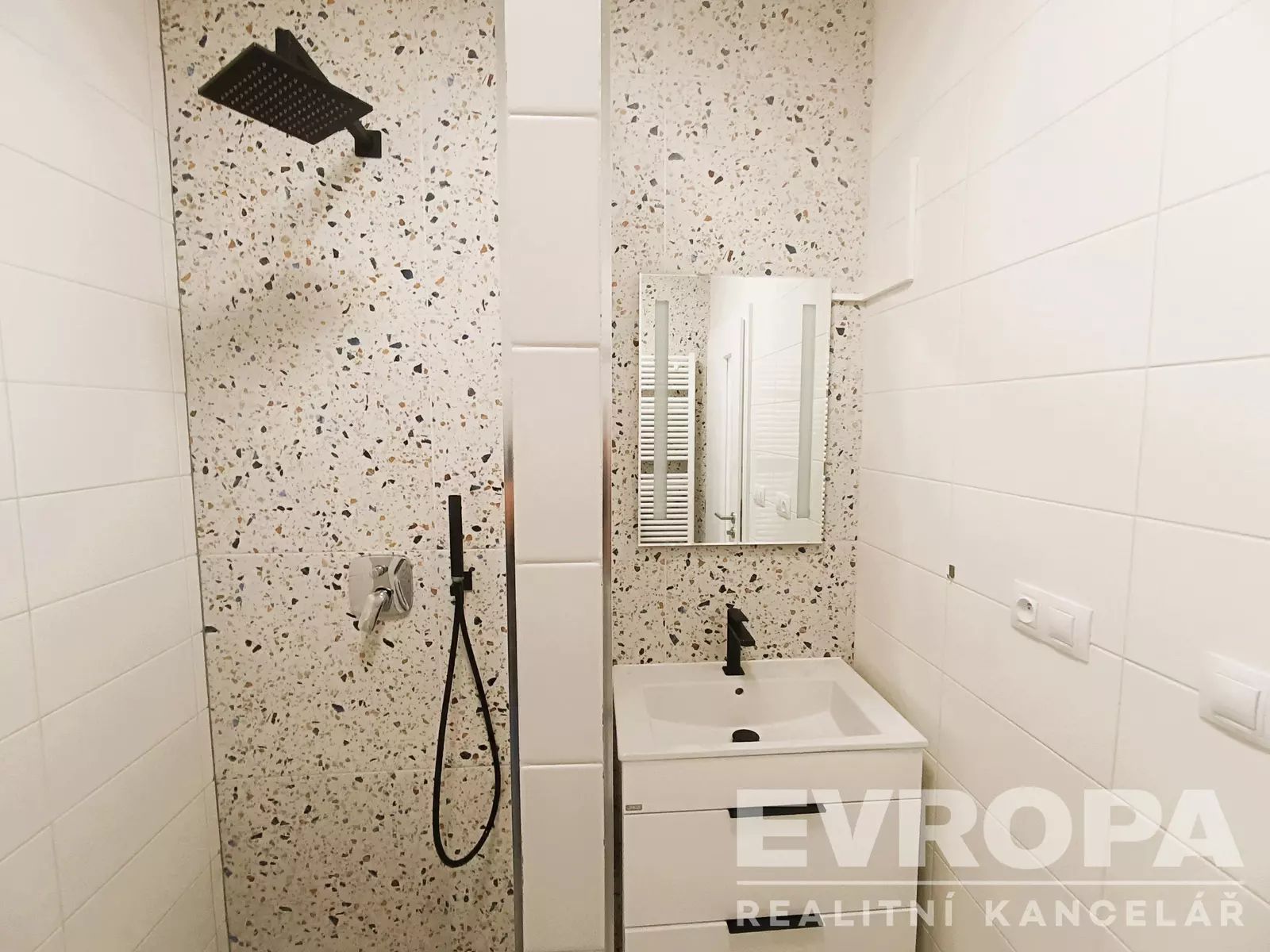 Za vstupními dveřmi je předsíň, ze které se vchází do koupelny se sprchovým koutem a toaletou, kuchyně a dále do obývacího pokoje. Kuchyňská linka je plně vybavena vestavěnými spotřebiči (el. sporák s trobou a sklokeramickou deskou - indukce, myčka, lednice s mrazákem). V obývacím pokoji a kuchyni je na podlaze lepený vinil, v předsíni koberec s krátkým chlupem a v koupelně dlažba.