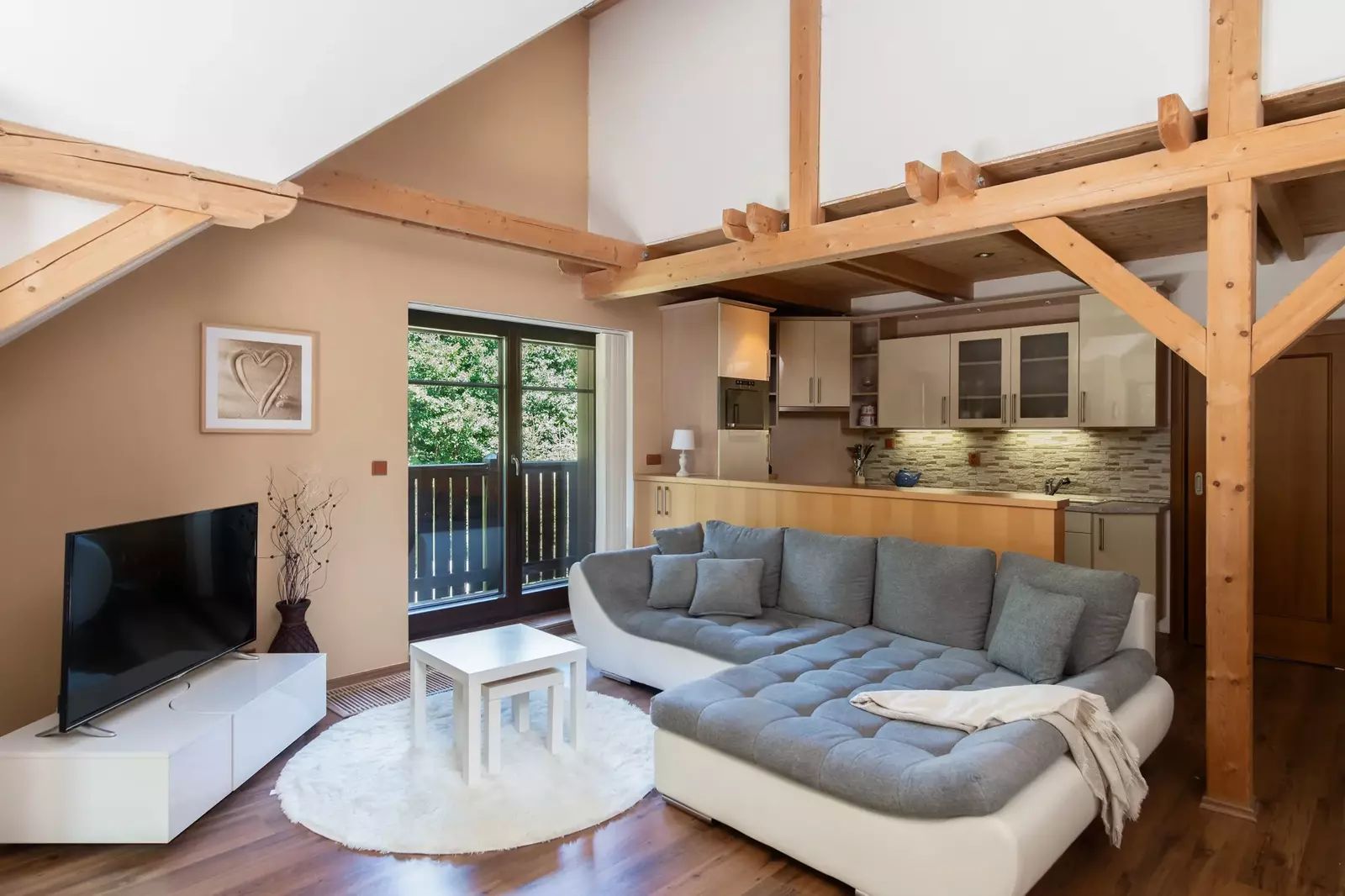 V pravé části domu se s vlastním vstupem nachází bytová jednotka o dispozici 5+kk s vlastním vstupem. V prvním nadzemní podlaží se nachází vstupní prostorná hala, 2 pokoje s vlastním sociálním zařízením, technická místnost a prostorná šatna. Ve 2.NP bytu majitele je velmi dobře řešený prostorný obývací pokoj, s jídelnou a kuchyňským koutem s východem na terasu, ložnice a koupelna. V podkroví je poslední pokoj se sociálním zařízením a úložným prostorem - šatnou. Tato přístavba domu byla realizována v roce 2007-2008.
