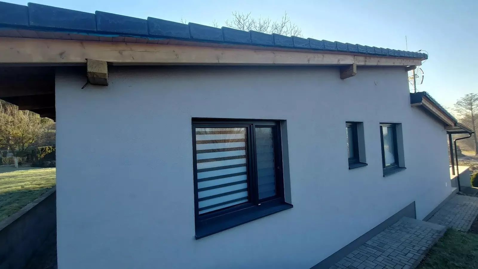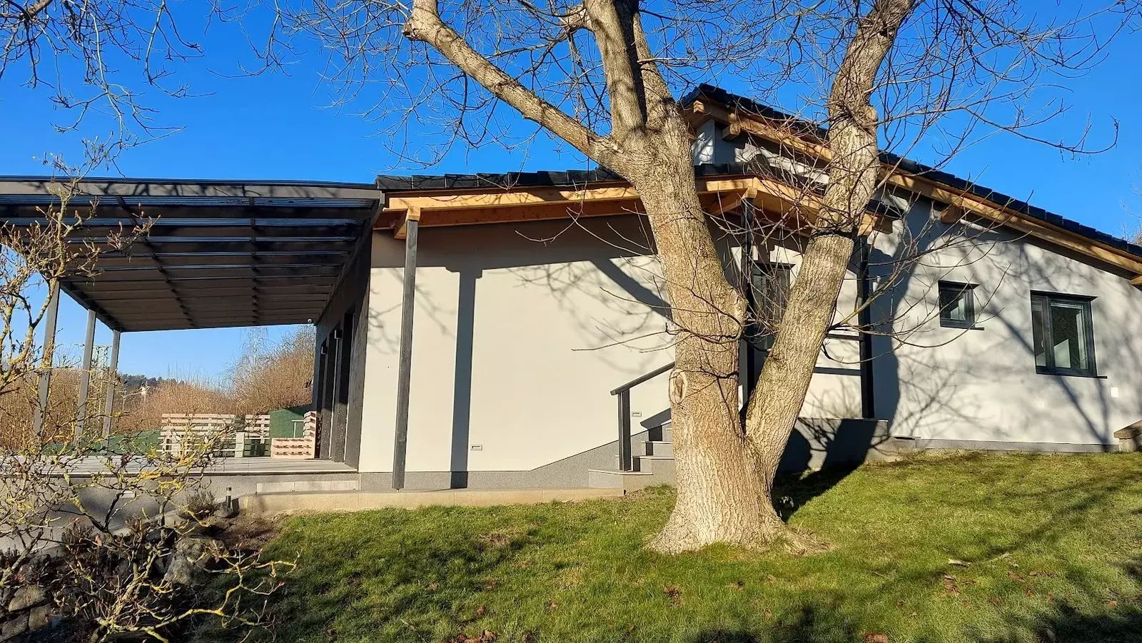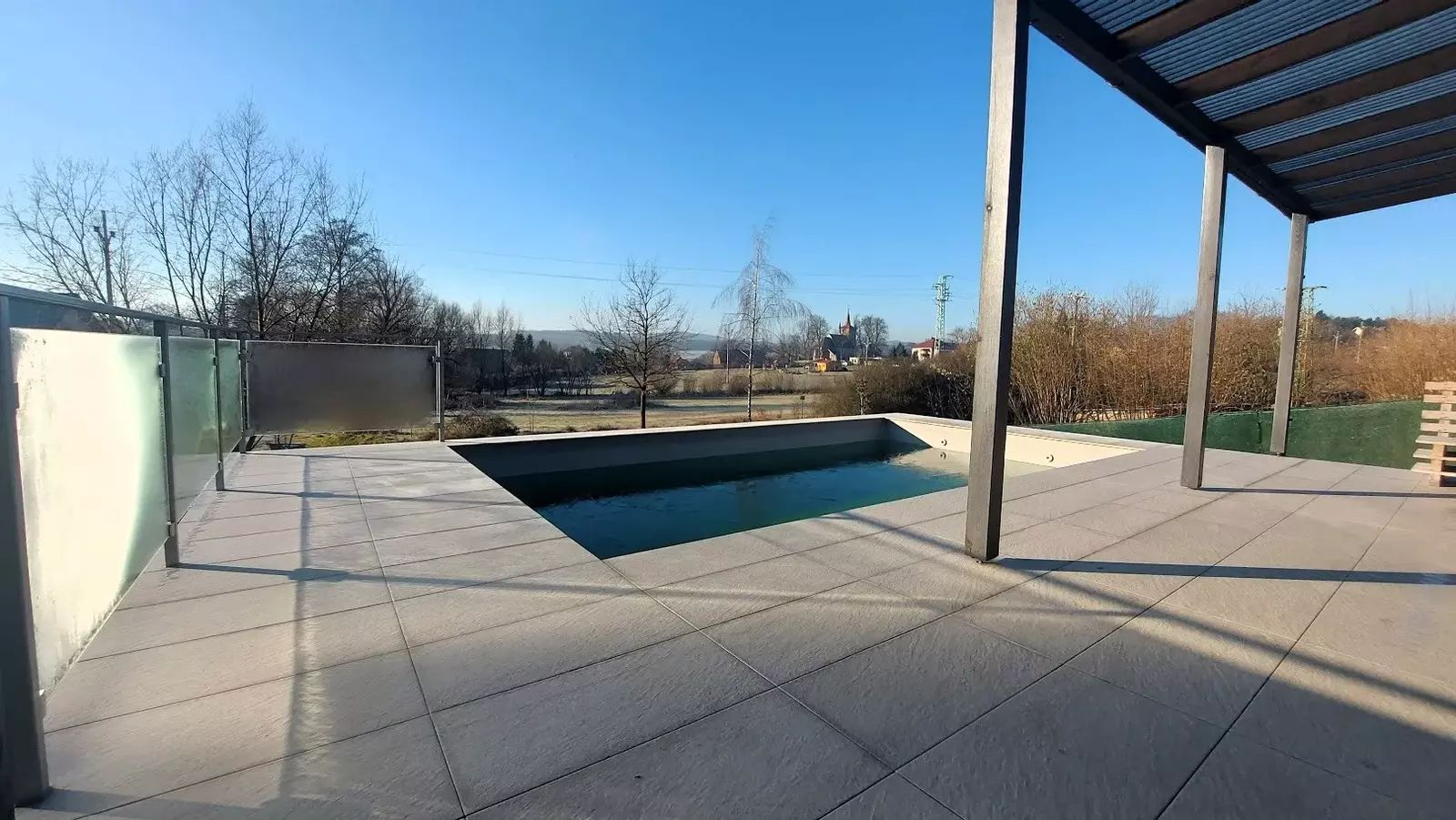 Moderní rodinný dům postavený před 4mi lety, dispozice 4+kk, vnitřní plocha domu je 98m2 plus zastřešená terasa 28m2, která je zakončena zapuštěným bazénem 25m2 a hloubkou 1,5m. K domu dále patří prostorná zahrada o rozloze 1025 m2. Dům má tři oddělené pokoje (ložnice), obytnou velkou obývací místnost s kuchyňským koutem, veškeré místnosti odděluje chodba do L, dvě koupelny (sprchový kout s dvojumyvadlem+ vana s umyvadlem), 2 WC. V domě zůstává moderní vybavená kuchyň na míru zn. SYKORA se spotřebiči v pořizovací hodnotě cca 0,5 milionu Kč a veškeré technologické zázemí domu i bazénu, celý dům je podlahově vytápěn a má izolační trojskla. Dům byl stavěn pro vlastní potřebu majitelů a na provedení to je na první pohled vidět. Energetická náročnost (PENB B).