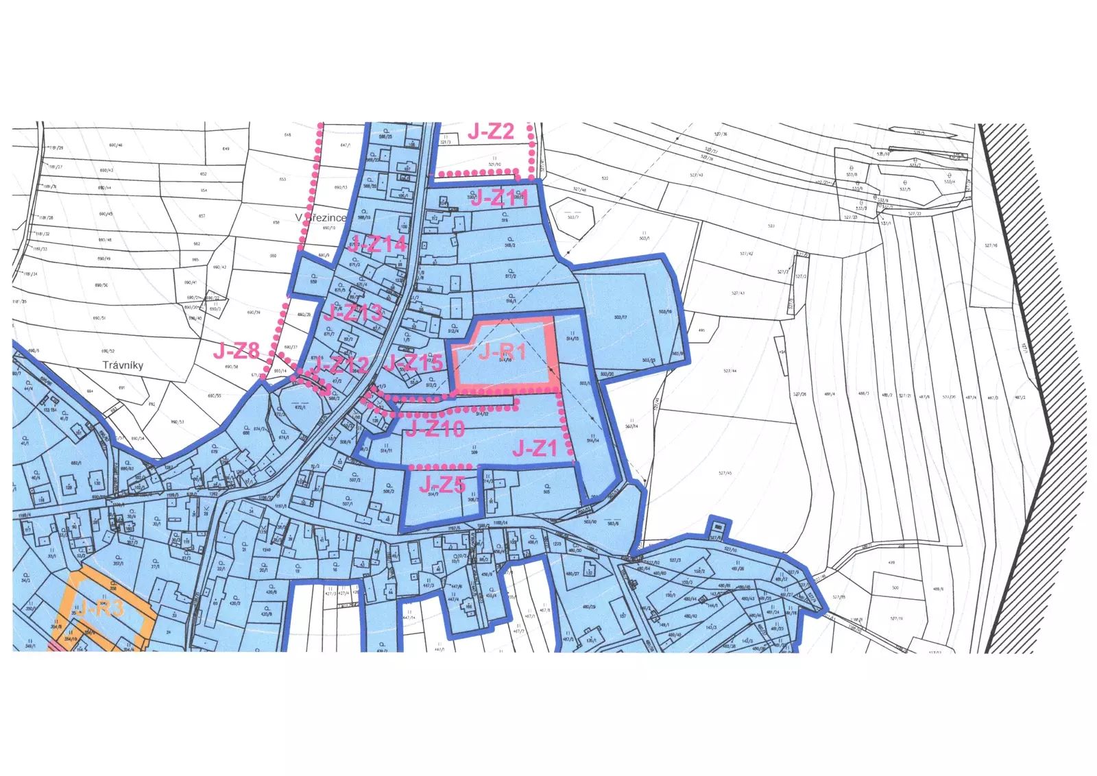 Územní plán umožňuje výstavbu izolovaných rodinných domů a dvojdomů na pozemcích 600-1500m2, ale také řadové RD na pozemcích min. 350m2. Výšková regulace zástavby je max. 1-2 nadzemní podlaží + podkroví. Hlavní využití plochy je tedy pro bydlení v rodinných domech s ohrazenou okrasnou a rekreačně pobytovou zahradou. Přípustné využití je pro stavby doplňkové (garáže, parkovací přístřešky, altány, bazény a další), nerušící komerční služby provozované v RD, ubytování v RD formou penzionu, veřejná prostranství a zeleň + související infrastruktura. Část pozemku (J-Z10) je plánovaná jako příjezdová cesta pro lokalitu s plánovanou zástavbou s vyústěním na stávající komunikaci procházející zastavěným územím. K lokalitě je vydána územně plánovací informace, vydal Městský úřad Blovice, odbor stavební a dopravní. Zašleme na vyžádání.
