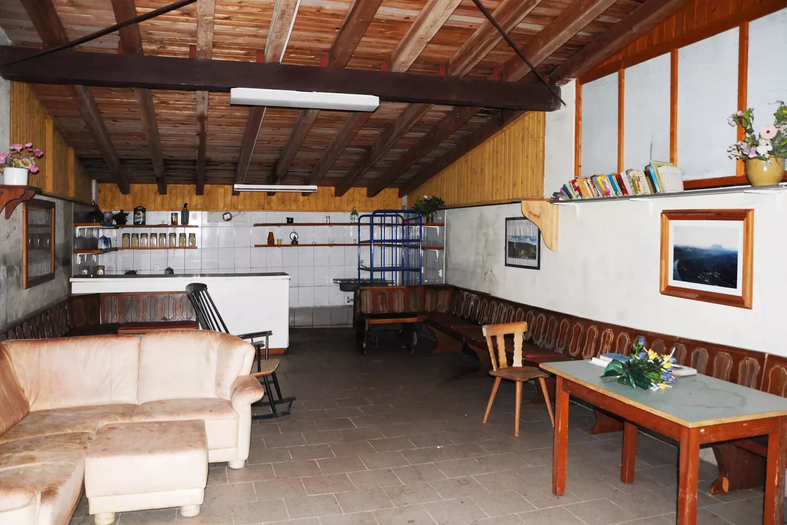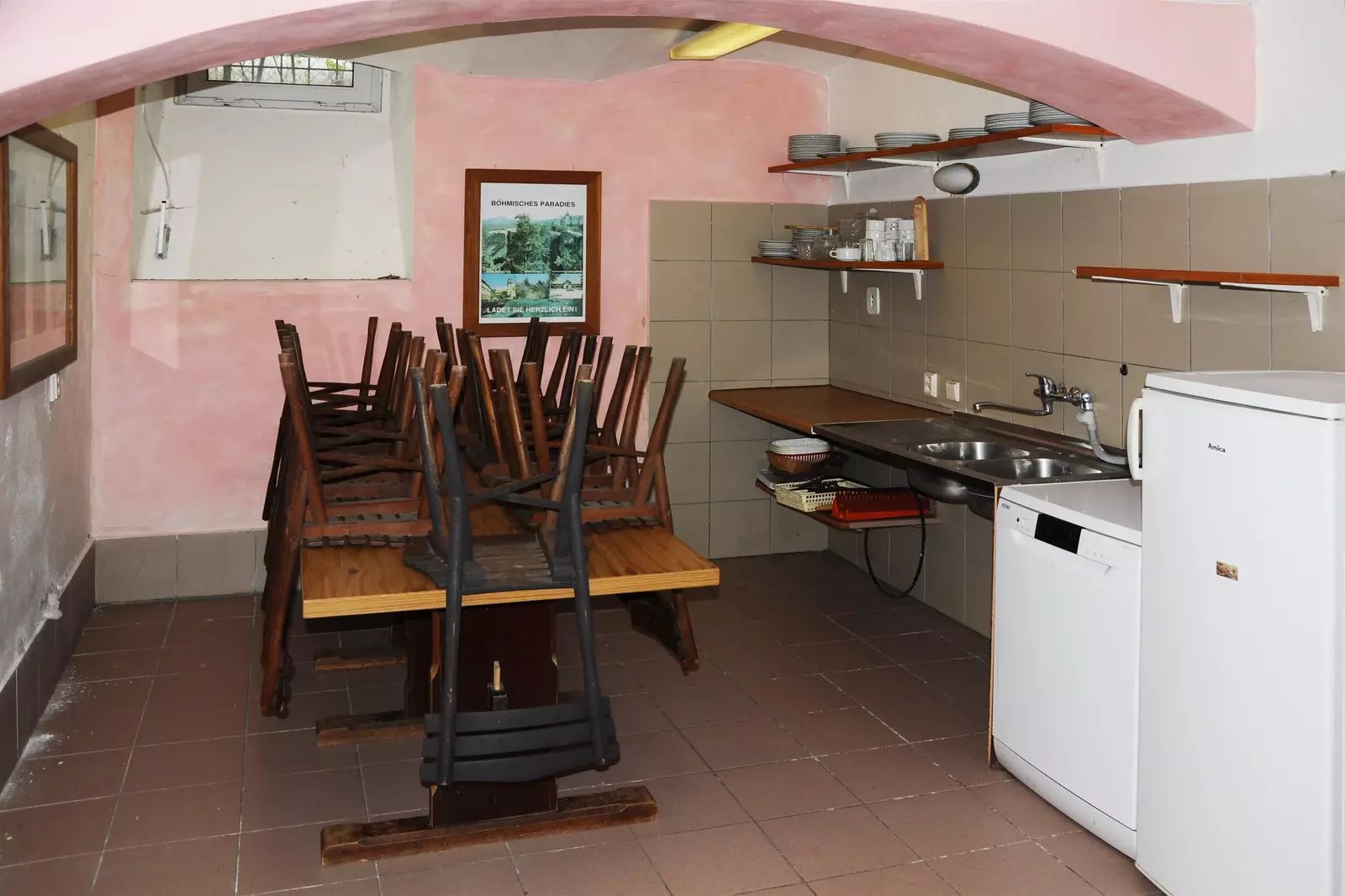 Suterén: kuchyň pro hosty (lednice, mikrovlnná trouba, varná konvice, sporák a další vybavení, 2x klubovna s TV.