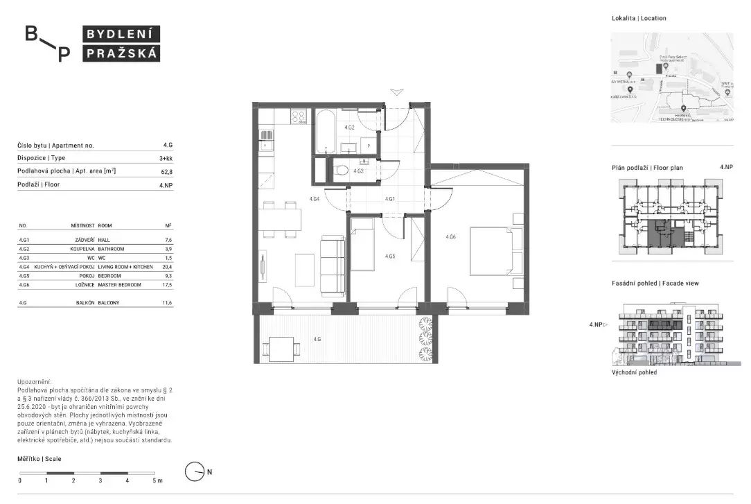 Disp.: zádveří 7,6 m2, koupelna 3,9 m2, WC 1,5 m2, kuchyň a obývací pokoj 20,4 m2, pokoj 9,3 m, ložnice 17,5 m2, balkon 11,6 m2.