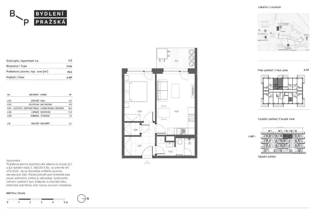 Byt se nachází ve 4.NP s výtahem. Byt o dispozici 2+kk s plochou 44,6 m2 a balkonem o velikosti 6,1 m2. Byt je umístěn na Z.