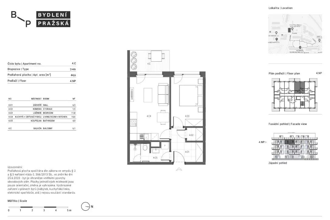 Byt se nachází ve 4.NP s výtahem. Byt o dispozici 2+kk s plochou 44,6 m2 a balkonem o velikosti 6,1 m2. Byt je umístěn na Z.