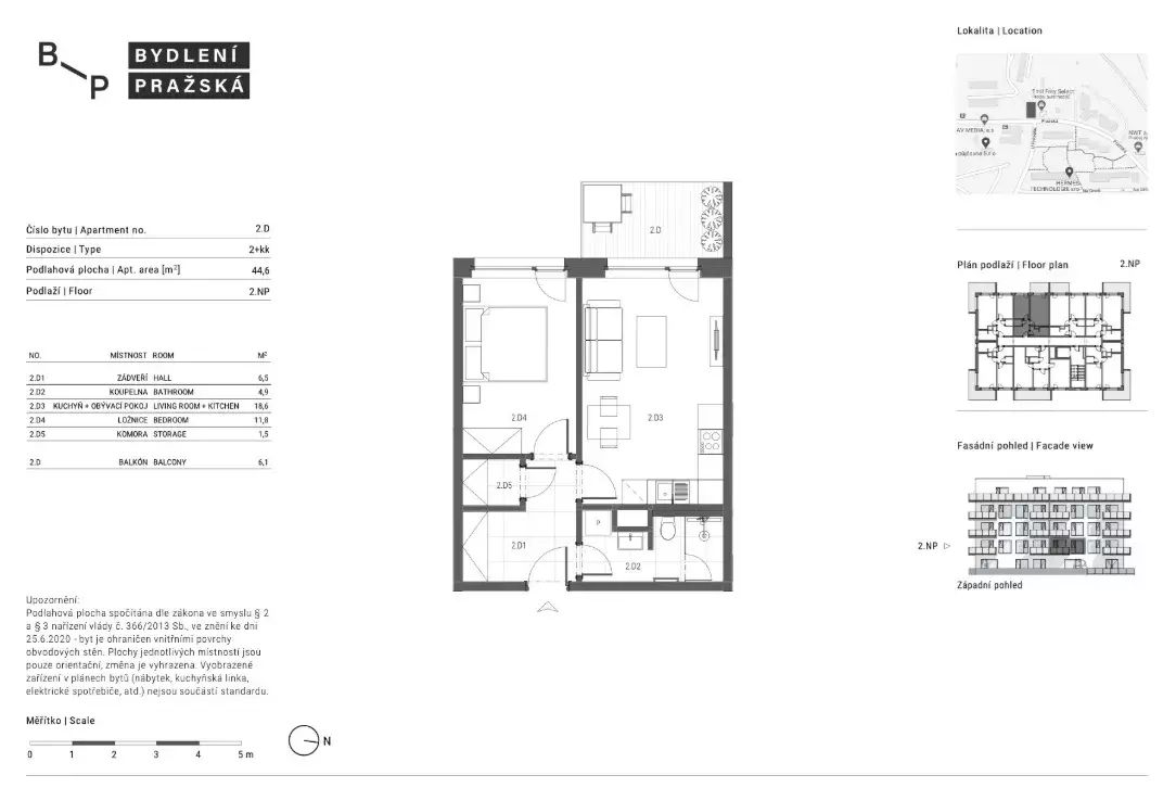 Byt se nachází ve 2.NP s výtahem. Byt o dispozici 2+kk s plochou 44,6 m2 a balkónem o velikosti 6,1 m2. Byt je umístěn na Z.