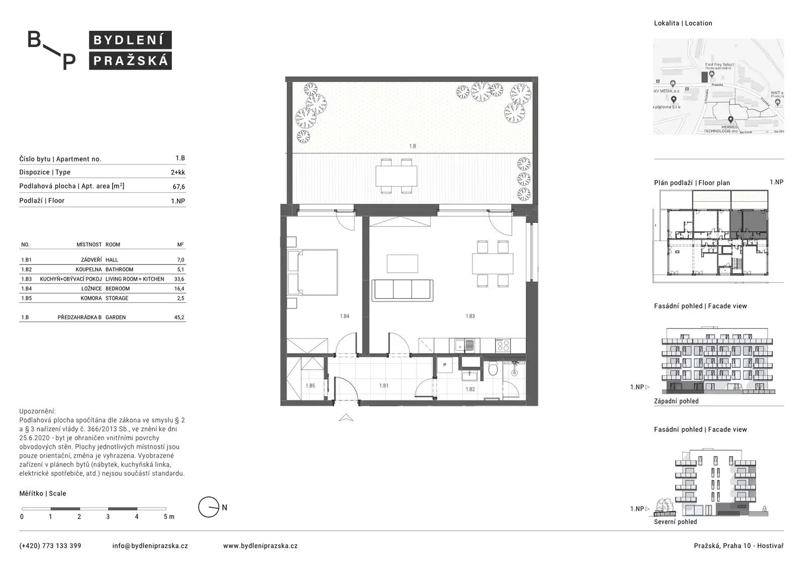 Byt se nachází ve 1.NP s výtahem. Byt o dispozici 2+kk s plochou 67,6 m2 a předzahrádkou o velikosti 45,2 m2. Byt je umístěn na S,Z.