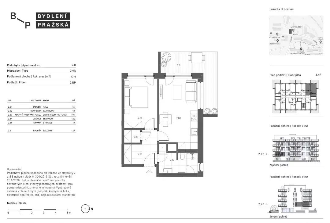 Byt se nachází ve 2.NP s výtahem. Byt o dispozici 2+kk s plochou 47,4 m2 a balkonem o velikosti 12,8 m2. Byt je umístěn na S,Z.