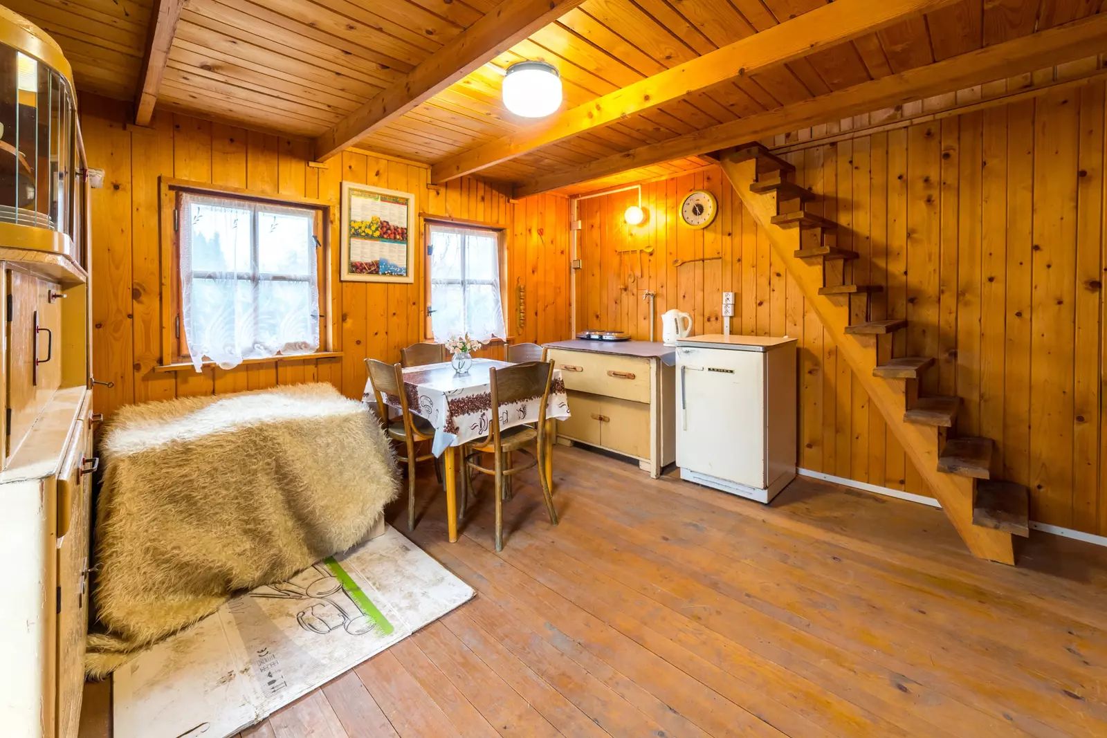 Dřevěná chata stojí na zděných základech.