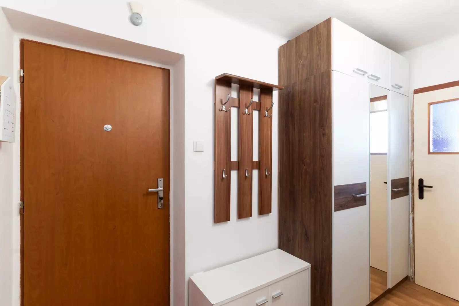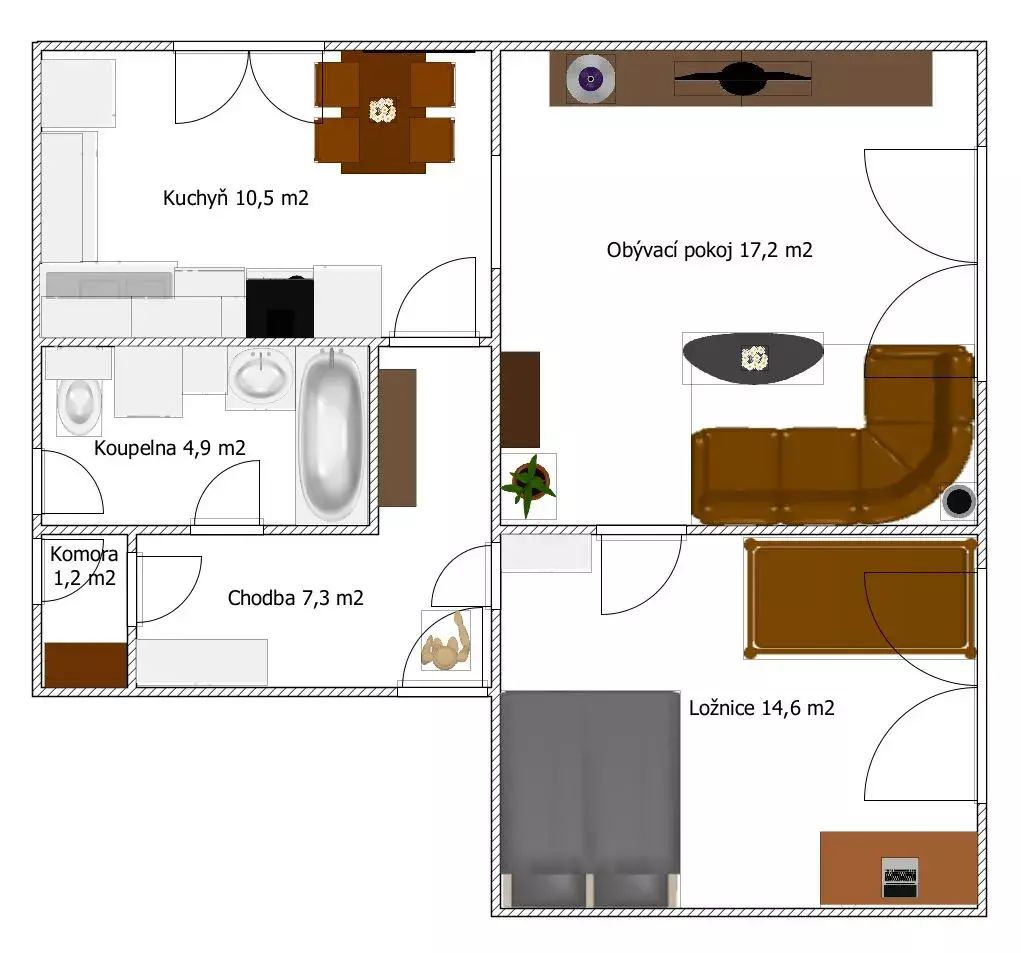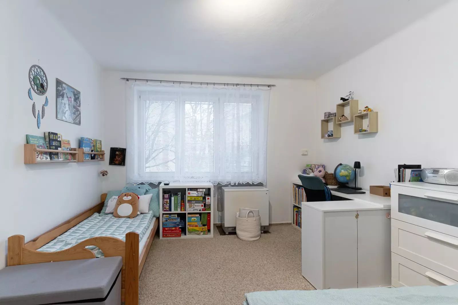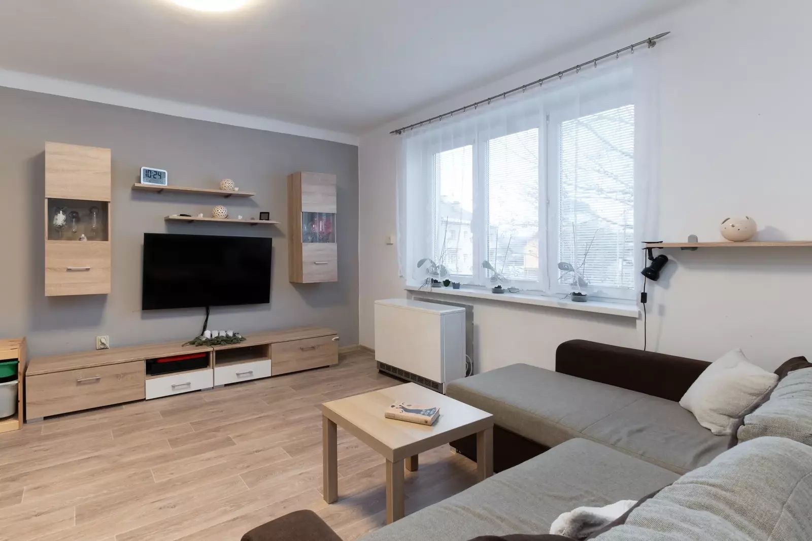 Za vstupními dveřmi do bytu je chodba (7,3 m2), ze které se vchází do koupelny s vanou a toaletou (4,9 m2), komory (1,2 m2) a kuchyně (10,5 m2), dále do obývacího pokoje (17,4 m2), který je průchozí do ložnice (14,6 m2). K bytu náleží dva sklepy (1,9 a 6,2 m2). Byt je po částečné rekonstrukci tzn. nové rozvody elektřiny (měď), vody i odpadů (plast). Podlahová krytina je lino, koberce, mimo koupelny, kde je dlažba. Okna jsou plastová s dvojskly a směrují na jihozápad a severovýchod. K dispozici je kabelová televize a rychlý internet na optice. Byt se prodává včetně kuchyňské linky na míru a vestavných spotřebičů. Součástí společných prostor je kolárna a sušárna v suterénu.