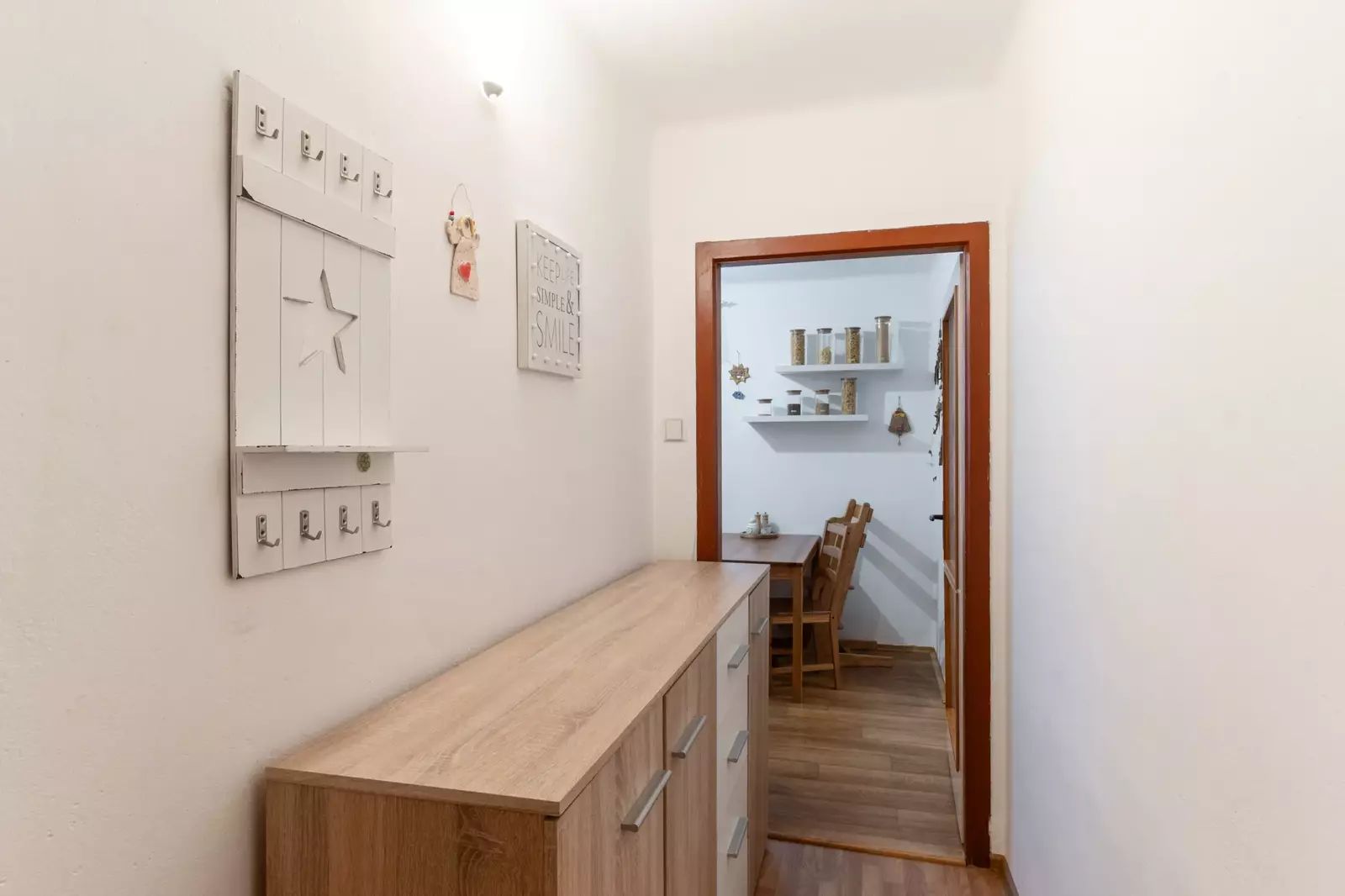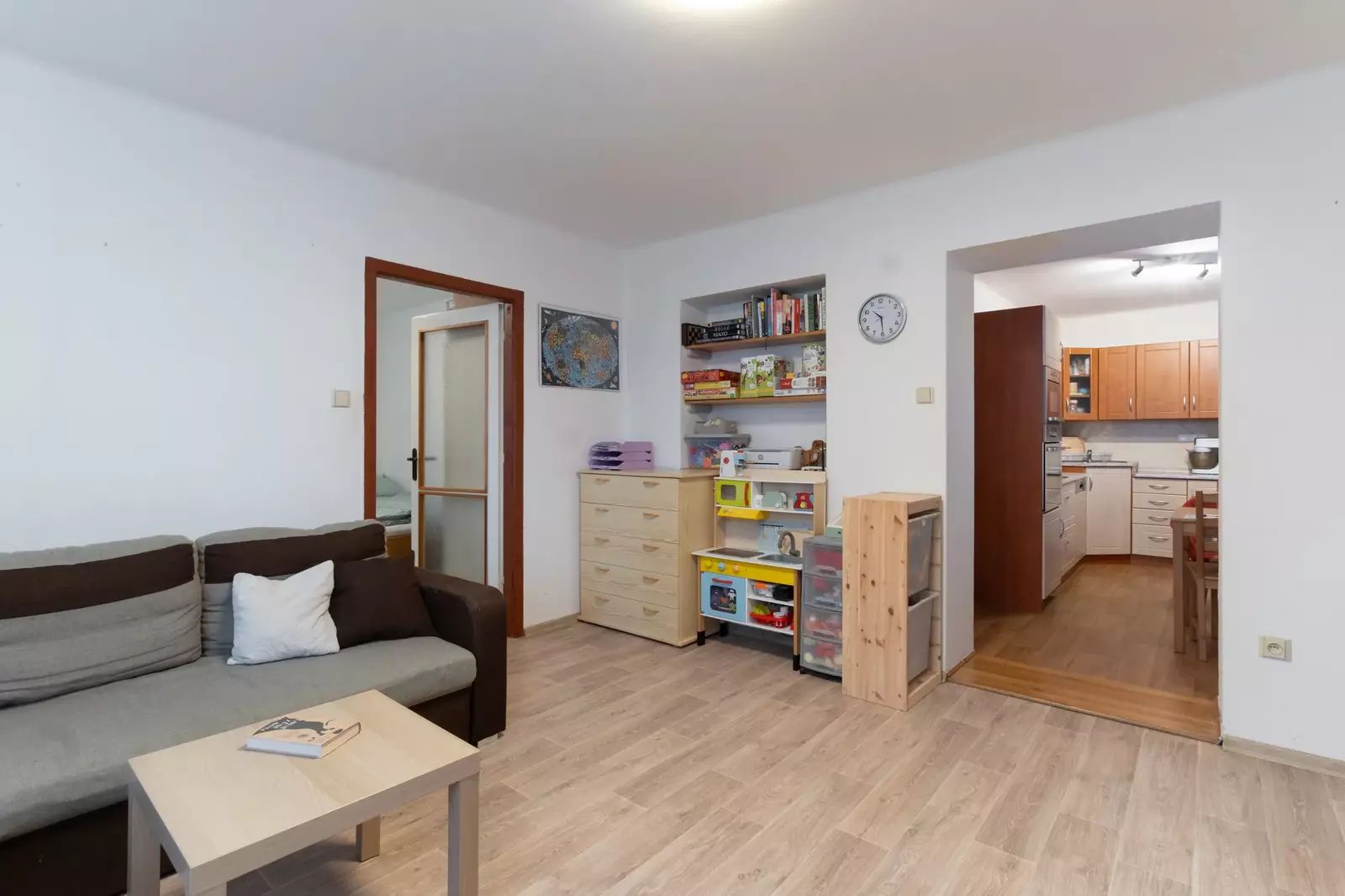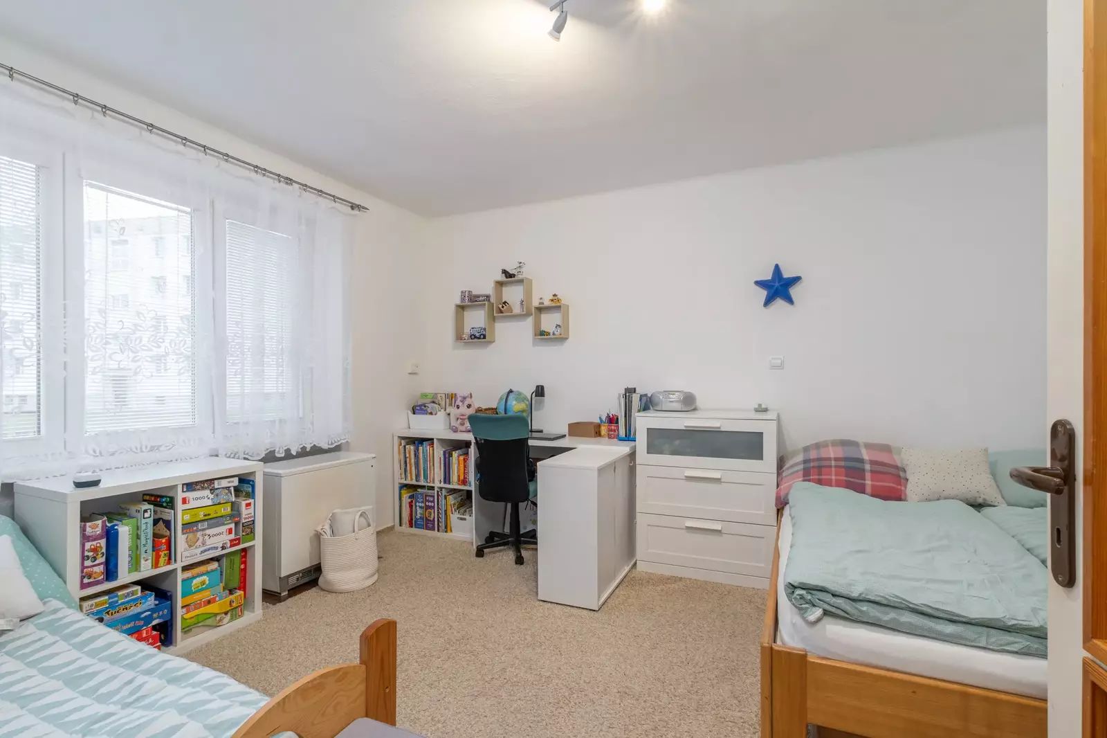 Za vstupními dveřmi do bytu je chodba (7,3 m2), ze které se vchází do koupelny s vanou a toaletou (4,9 m2), komory (1,2 m2) a kuchyně (10,5 m2), dále do obývacího pokoje (17,4 m2), který je průchozí do ložnice (14,6 m2). K bytu náleží dva sklepy (1,9 a 6,2 m2). Byt je po částečné rekonstrukci tzn. nové rozvody elektřiny (měď), vody i odpadů (plast). Podlahová krytina je lino, koberce, mimo koupelny, kde je dlažba. Okna jsou plastová s dvojskly a směrují na jihozápad a severovýchod. K dispozici je kabelová televize a rychlý internet na optice. Byt se prodává včetně kuchyňské linky na míru a vestavných spotřebičů. Součástí společných prostor je kolárna a sušárna v suterénu.