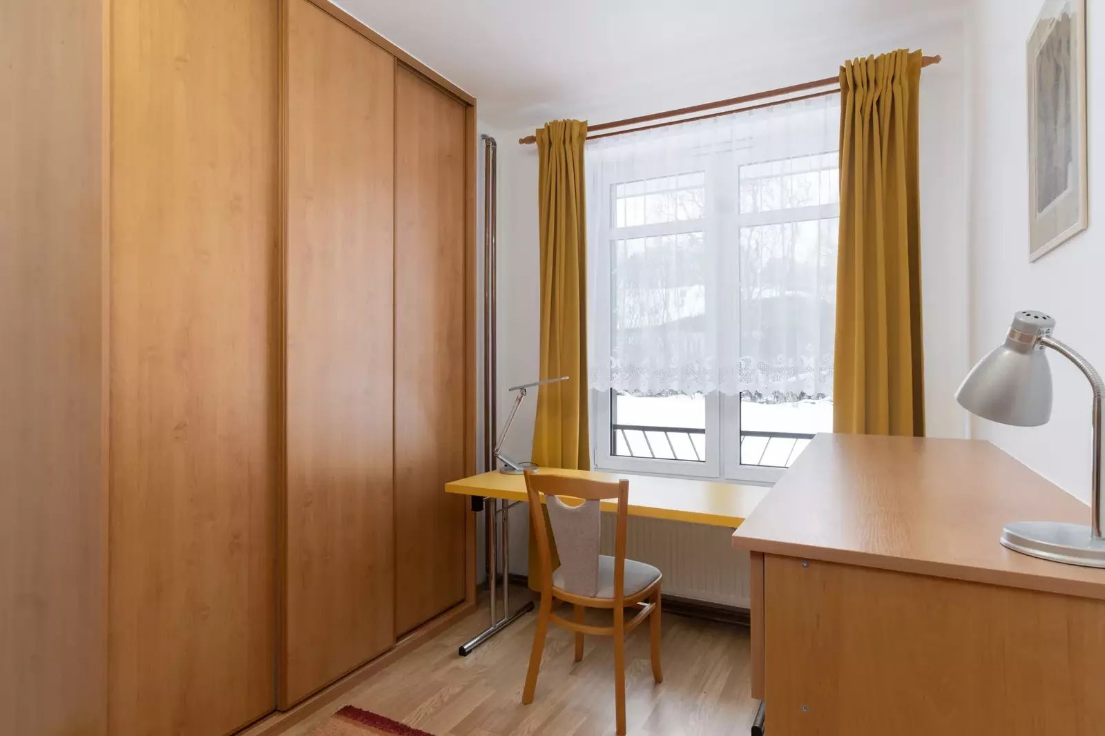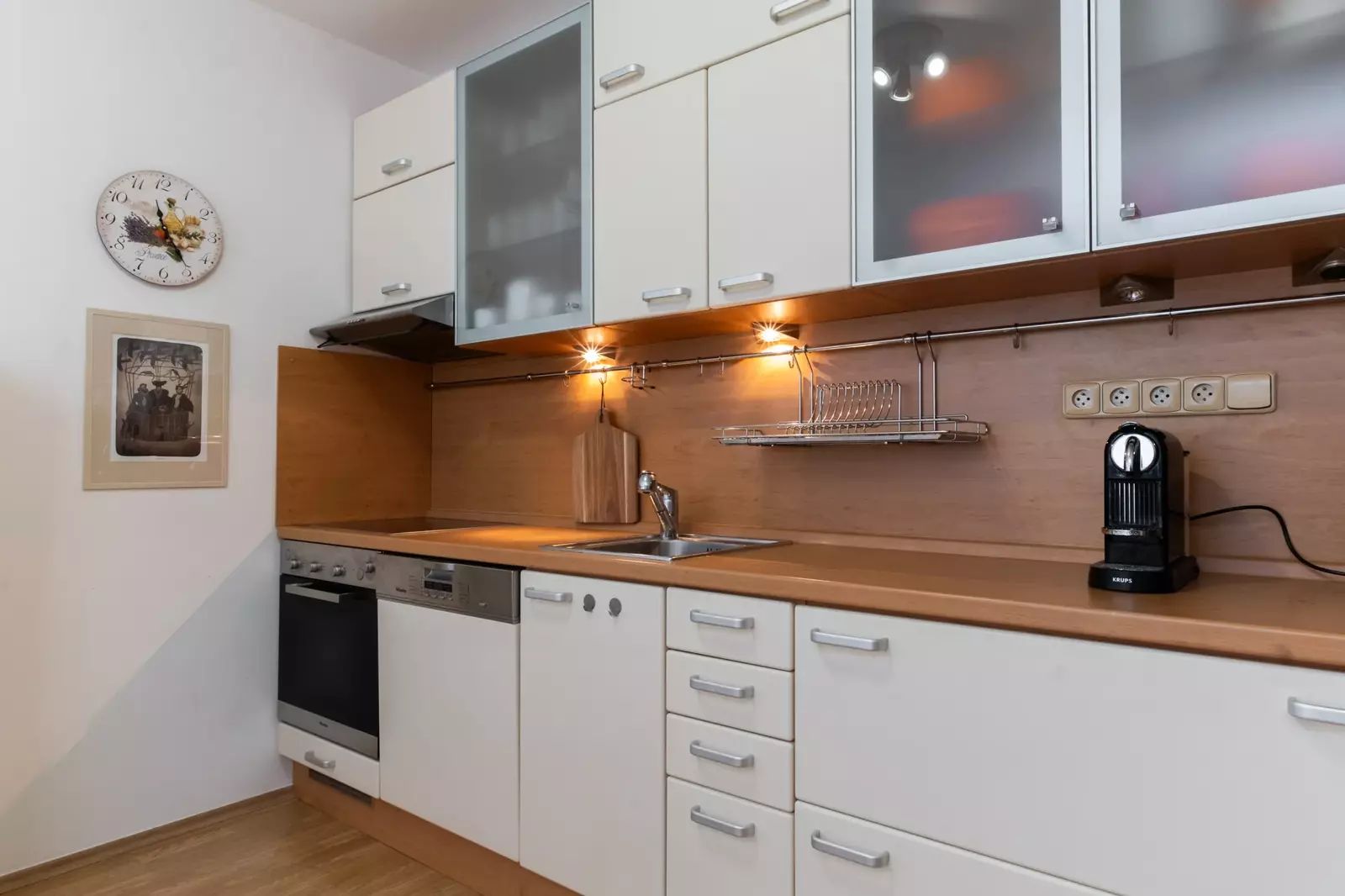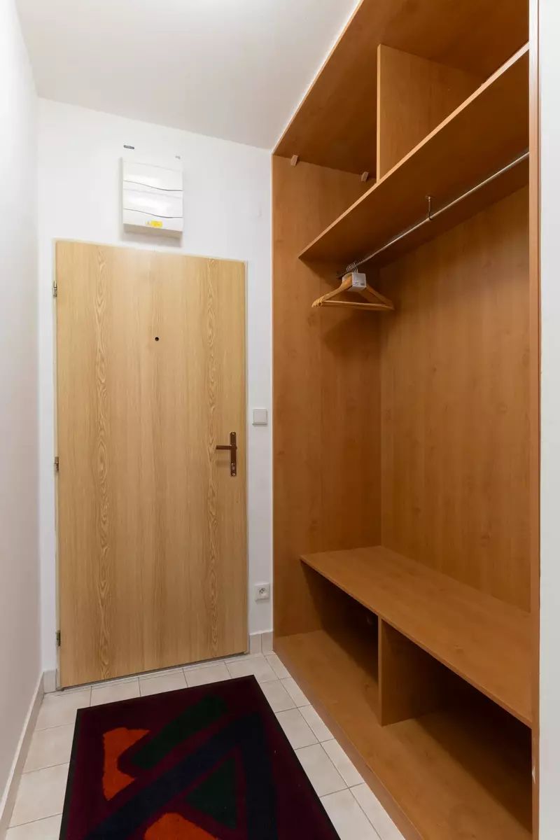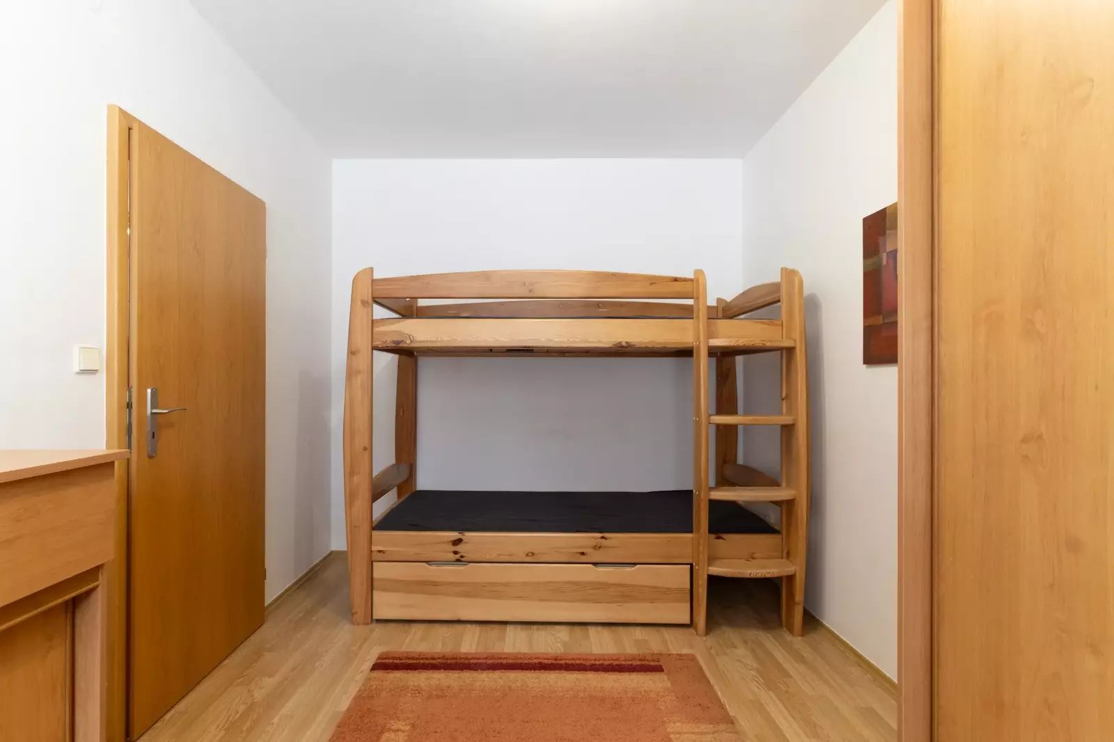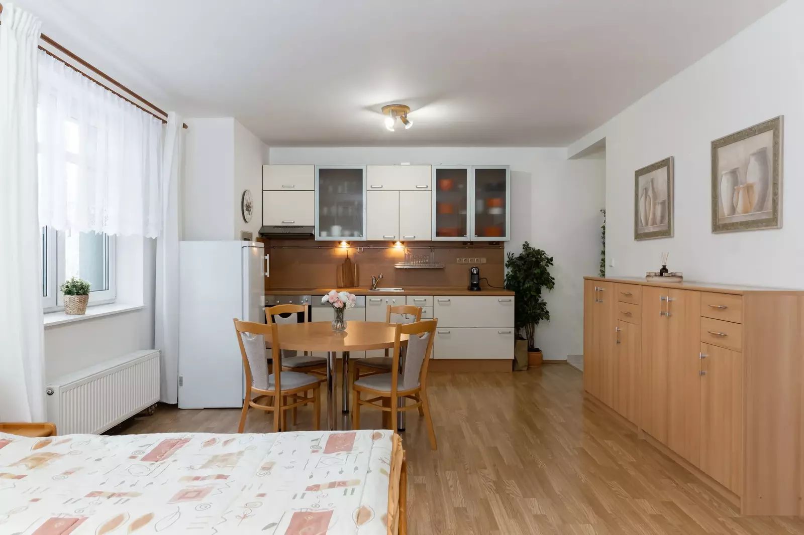 Dispozice bytu: ze vstupní chodby vcházíte do koupelny s WC, dále do prostorné ložnice s kuchyní, která je vybavena všemi potřebnými elektrospotřebiči, jako je lednice, myčka a plynový sporák s elektrickou troubou, dále vcházíte do pokoje s palandou.
