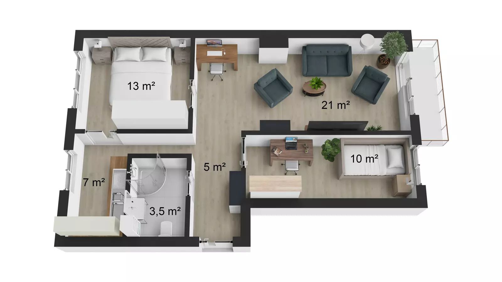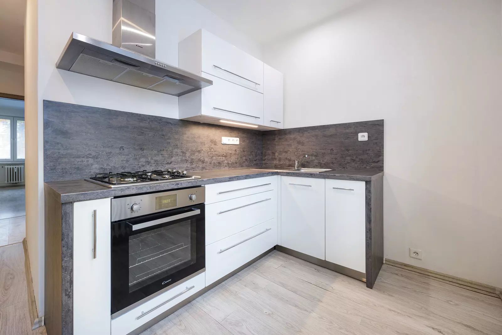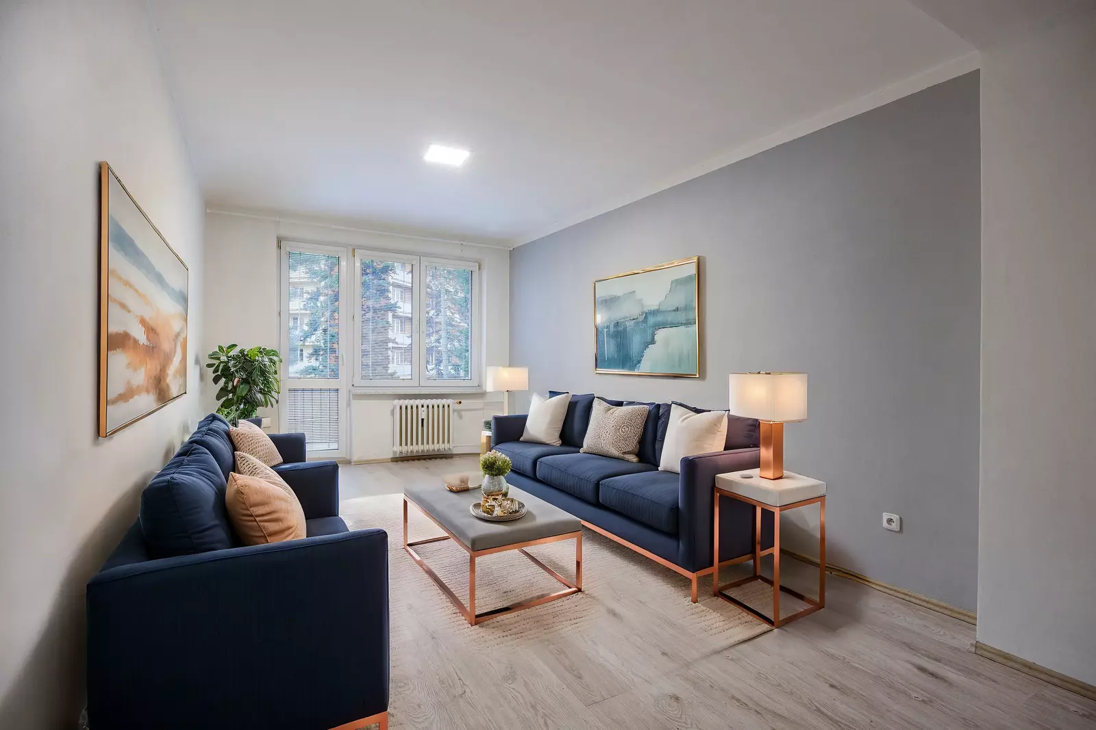 Interiér bytu je světlý s vysokými stropy o výšce 2,6 m, což zvyšuje pocit prostoru. Obývací pokoj je situován na východ. Vybavená kuchyně, včetně vestavěné elektrické trouby, plynové varné desky a volně stojící lednice. Byt disponuje balkonem o rozloze 3,15 m², který nabízí další místo pro relaxaci. Dále byt disponuje 2 sklepy (celkově 6 m²), které poskytují dostatek úložného prostoru.