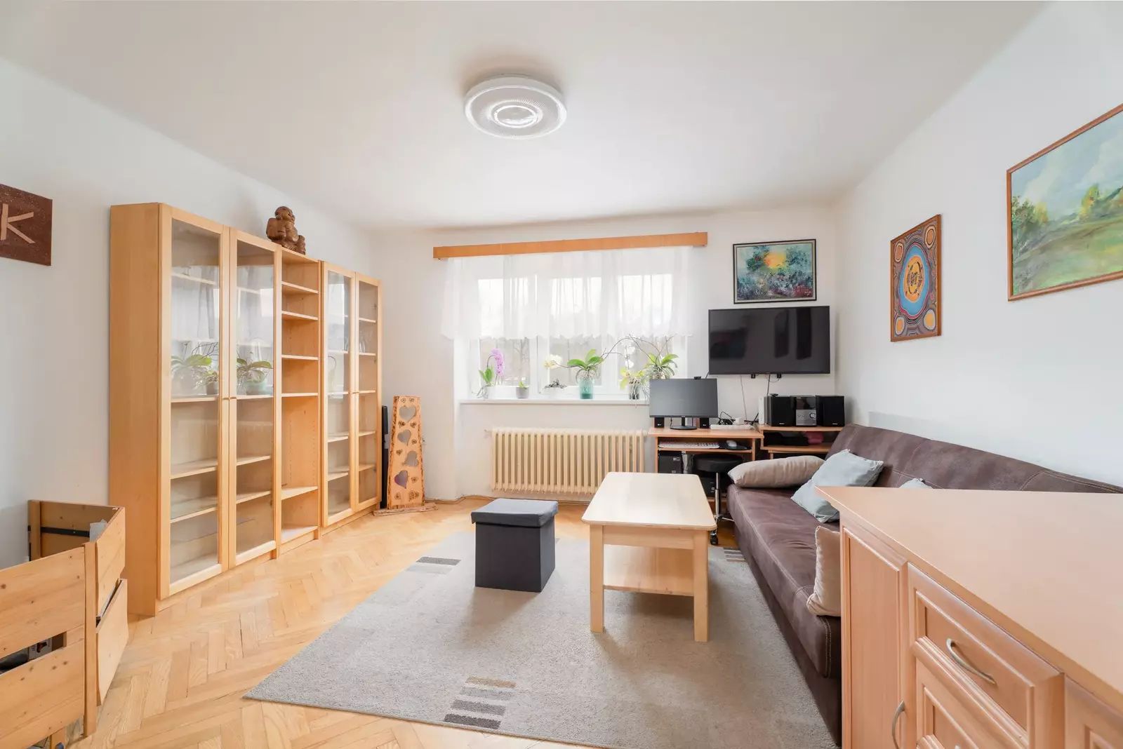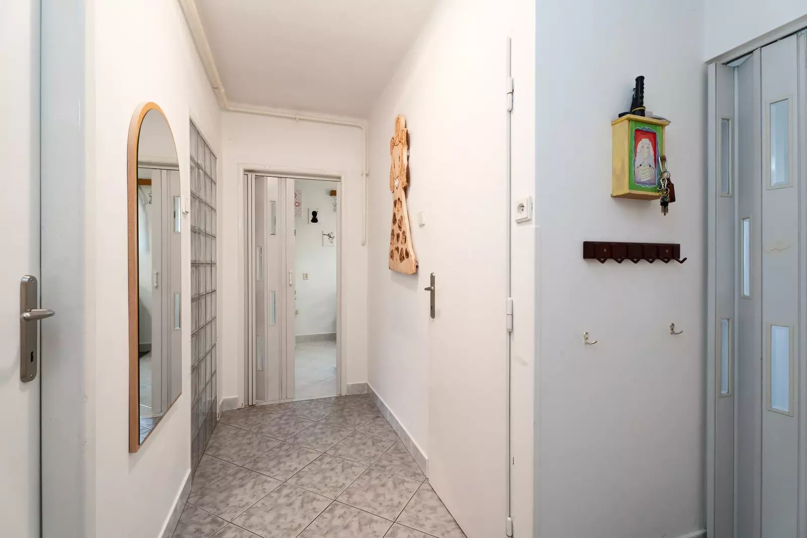 Dispozice bytu: centrální prostorná vstupní chodba ze které se postupně dostanete do malé pracovny/šatny, koupelny s WC, kuchyně s jídelnou, obývacího pokoje a ložnice se vstupem na balkón. Všechny pokoje jsou neprůchozí.