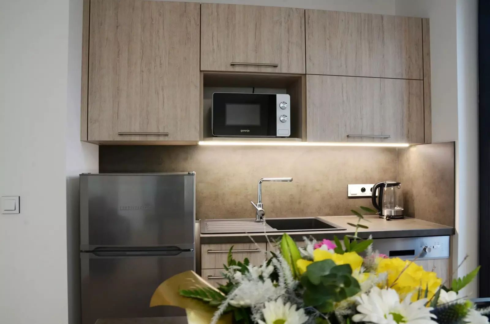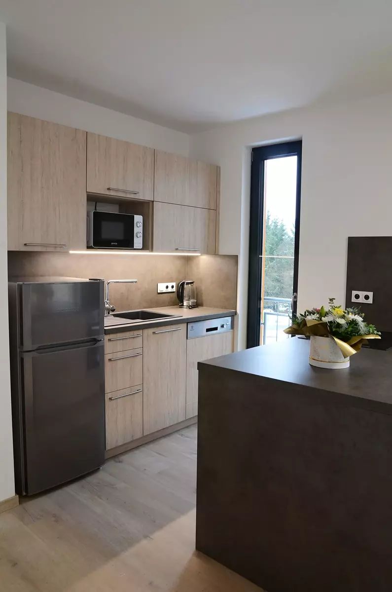 Dispozice apartmánu jsou obývací prostor s rozkládací pohovkou, jídelním stolem a moderní, plně vybavenou kuchyní s myčkou, 1 ložnice s manželskou postelí a koupelna se sprchovým koutem a toaletou.