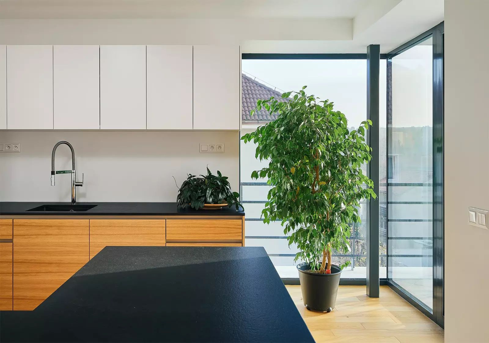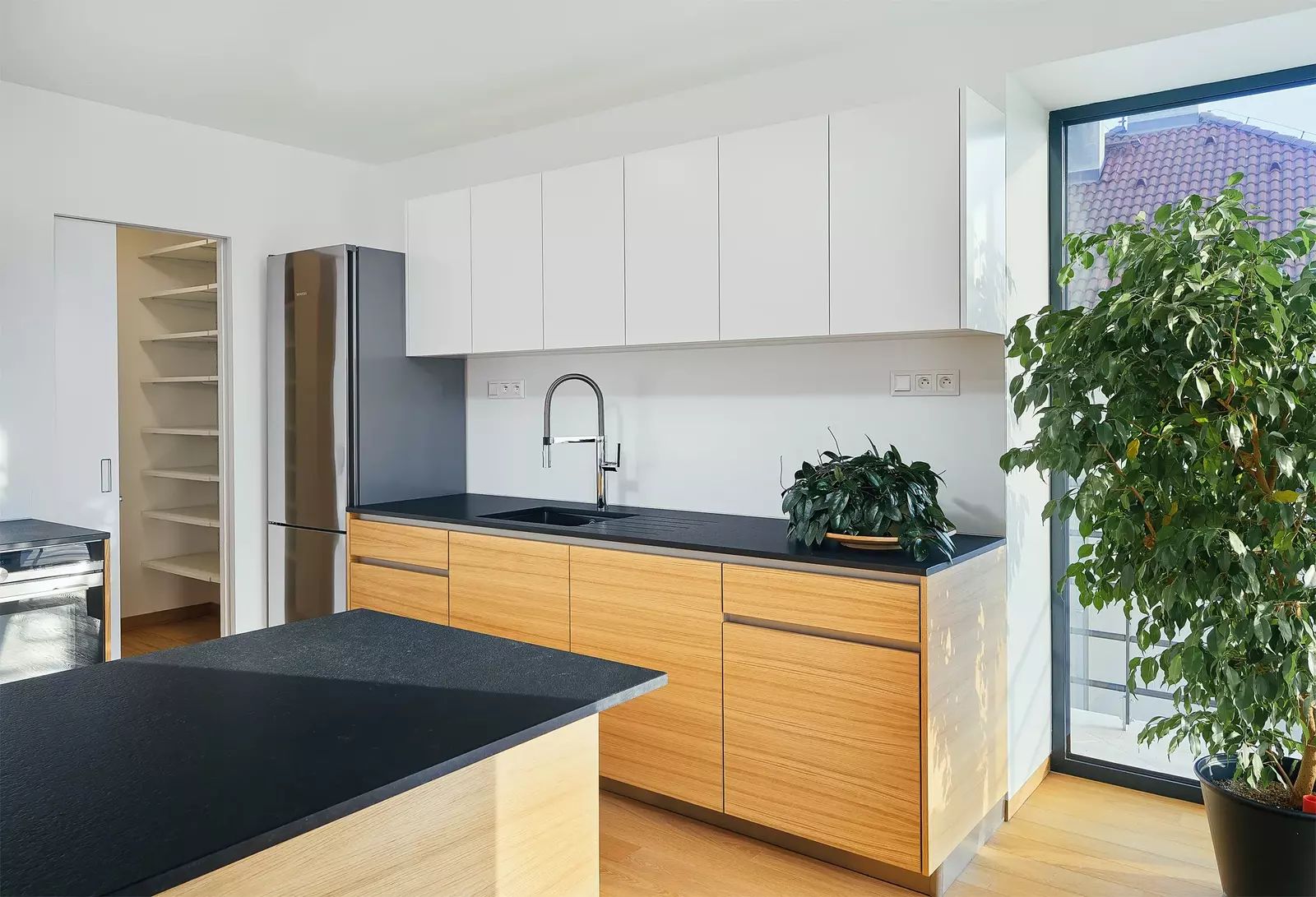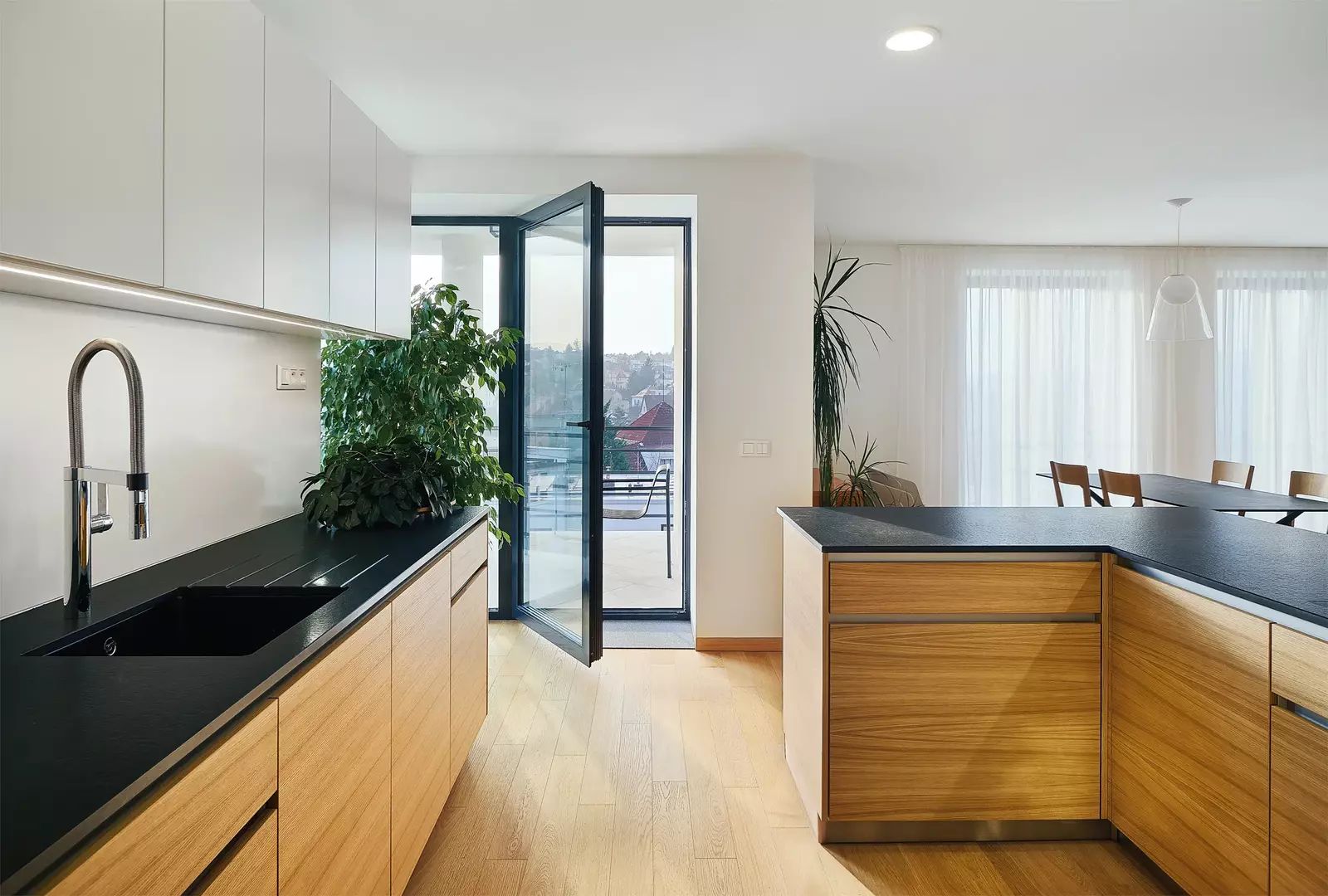 Prostorná kuchyňská linka je vybavena spotřebiči Siemens a varnou deskou Bora s odtahem par.