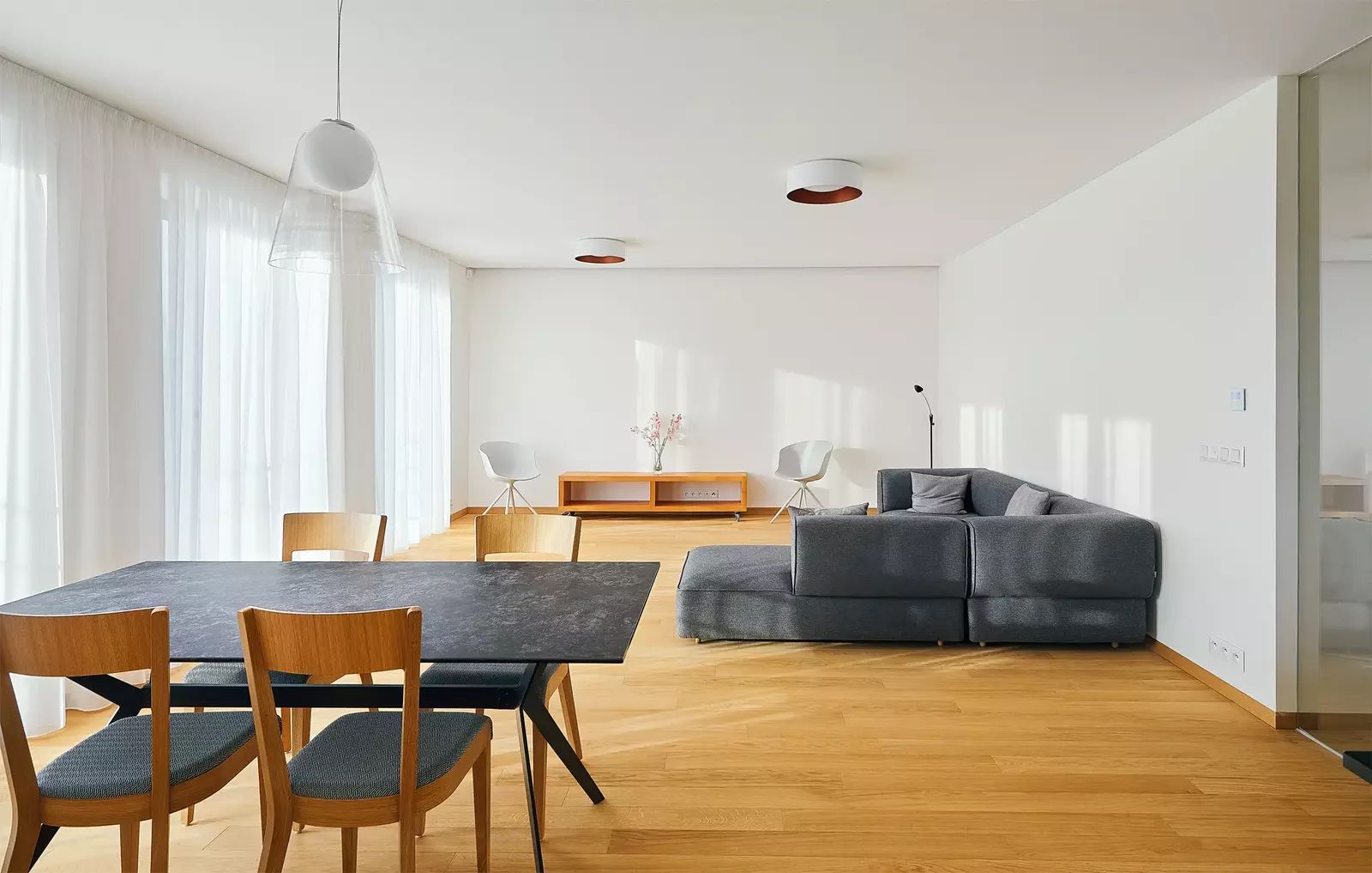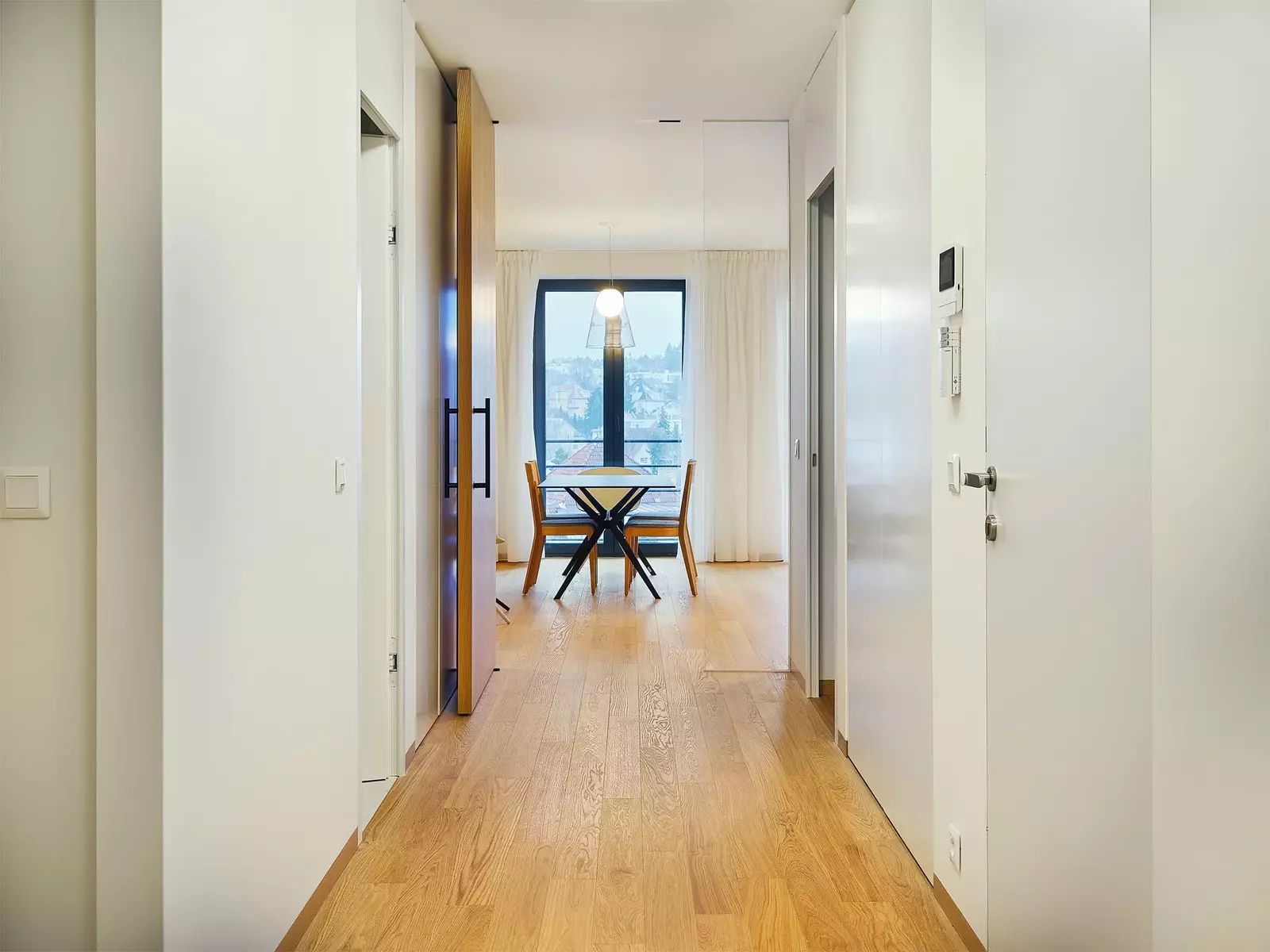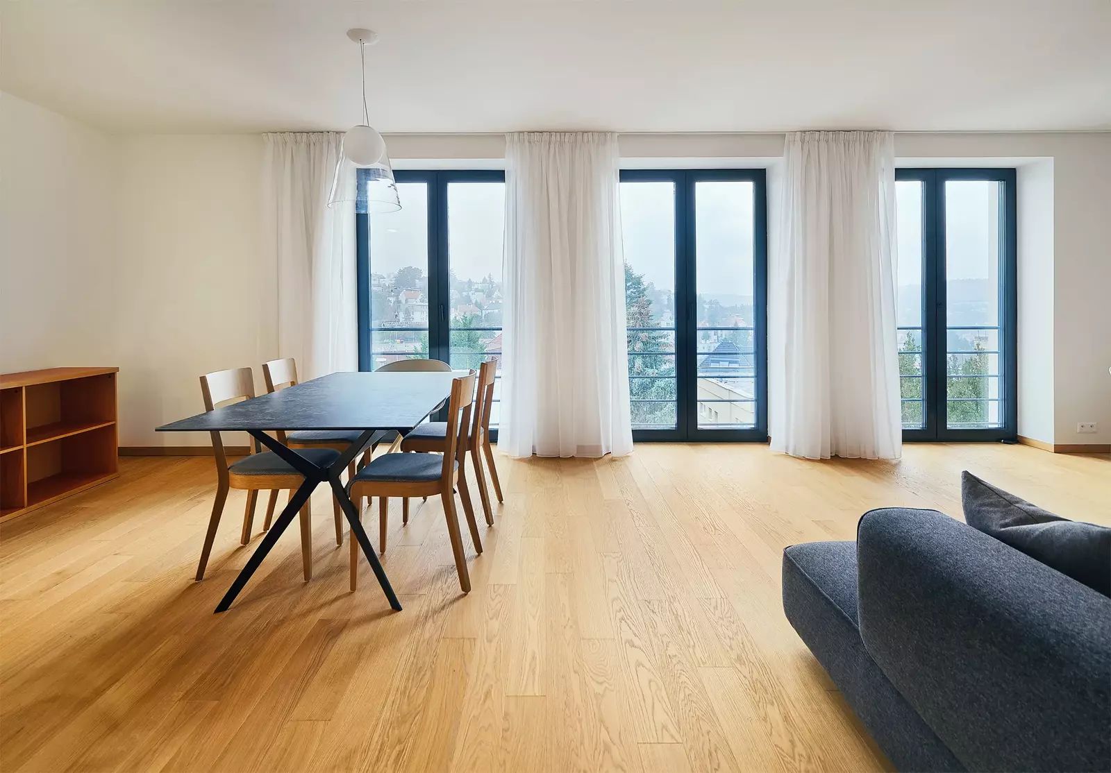 V bytě naleznete nejvyšší standard materiálů a vybavení. Hovoříme zde o dubových podlahách, velkoformátových designových obkladech Graniti Fiandre a sanitě Vileroy & Boch v koupelnách. Technologie vytápění a chlazení v podlahách s stropech, ventilace s rekuperací.