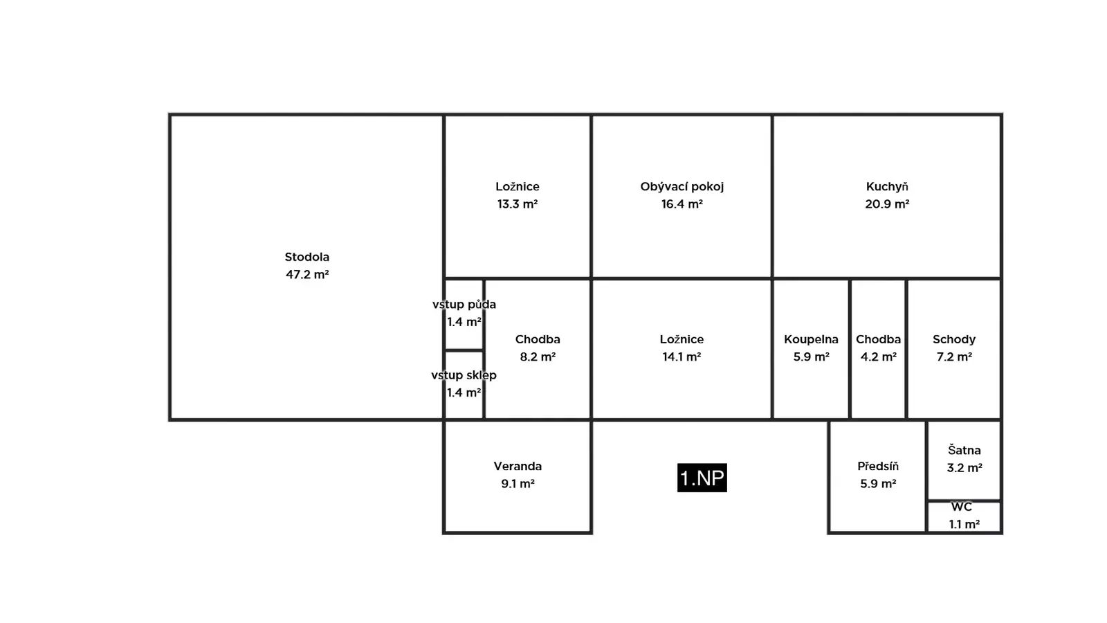 1.NP: Předsíň, WC, koupelna, šatna, 3 pokoje, kuchyň