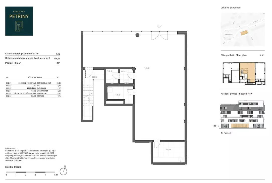Disp.: obchodní jednotka 93,48 m2, WC 2,34 m2, předsíňka 2,67 m2, úklid 5,08 m2, zázemí obchodní jednotky 8,81 m2, sklad 7,76 m2. Celková plocha: 126,02 m2.