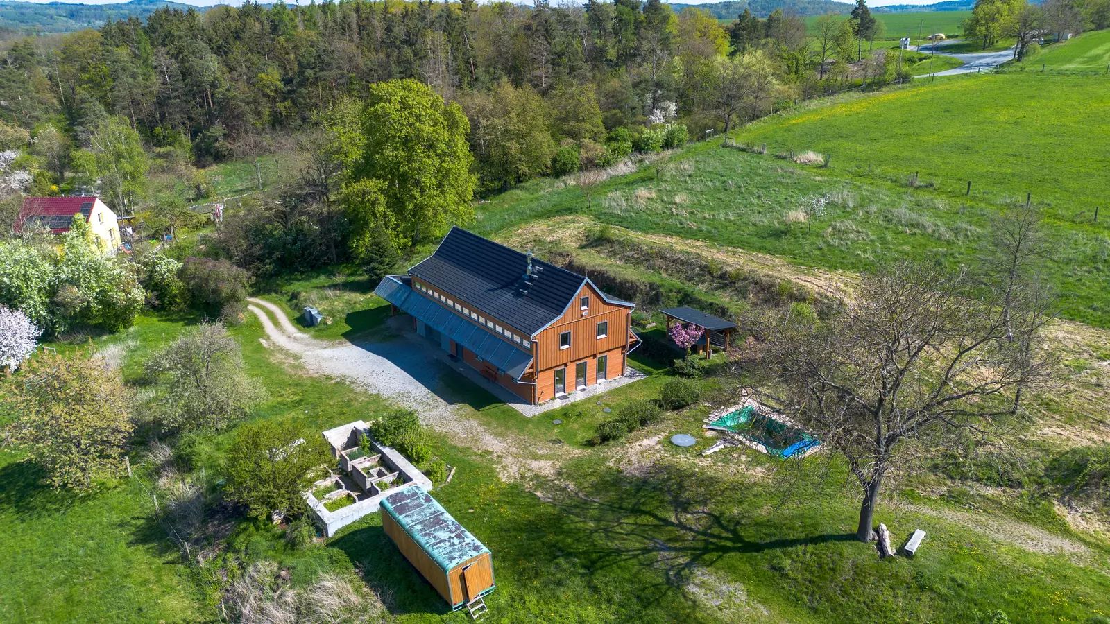 Na parcele se nacházejí zbytky původní usedlosti, které jsou evidovány jako stavba a nabízejí možnost rekonstrukce na základě stavebního ohlášení. Tento prostor lze jednoduše a bez průtahů přetvořit dle vašich představ – ať už na další obytné prostory či zázemí pro podnikání. Usedlost nabízí též široké podnikatelské využití. Na farmě lze pořádat svatby, školení, tábory, kurzy jógy, komunitní akce a další.