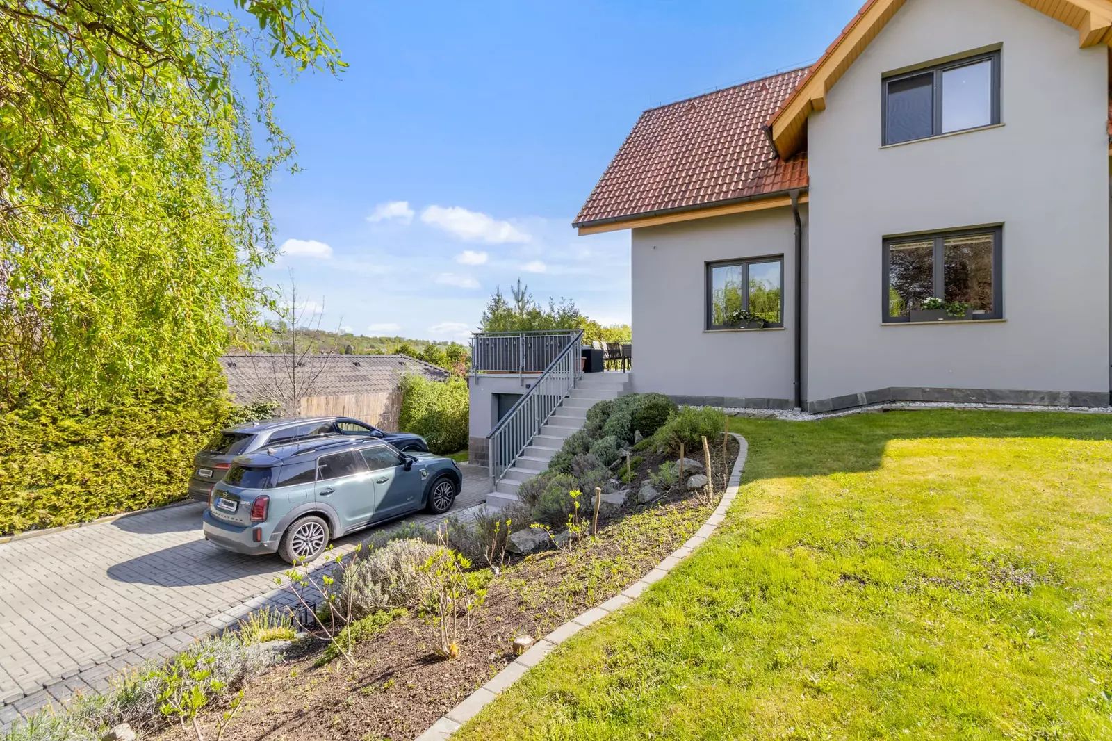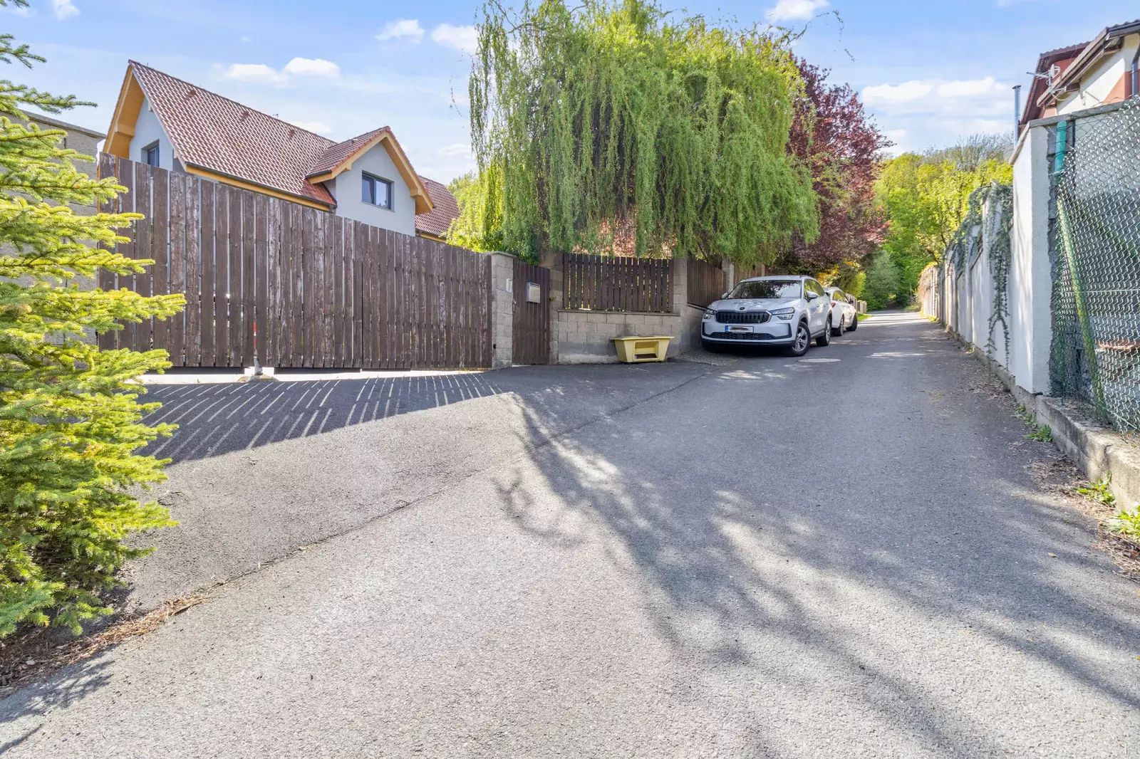 Pozemek se vzrostlými stromy, keři a okrasnou zahradou zaručuje naprosté soukromí a ničím nerušený výhled do údolí. Parkování je zajištěno v garáži a na čtyřech venkovních stáních na vlastním pozemku u domu.