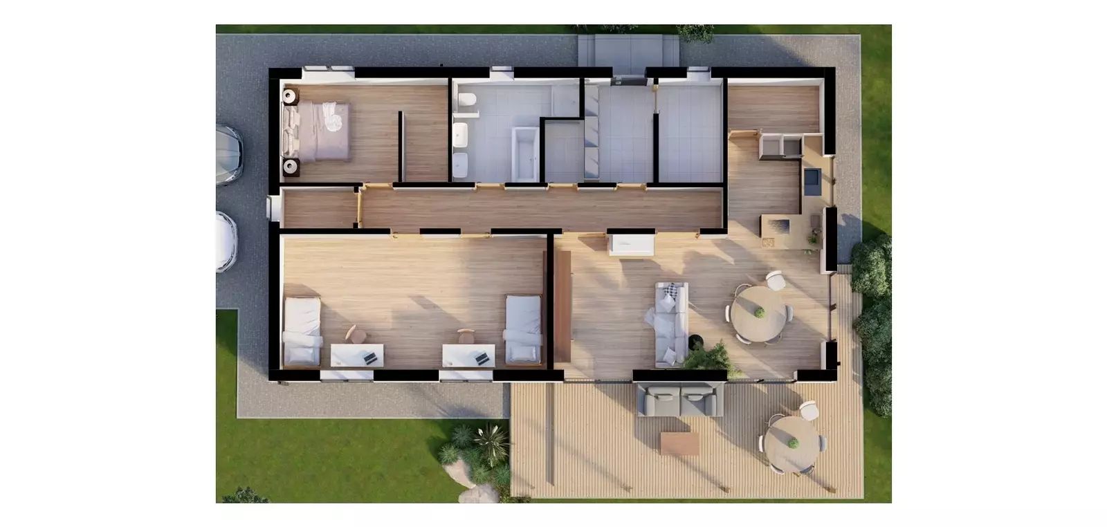 Cena zahrnuje kompletně dokončený a zkolaudovaný dům včetně terénních úprav, zámková dlažba, terasa, parkování a plot, podlahy, obklady a dlažby včetně sanity, masivní dveře a parapety.