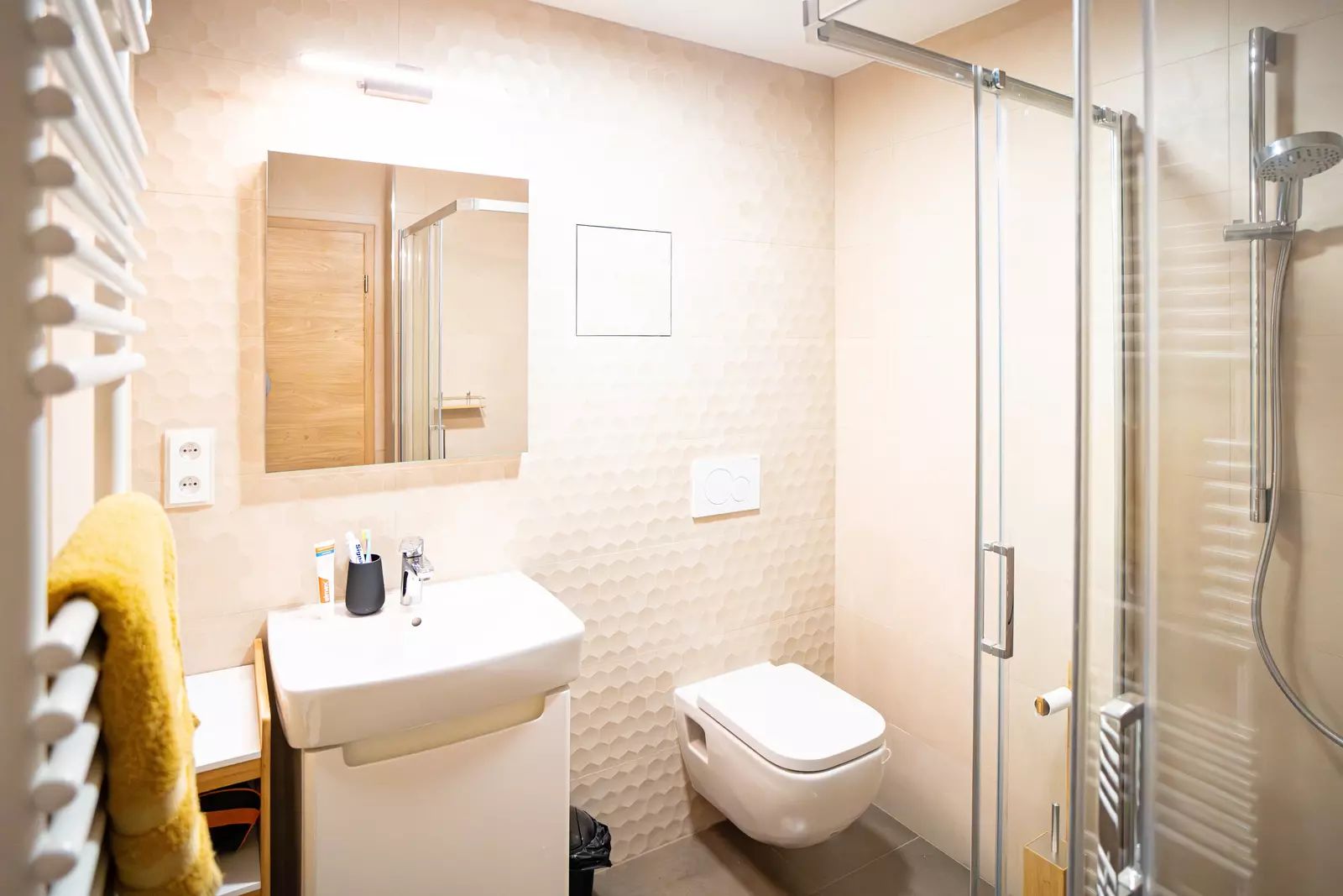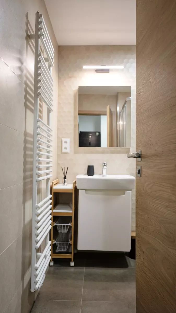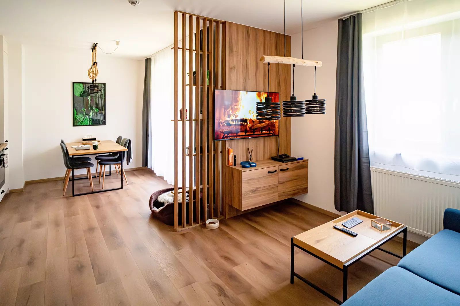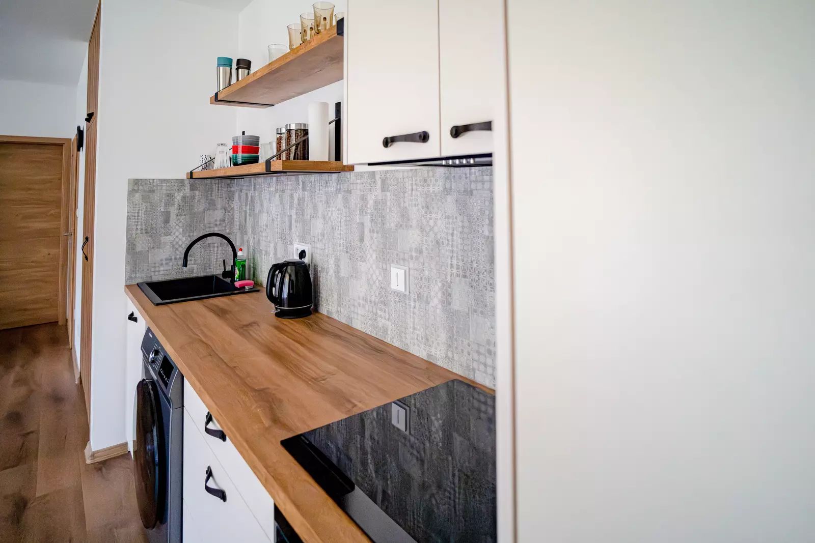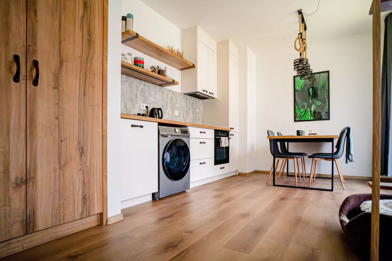 Apartmán o užitné ploše 46 m² se nachází ve 2. patře nového třípodlažního cihlového domu s výtahem a nabízí praktické řešení prostoru. Hlavní část tvoří obývací pokoj s moderně řešeným kuchyňským koutem s veškerým vybavením a přístupem na lodžii, která prodlužuje obytný prostor. Ložnice je vybavena manželskou postelí a praktickým patrem na spaní, které je ideální pro děti a efektivně využívá prostor bez nutnosti dalších úprav. Celý interiér doplňuje nábytek na míru od truhláře, který byl navržen s ohledem na reálné potřeby ubytování i úložné kapacity - vestavěné skříně, pracovní a úložné plochy tak podporují maximální využití každého metru.