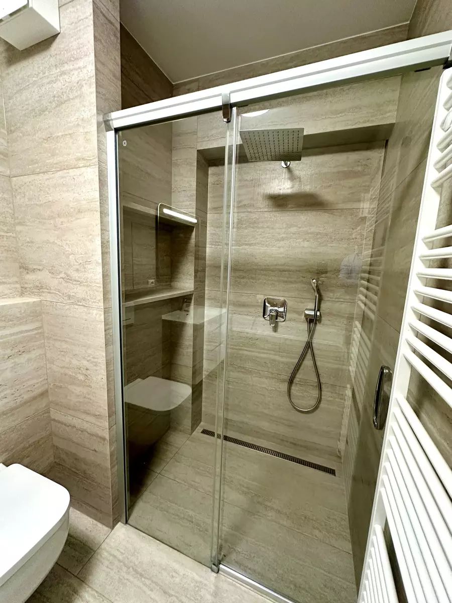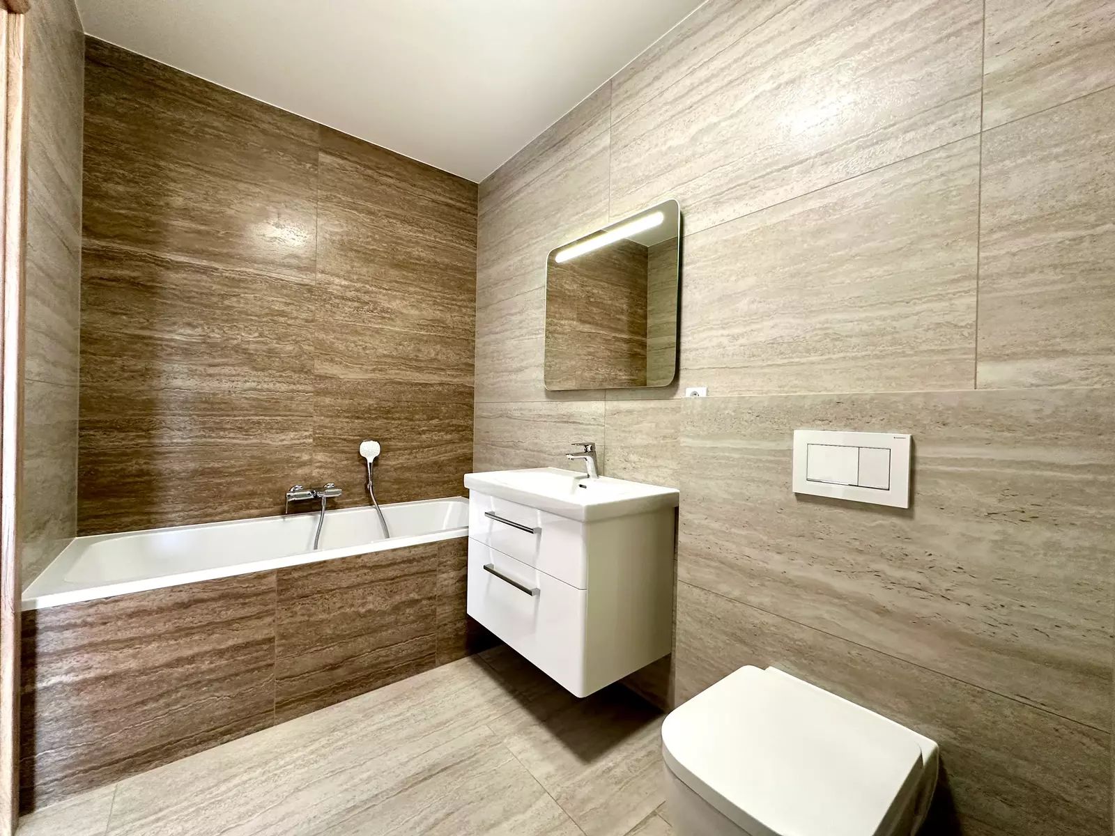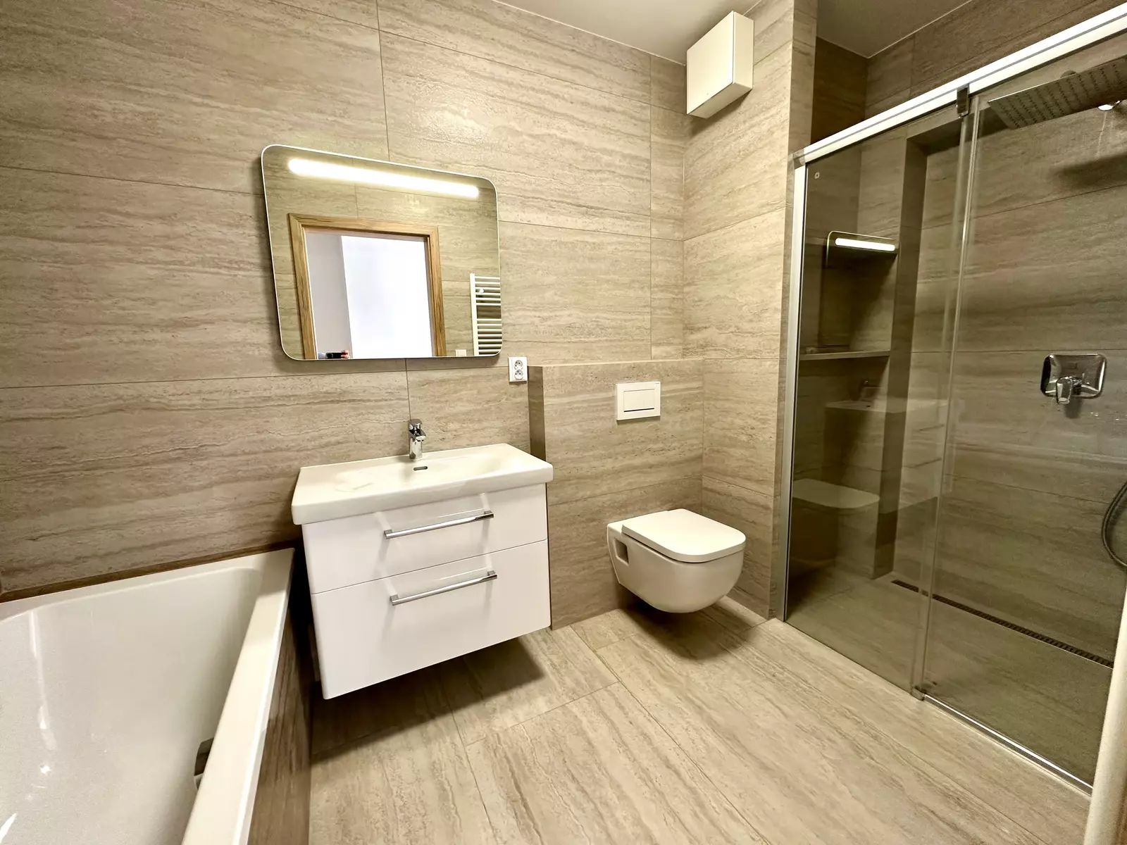 Koupelna s vanou i sprchovým koutem, velkoformátovou dlažbou, dostatkem úložných nik a vyhřívanou podlahou. Plus samostatné druhé WC v chodbě.