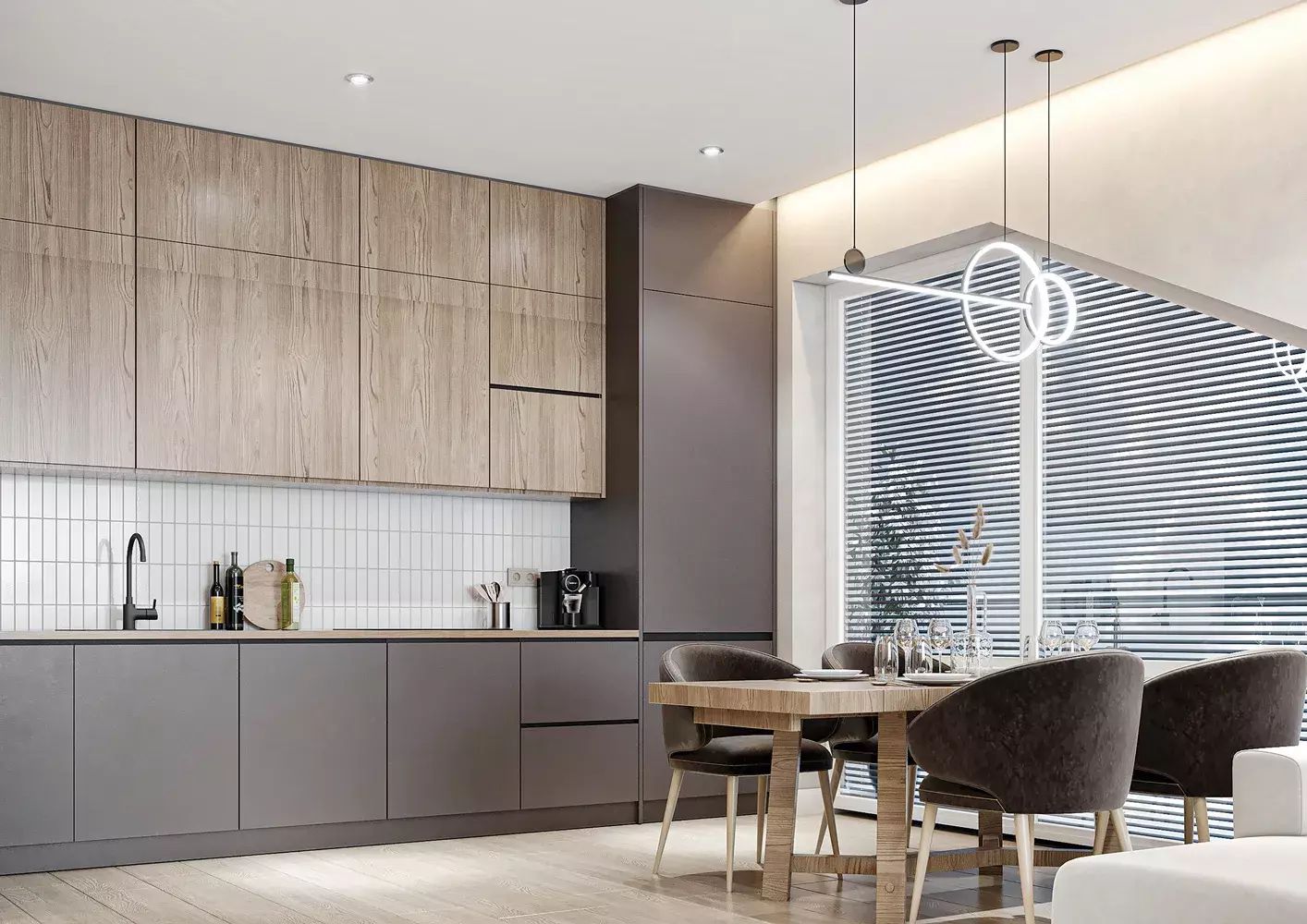 Podlahy jsou vinylové s dekorem dřeva pro teplou a nadčasovou atmosféru.