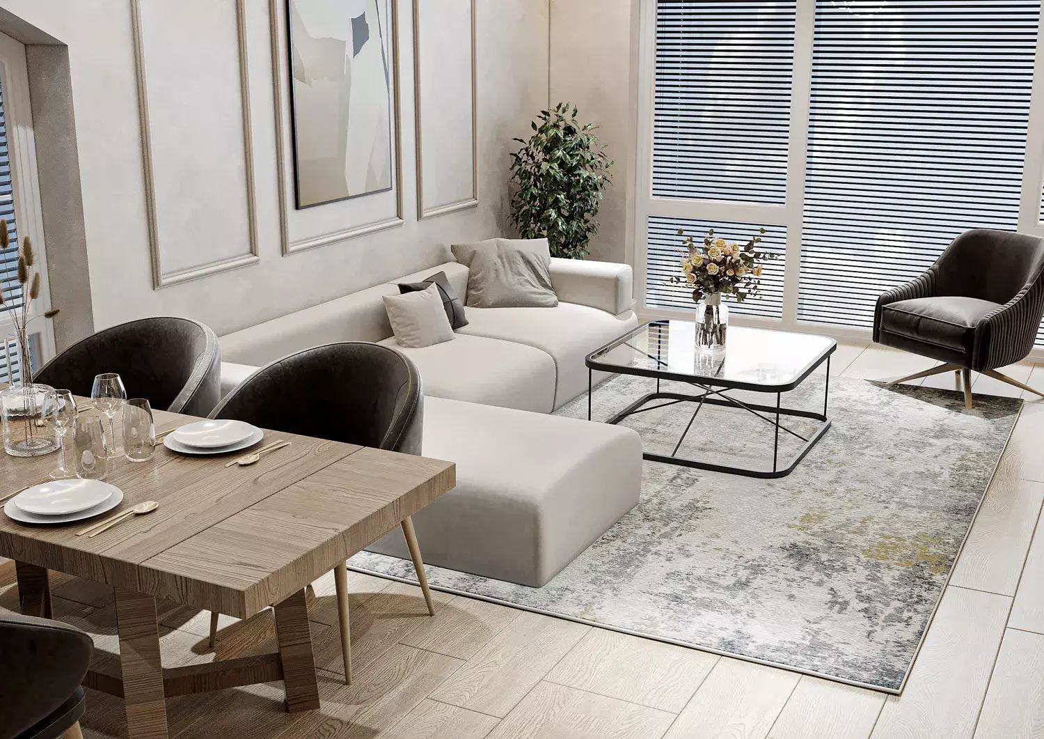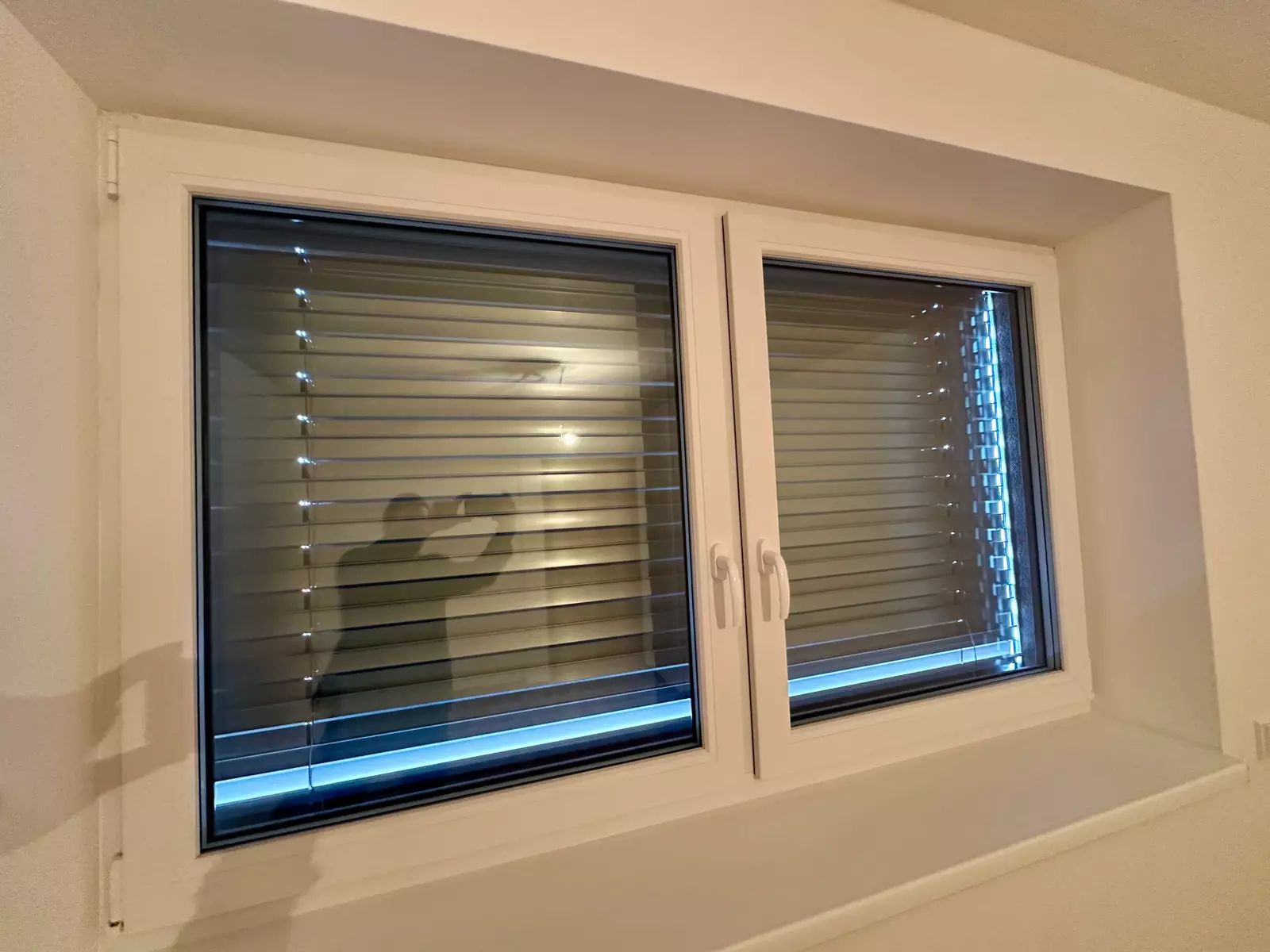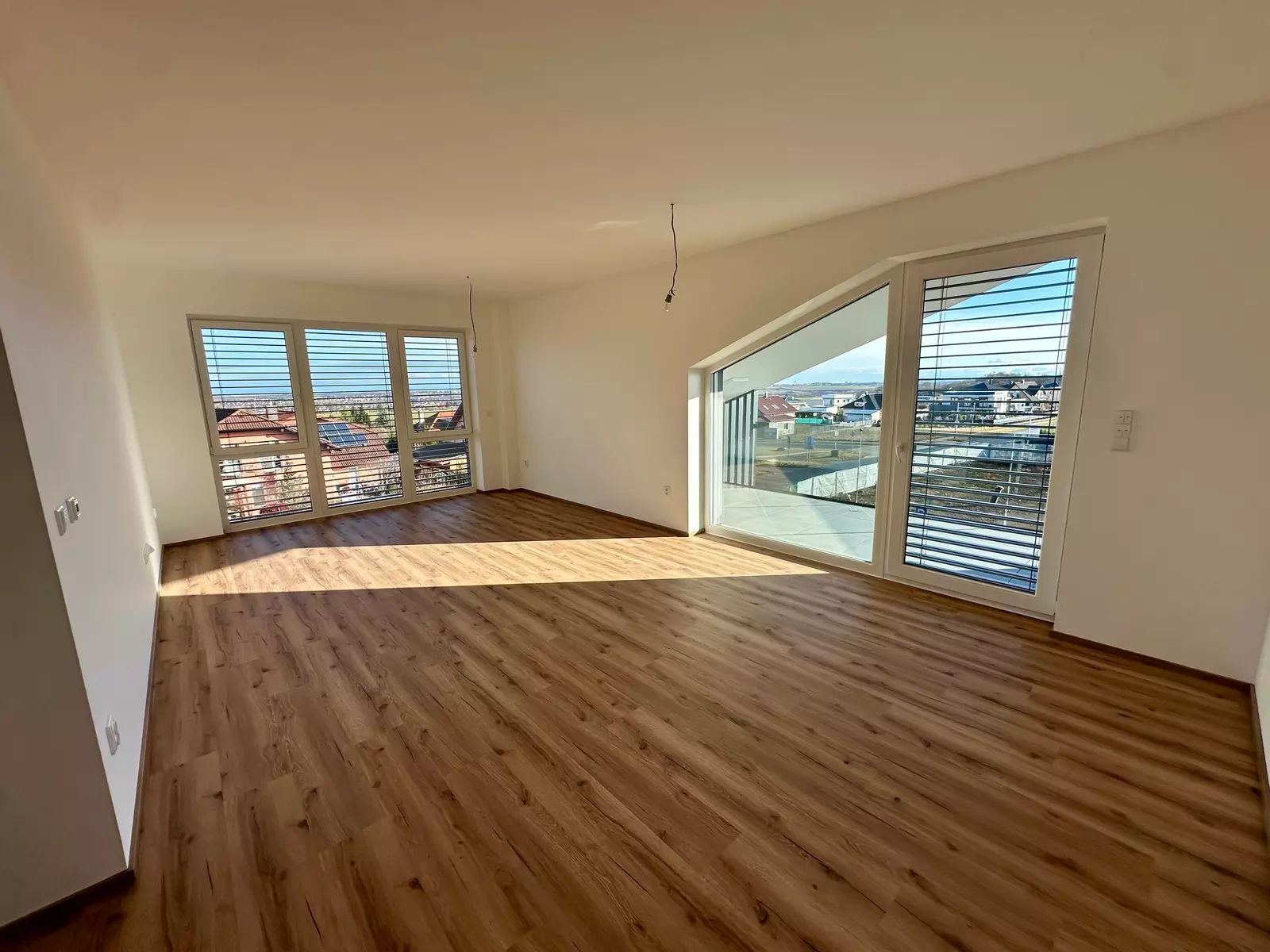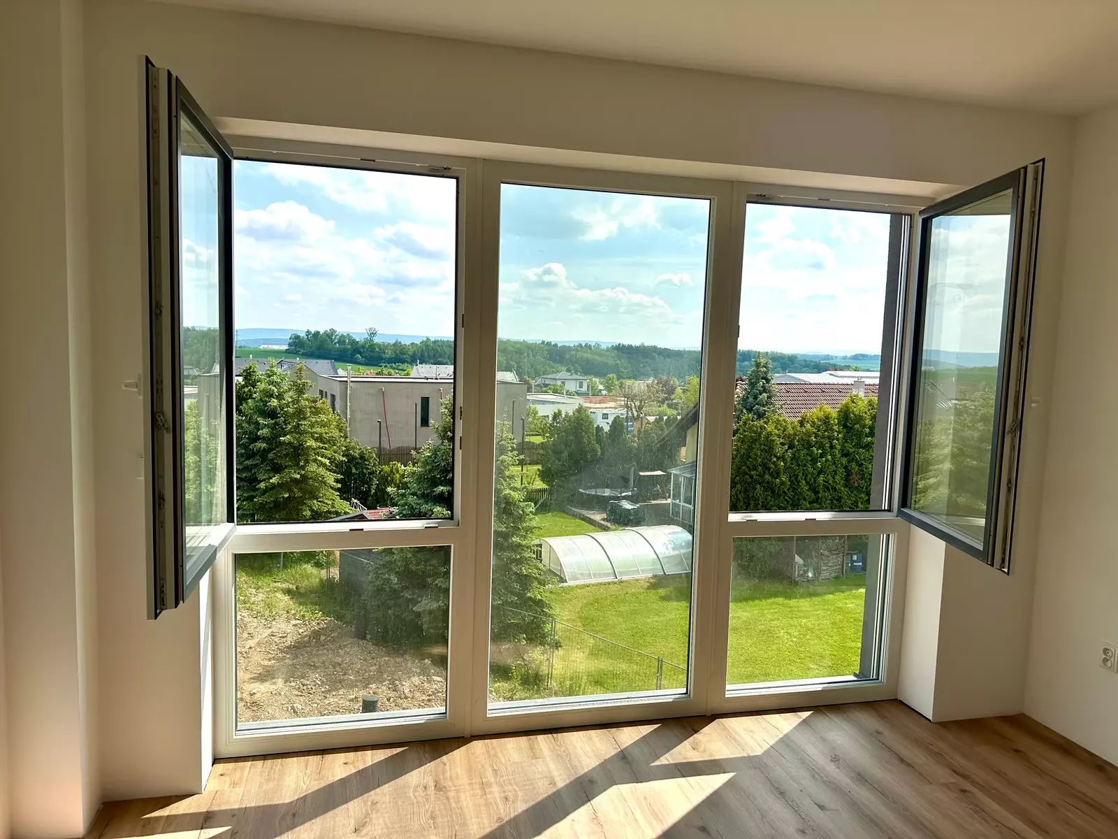 Velká okna s venkovními žaluziemi pro regulaci světla a teploty.