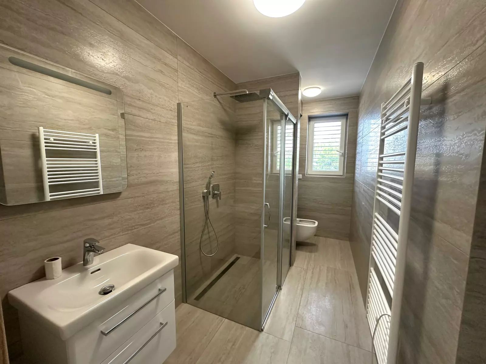 Koupelna má moderní design s velkoformátovými dlažbami a dostatek úložného prostoru.