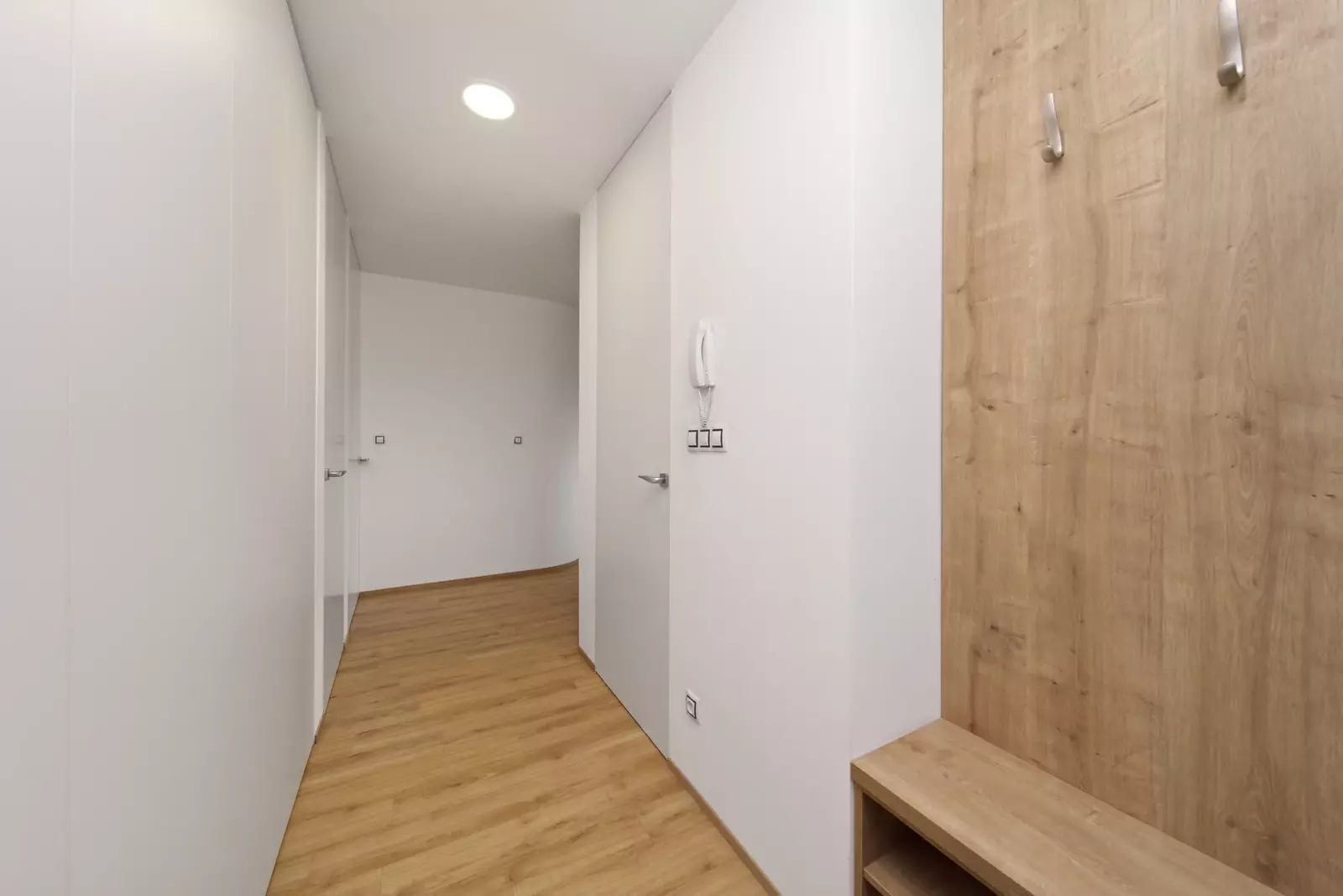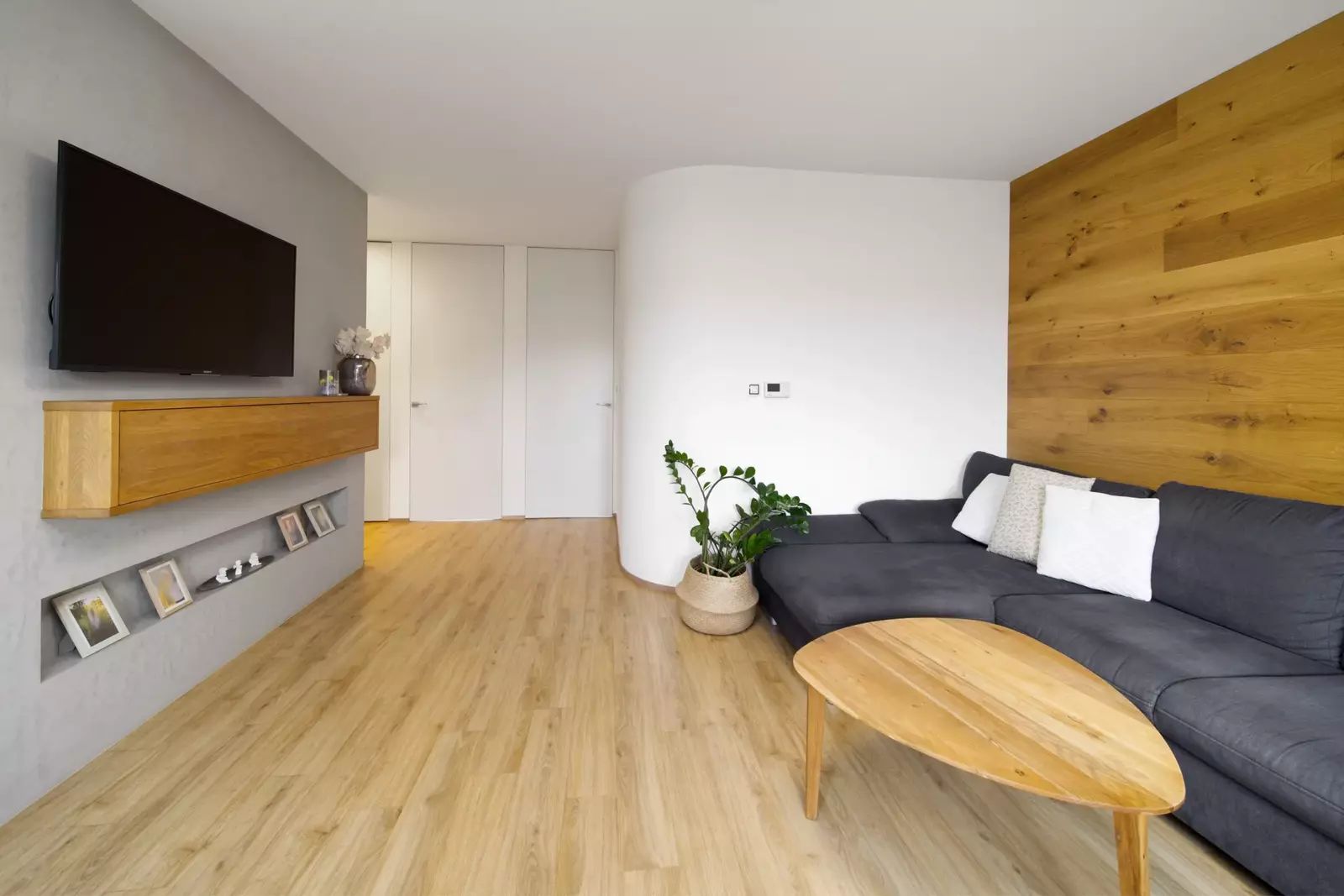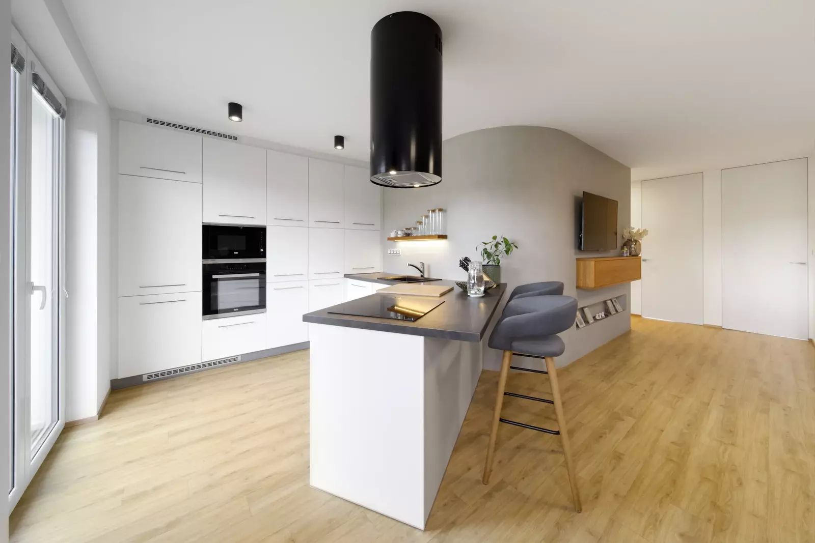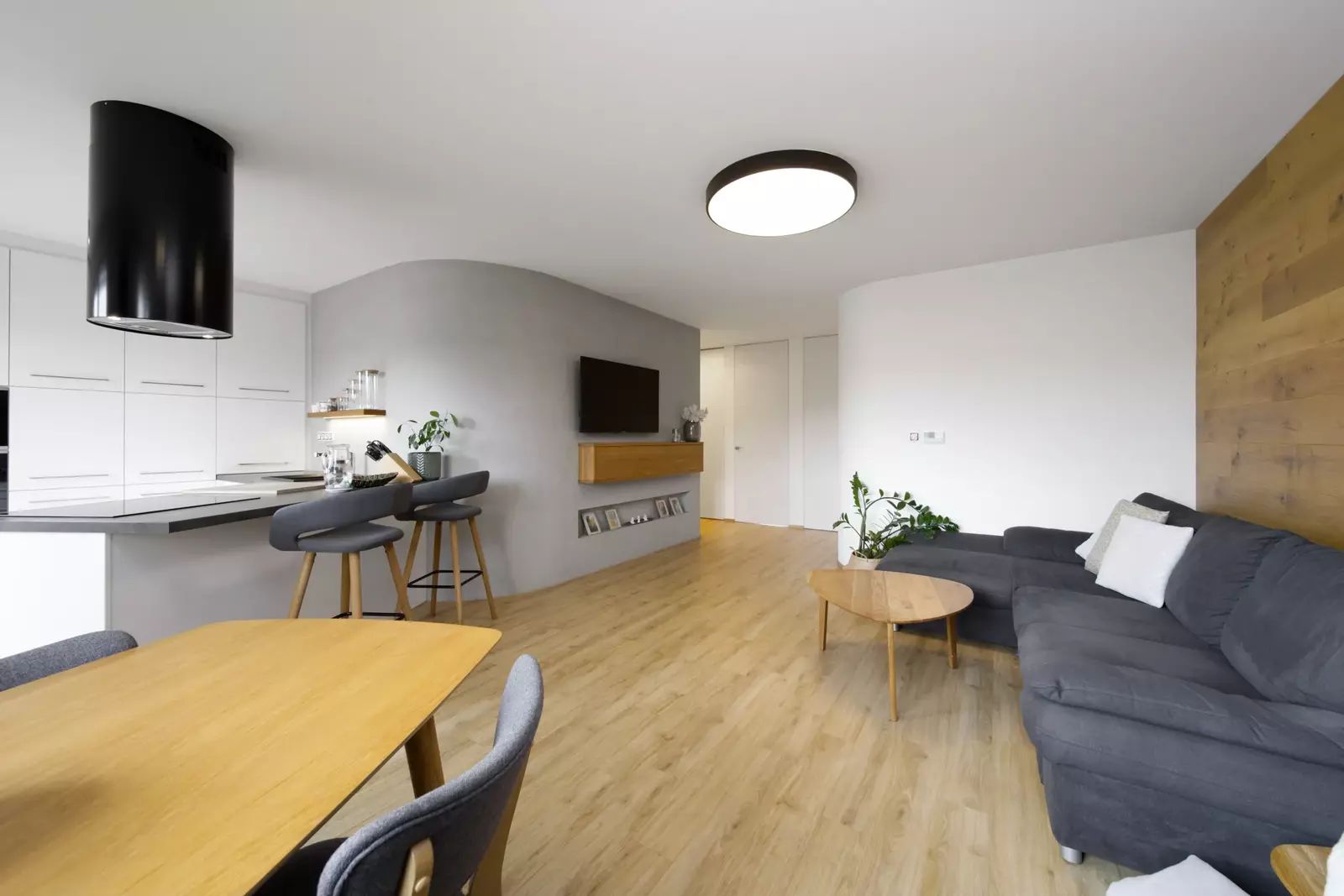 Interiér podle designového návrhu zahrnuje zaoblené rohy, interiérové dveře na míru s magnetickými zámky, vestavěné prostorné skříně ve vstupní hale a šatnu v ložnici, kvalitní spotřebiče a další.