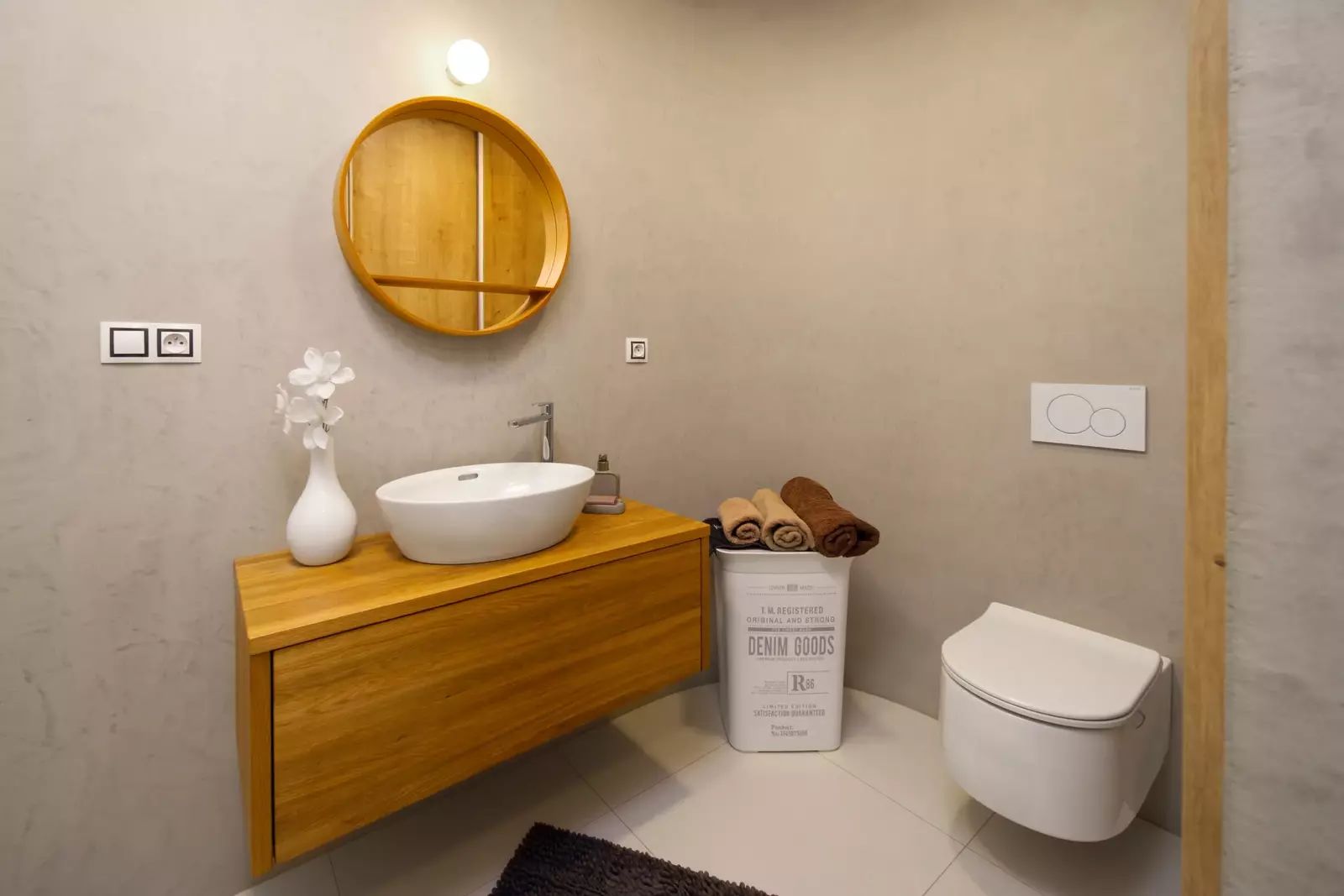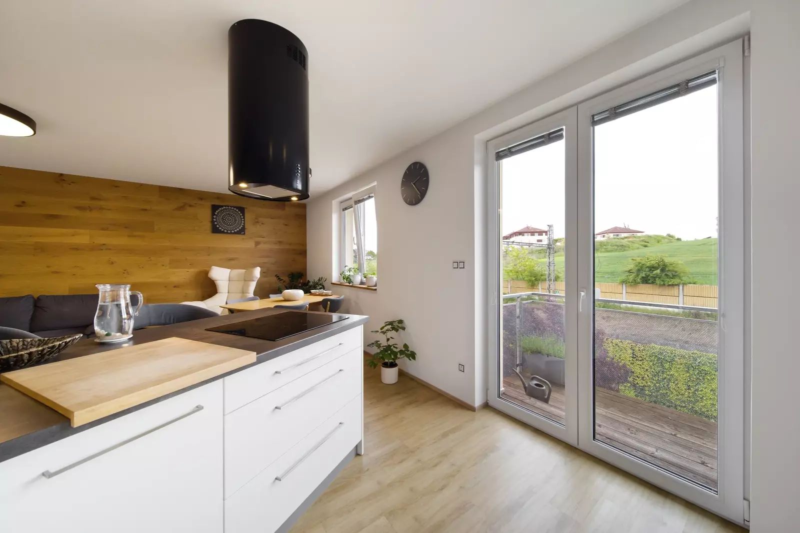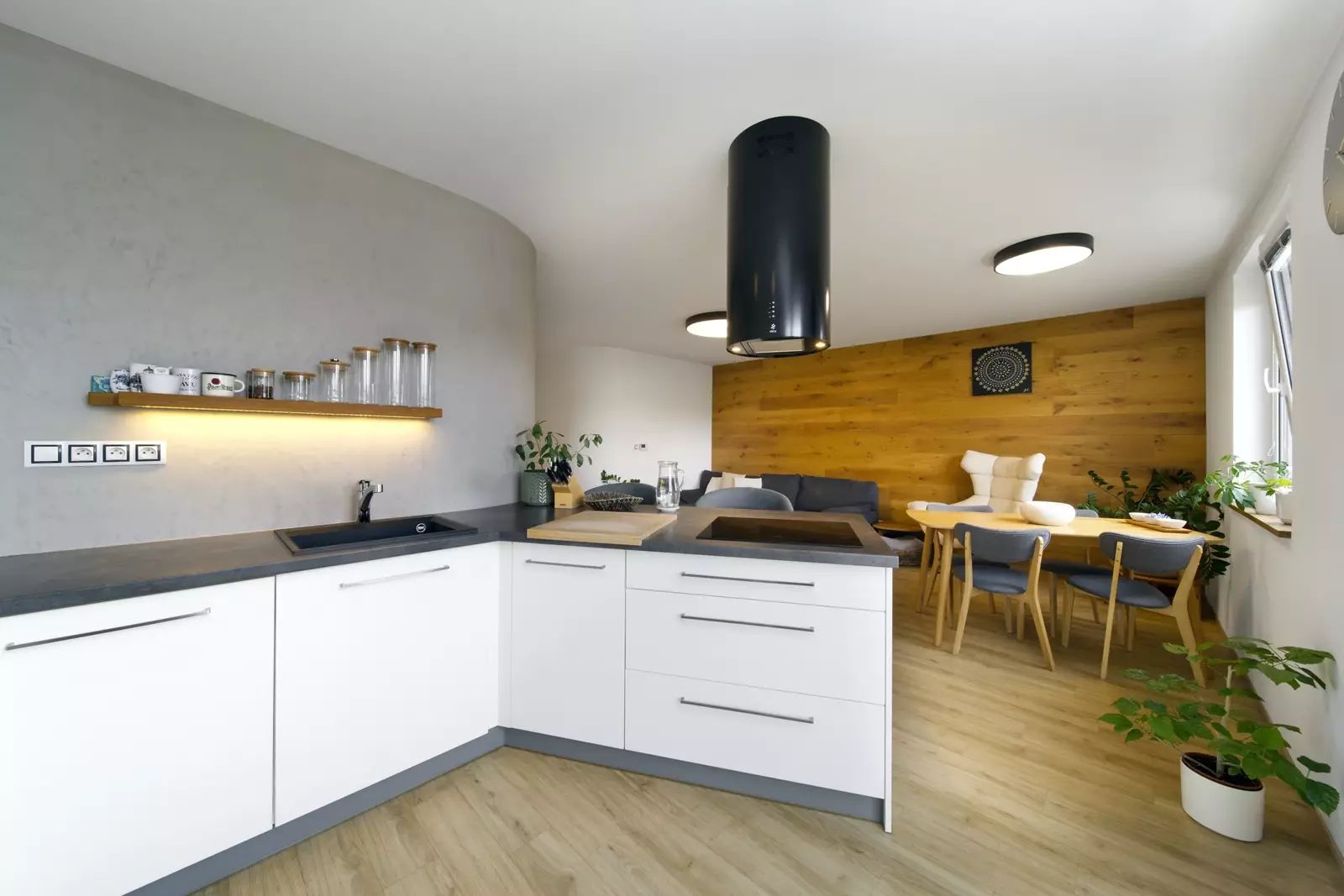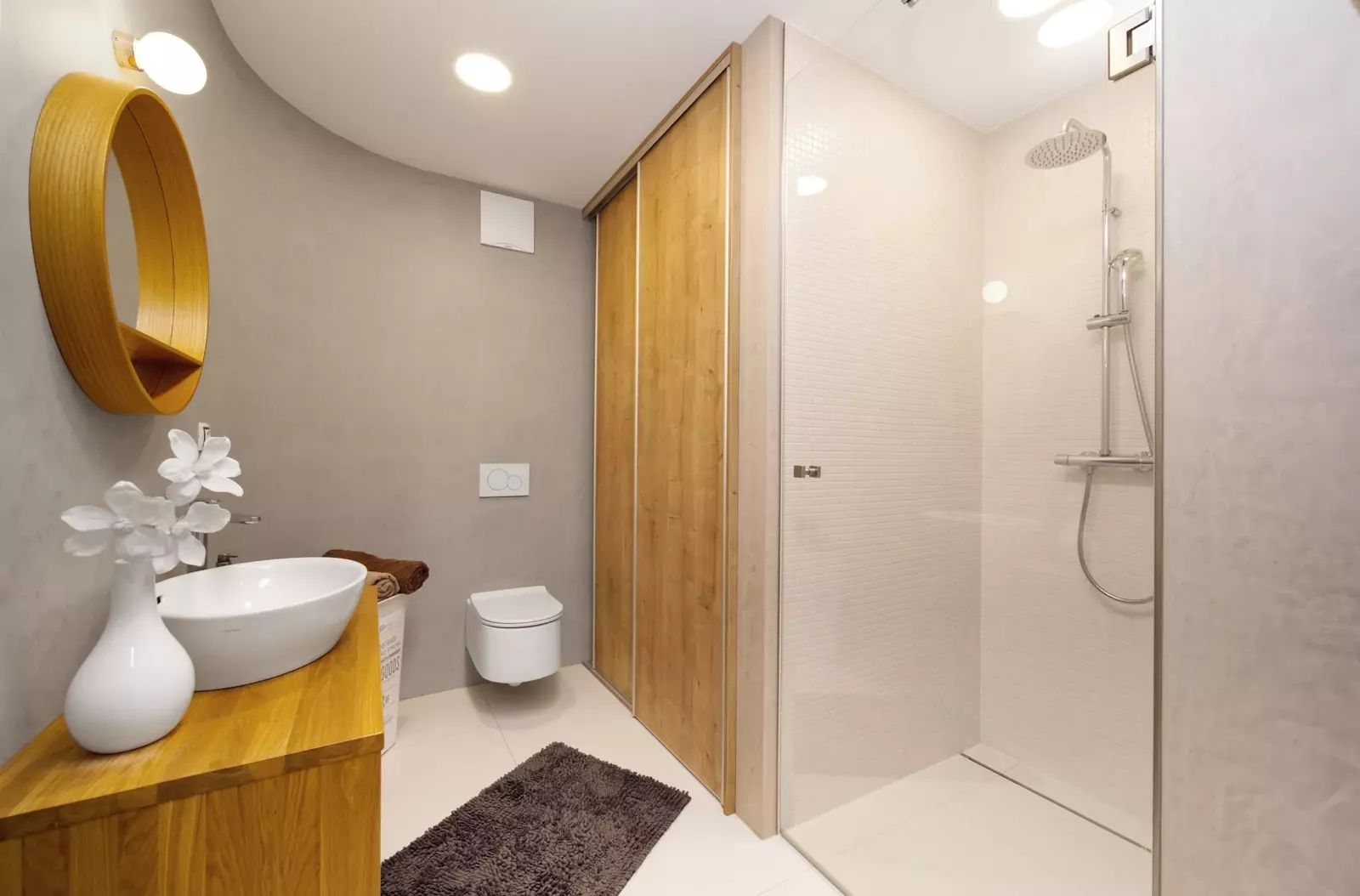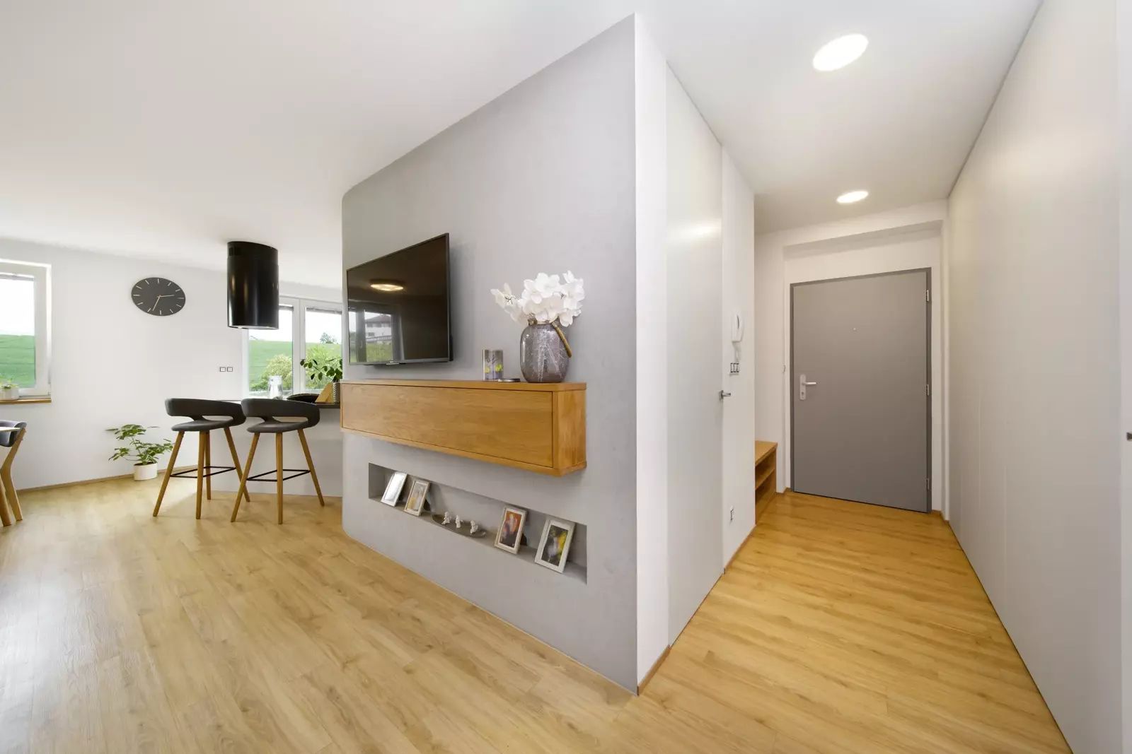 Interiér podle designového návrhu zahrnuje zaoblené rohy, interiérové dveře na míru s magnetickými zámky, vestavěné prostorné skříně ve vstupní hale a šatnu v ložnici, kvalitní spotřebiče a další.