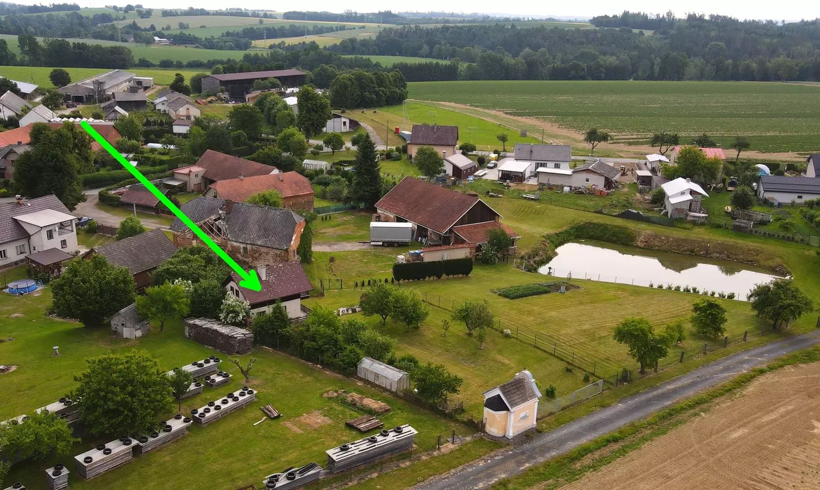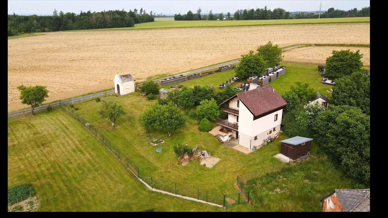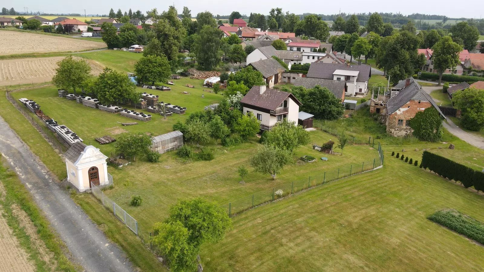 K nemovitosti patří také velká oplocená na jih orientovaná zahrada s plochou 1.023 m², ideální pro rodinné aktivity a relaxaci v přírodě. Na zahradě je 11 ovocných plodících stromů (jabloně, hrušeň, třešeň), 8 ovocných keřů (rybíz, angrešt, borůvky), skleník 10 m², udírna, většinu plochy tvoří trávní porost. Na zahradě stojí dřevěná kůlna. Jedinečnost této nabídky spočívá v tom, že zde je možnost současně pořídit barokní kapli 15,5 m² přímo sousedící se zahradou. Není to však podmínkou.