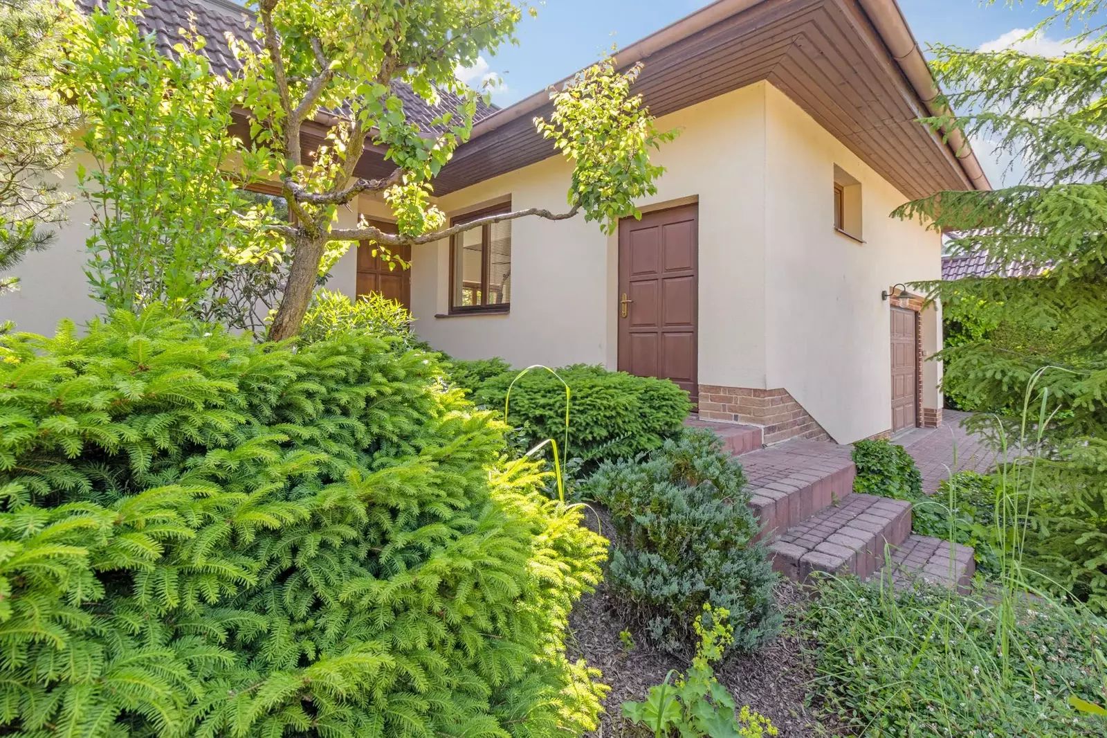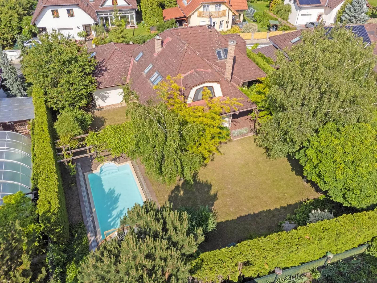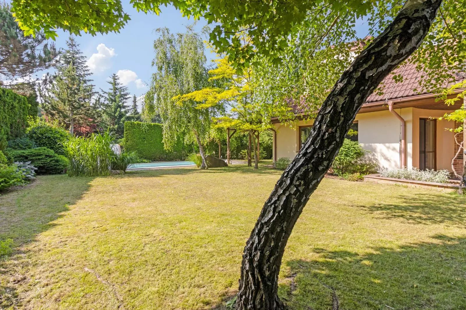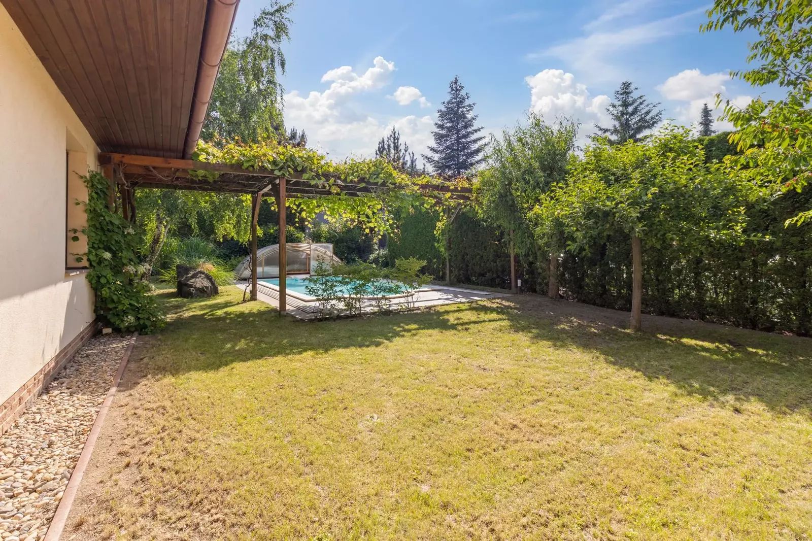 Dům, který stojí na pozemku s celkovou plochou 922 m², disponuje užitnou plochou 272 m². Zahrada je ohraničena vysokým zeleným plotem (3,4-4m) a s rozlohou 735 m² je ideálním místem pro relaxaci, hry dětí nebo třeba pořádání rodinných oslav na čerstvém vzduchu. Součástí pozemku je také terasa o velikosti 25 m² s pergolou porostlou plodící sladkou vinnou révou a s venkovním krbem s možností grilování. Na zahradě je kvalitní sedmimetrový krytý bazén od firmy Desjoyaux, vzrostlé ovocné plodící stromy stejně jako lesní stromy, keře a traviny.