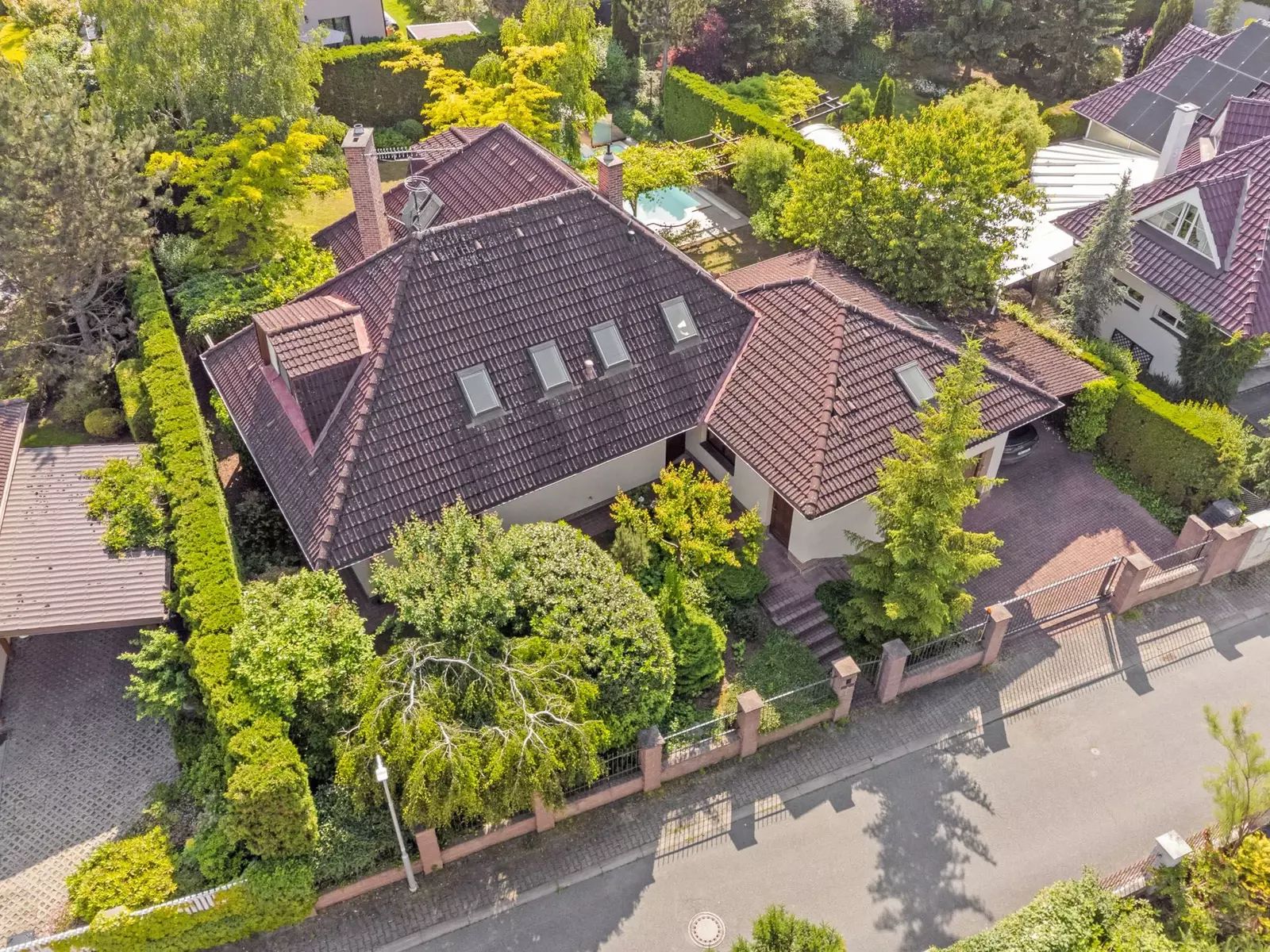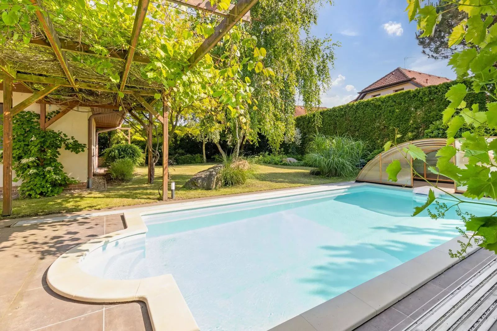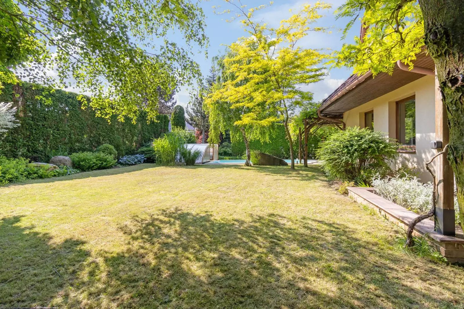 Dům, který stojí na pozemku s celkovou plochou 922 m², disponuje užitnou plochou 272 m². Zahrada je ohraničena vysokým zeleným plotem (3,4-4m) a s rozlohou 735 m² je ideálním místem pro relaxaci, hry dětí nebo třeba pořádání rodinných oslav na čerstvém vzduchu. Součástí pozemku je také terasa o velikosti 25 m² s pergolou porostlou plodící sladkou vinnou révou a s venkovním krbem s možností grilování. Na zahradě je kvalitní sedmimetrový krytý bazén od firmy Desjoyaux, vzrostlé ovocné plodící stromy stejně jako lesní stromy, keře a traviny.