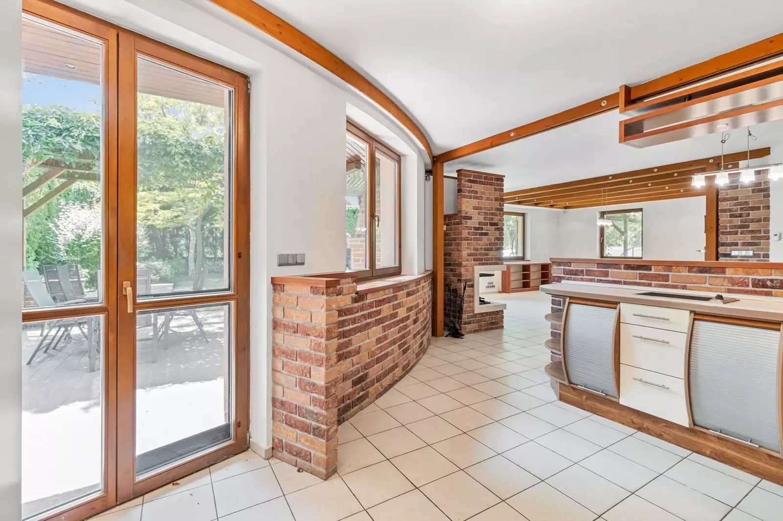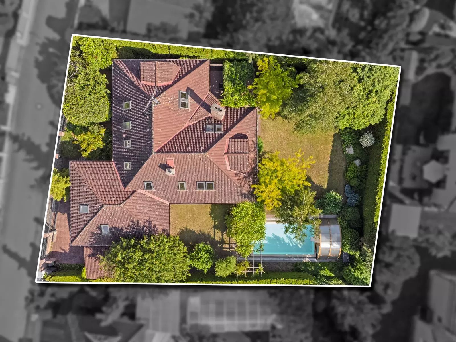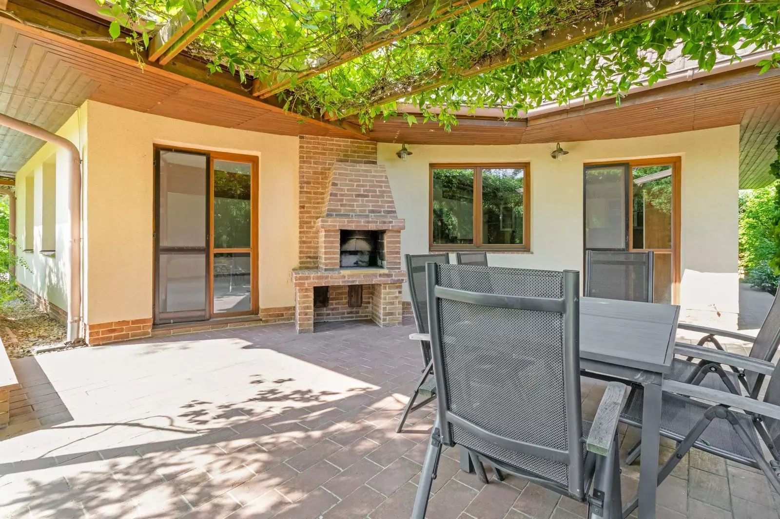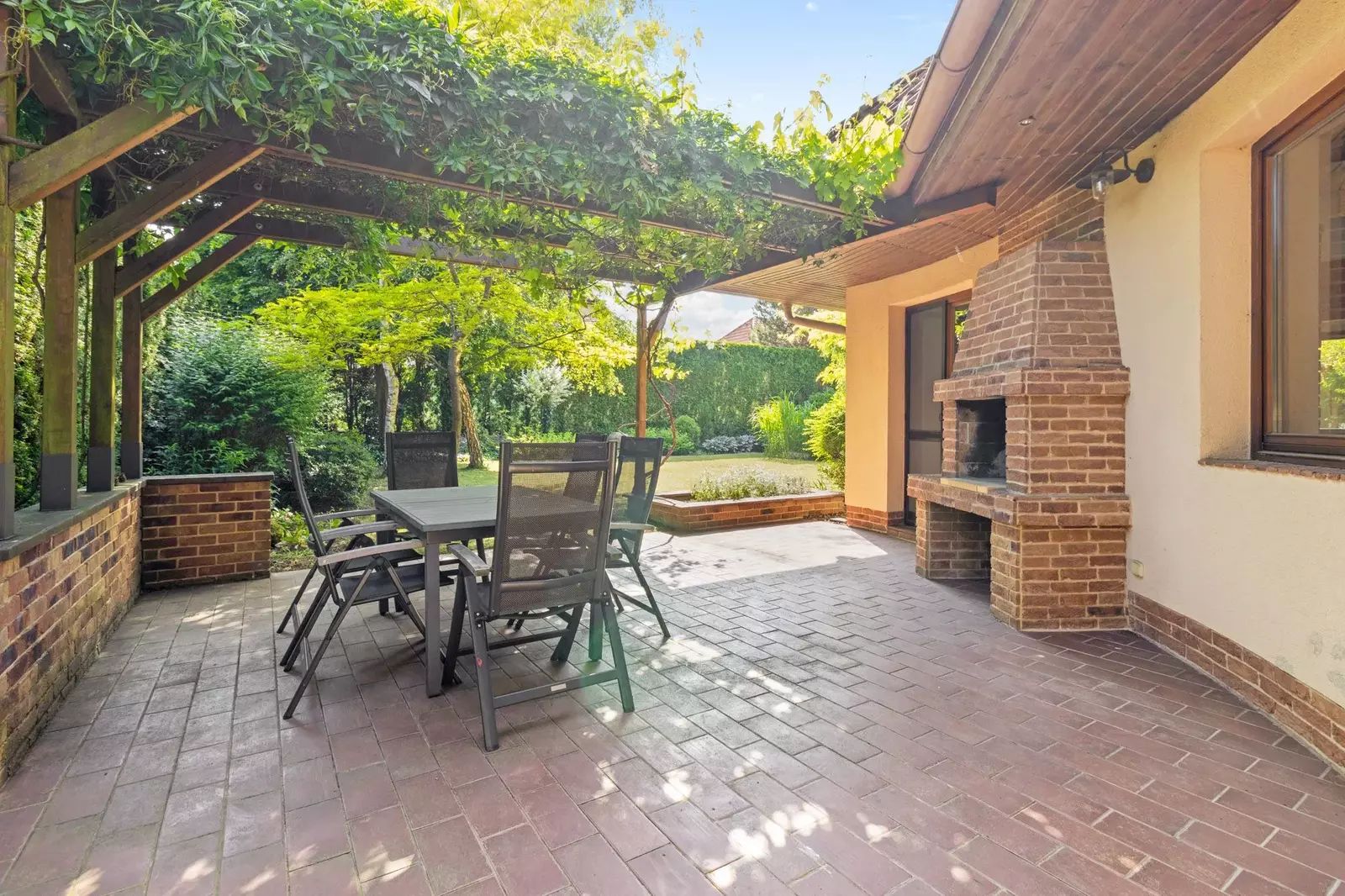 Dům, který stojí na pozemku s celkovou plochou 922 m², disponuje užitnou plochou 272 m². Zahrada je ohraničena vysokým zeleným plotem (3,4-4m) a s rozlohou 735 m² je ideálním místem pro relaxaci, hry dětí nebo třeba pořádání rodinných oslav na čerstvém vzduchu. Součástí pozemku je také terasa o velikosti 25 m² s pergolou porostlou plodící sladkou vinnou révou a s venkovním krbem s možností grilování. Na zahradě je kvalitní sedmimetrový krytý bazén od firmy Desjoyaux, vzrostlé ovocné plodící stromy stejně jako lesní stromy, keře a traviny.