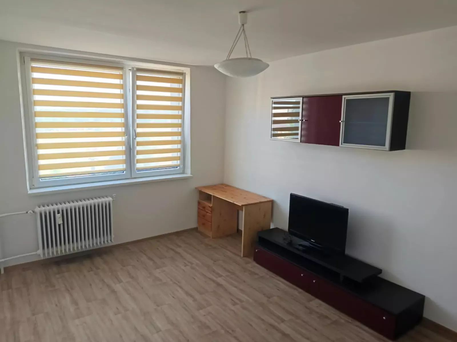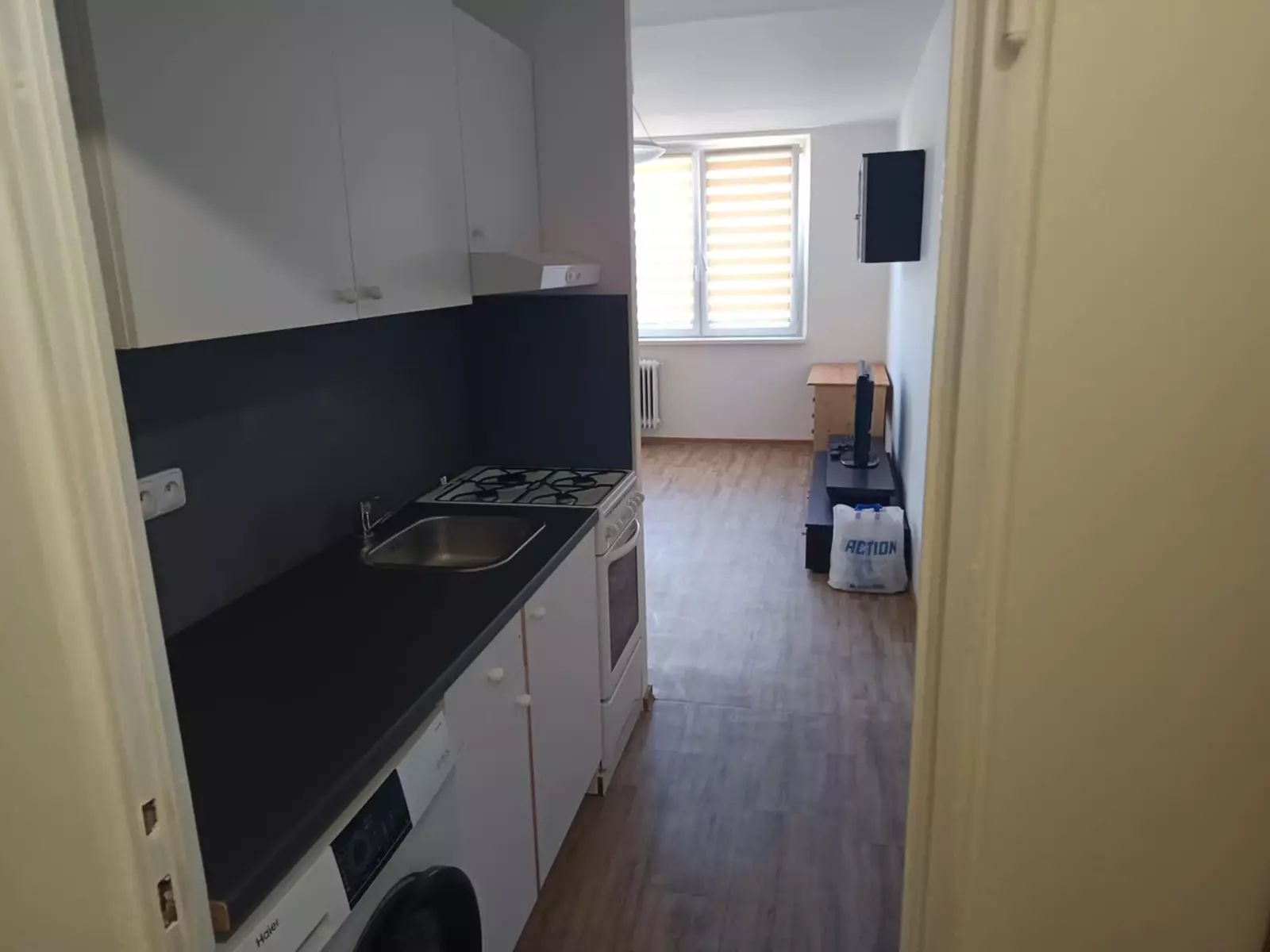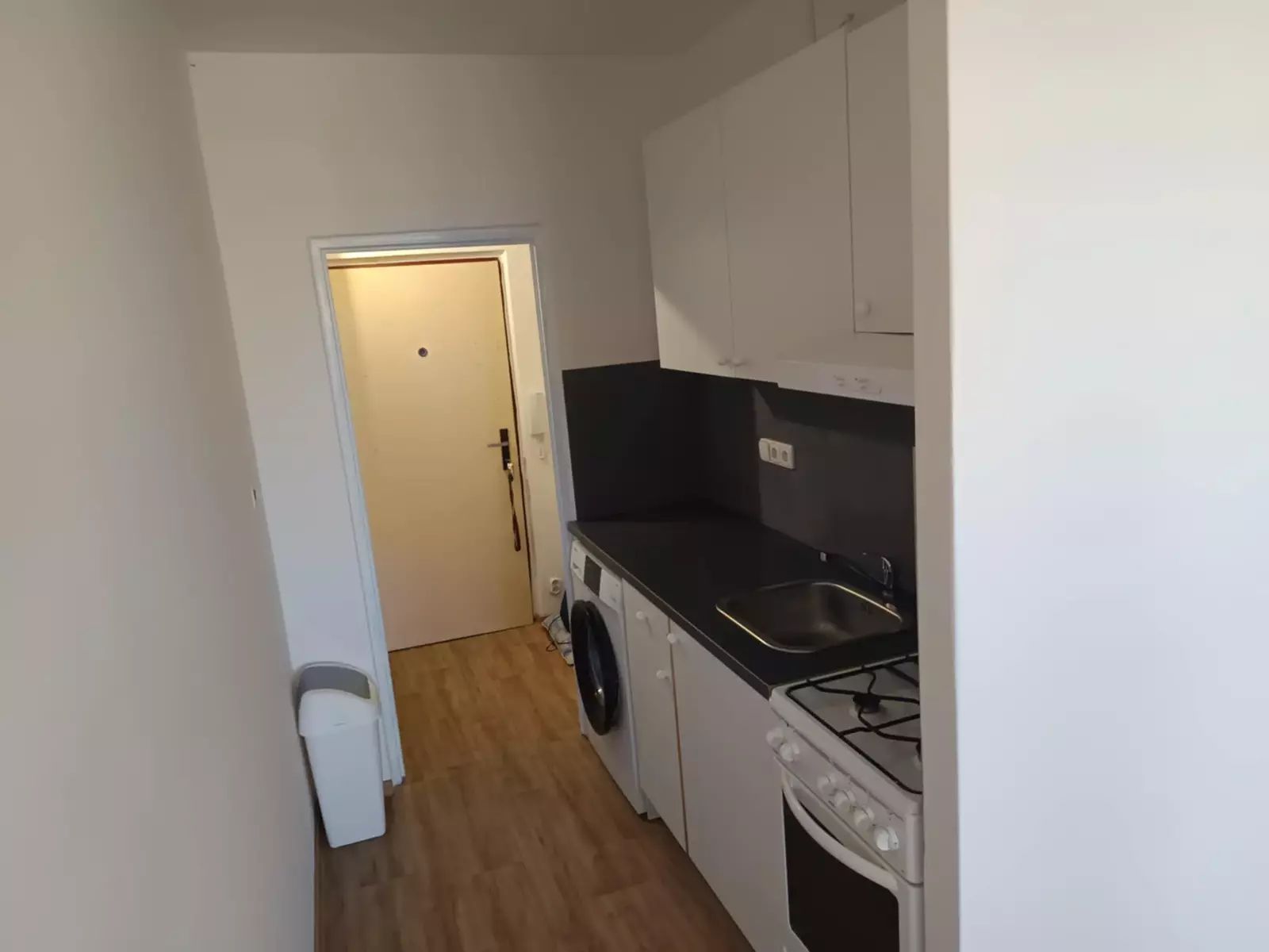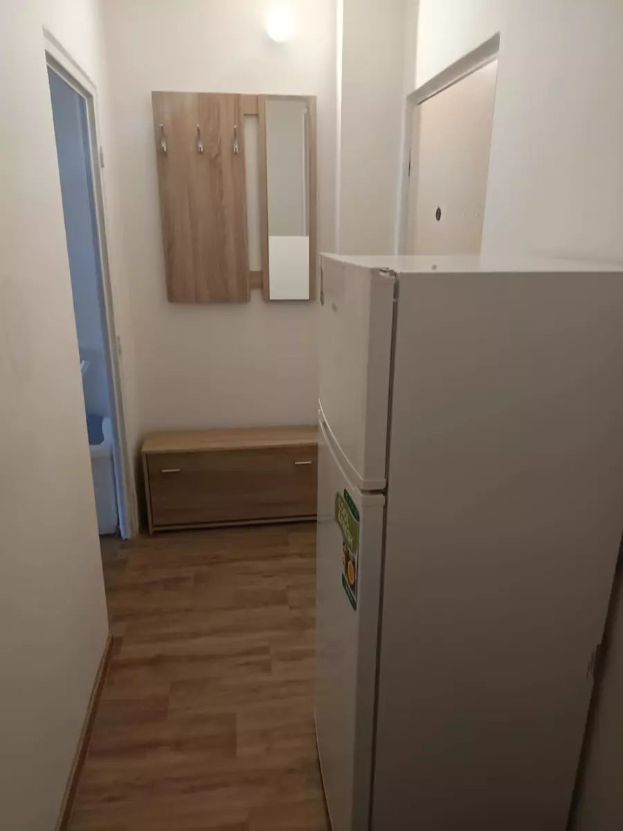 Byt je rozdělen do jednoho pokoje s kuchyňským koutem, kde naleznete spotřebiče jako je trouba, samostatně stojící lednice a pračka. Koupelna má zděné jádro.