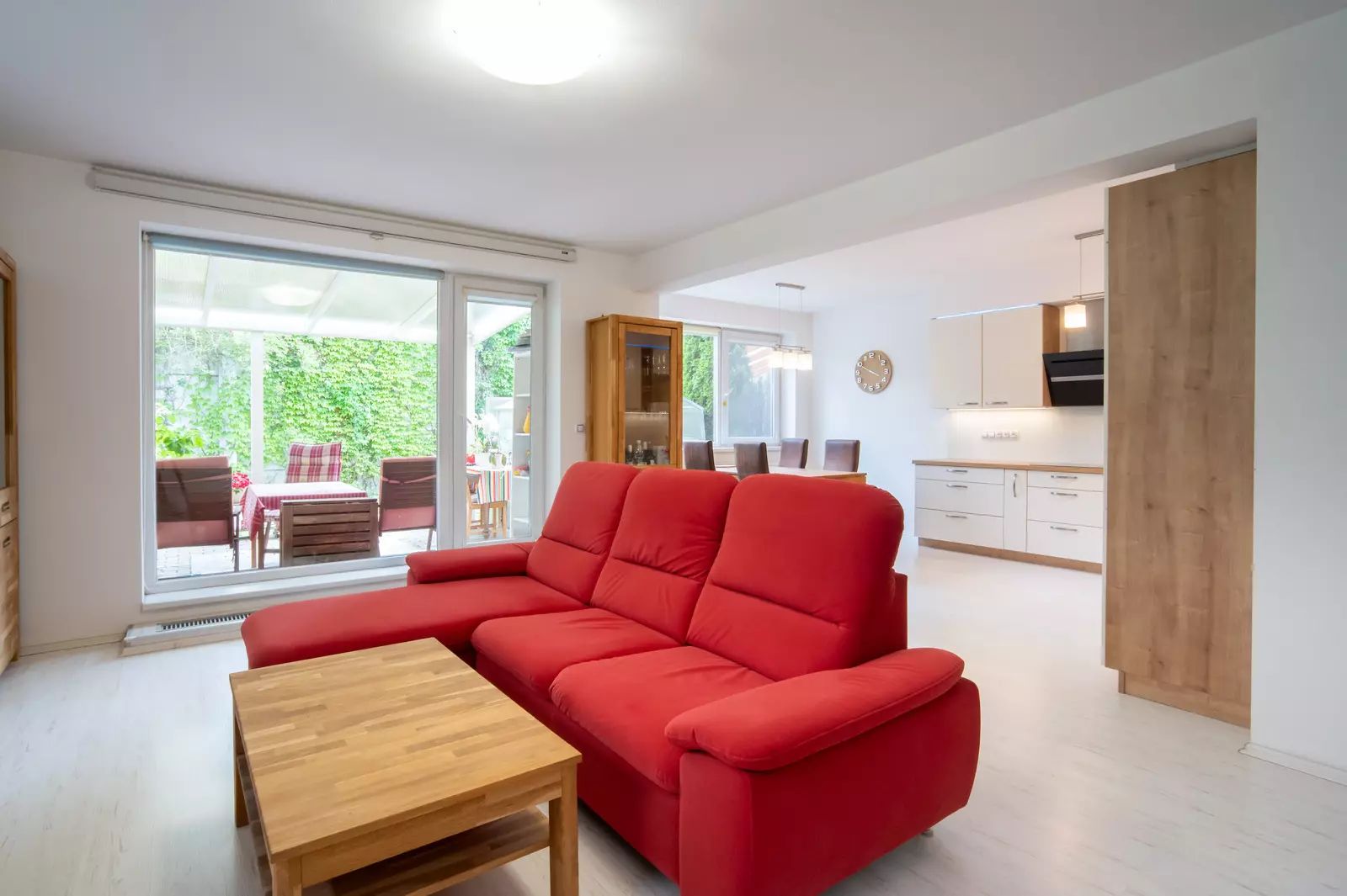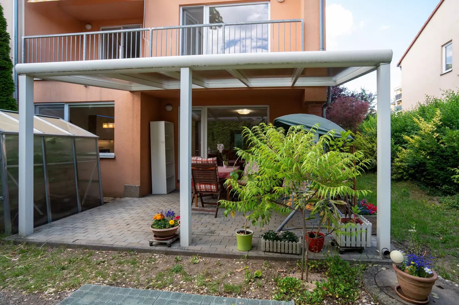 Komfort bydlení zvyšuje i přítomnost balkonu o ploše 9,1 m² a terasy o ploše 19,5 m², které nabízejí ideální místo pro odpočinek na čerstvém vzduchu. Dominantou prostoru jsou francouzská okna, která zajišťují dostatek přirozeného světla. Dům má centrální dálkové vytápění a ohřev teplé vody.