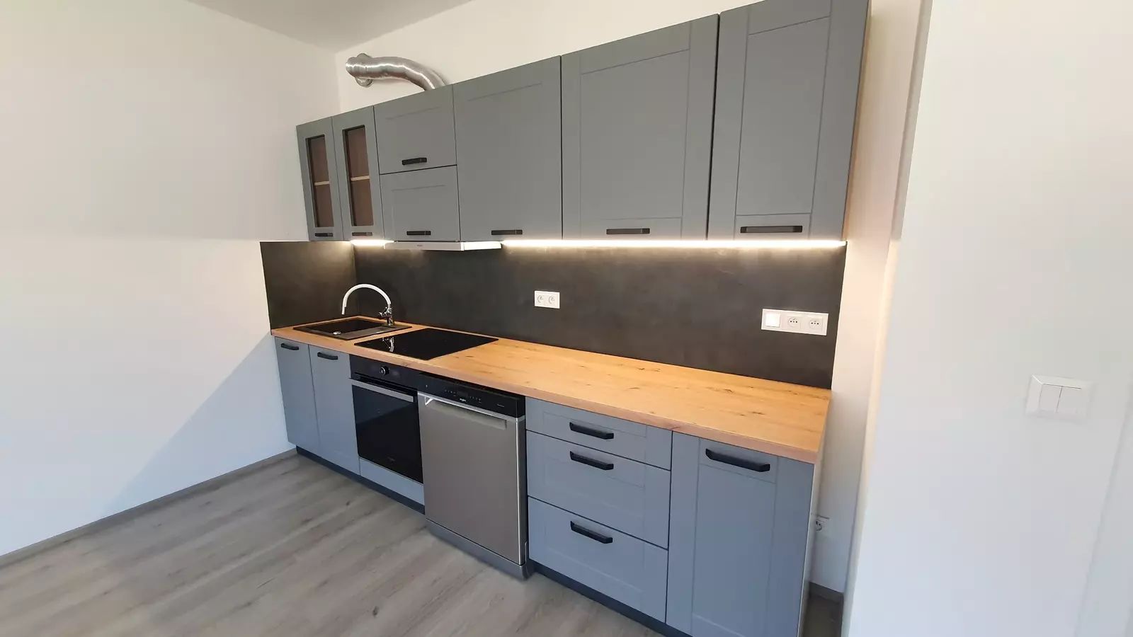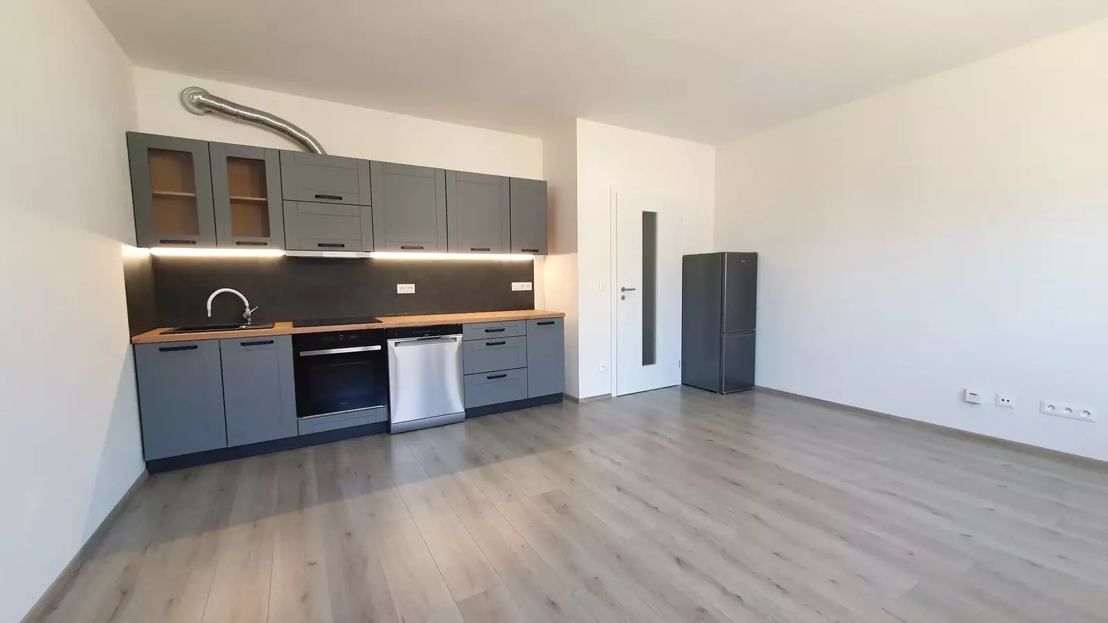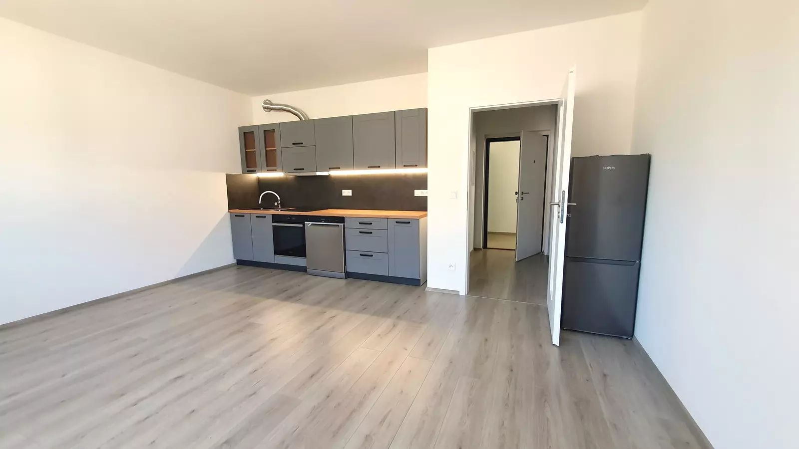 Byt je částečně zařízený a skládá se z prostorného obytného prostoru, který je díky velkým oknům plný světla. Výhled nabízí nenarušený pohled na okolí a dodává bytu jedinečnou atmosféru. Kuchyňský kout je vybaven moderními spotřebiči a poskytuje dostatek prostoru pro vaření a společné stolování.
