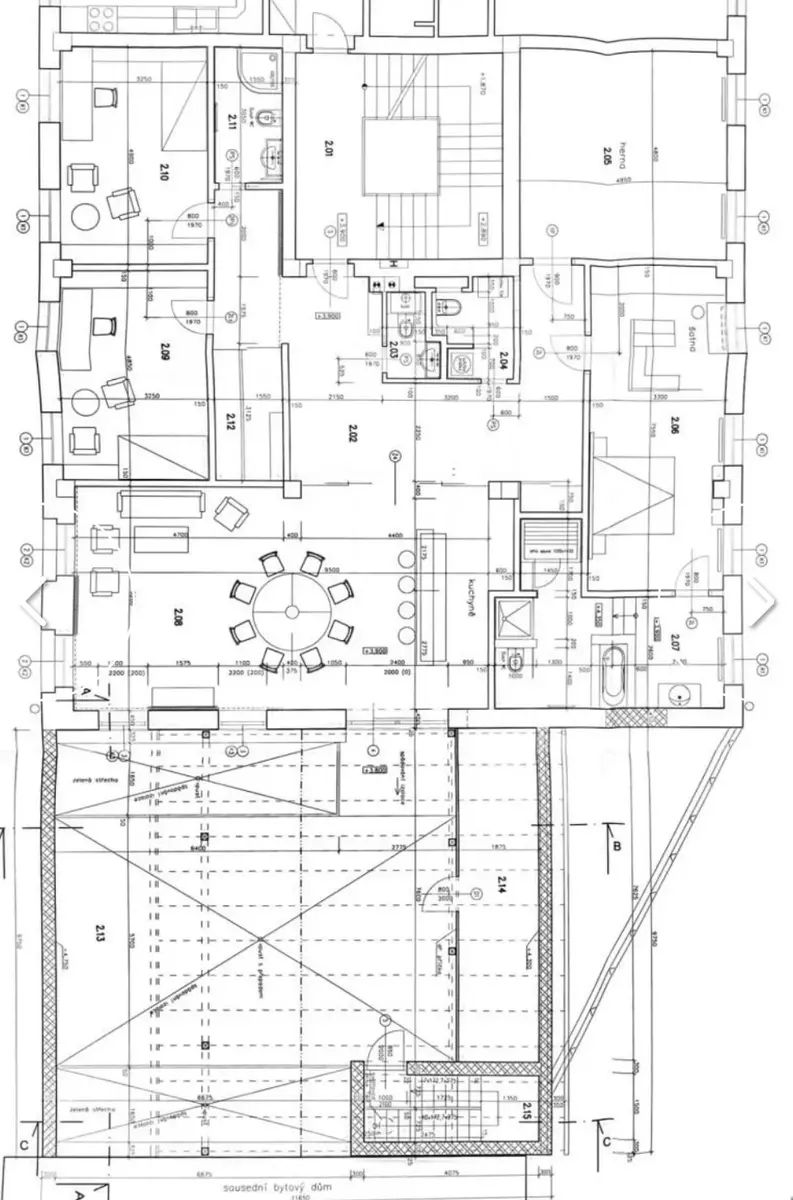 - *(2.10 + 2.09)* – Spojený prostor: ložnice (15,88m²) + menší obývací pokoj (15,83m²)