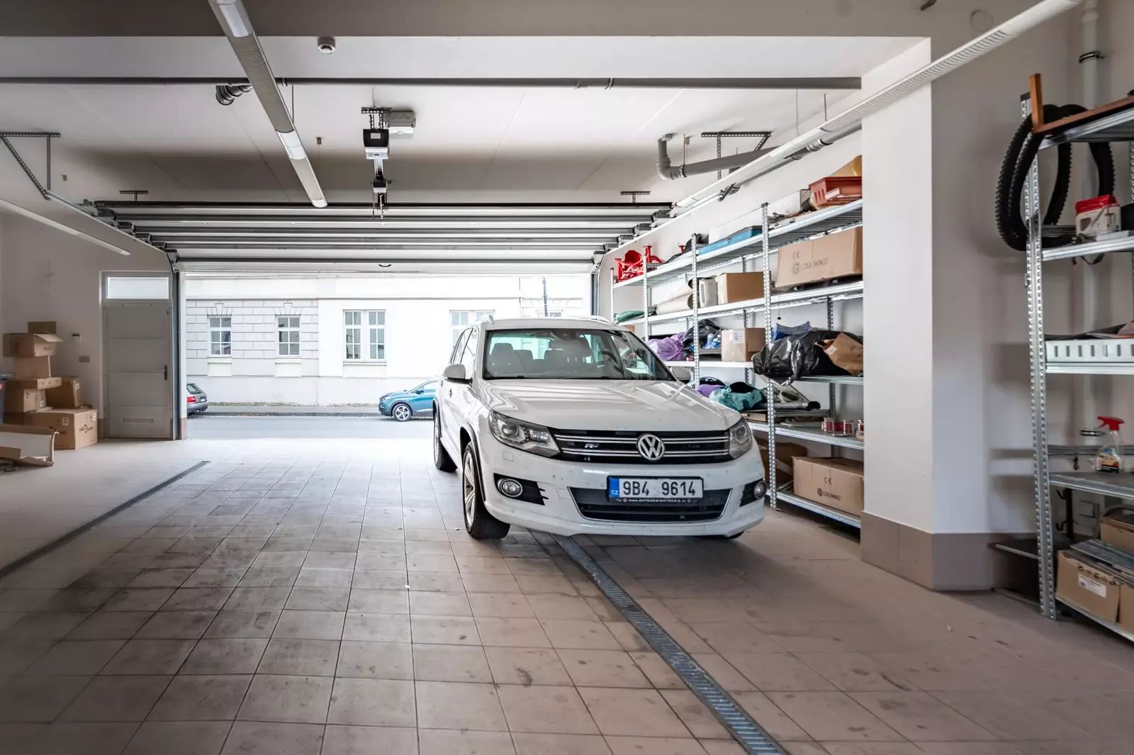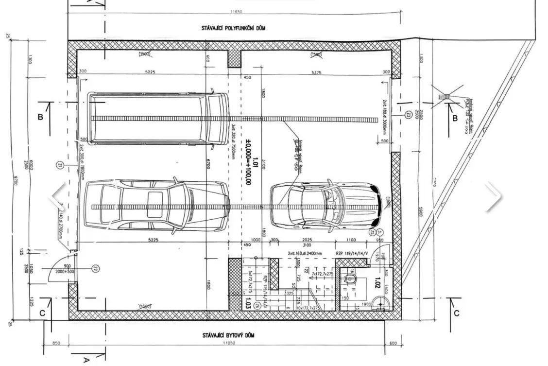 - *(1.01)* – Garáž + úložné regály (93,5m²)