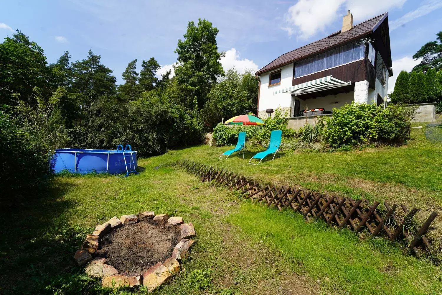 K chatě náleží zahrada o rozloze 343 m², která nabízí dostatek prostoru pro relaxaci, rodinné aktivity nebo pěstování zeleniny či květin. Pro venkovní posezení a grilování je zde prostorná terasa s markýzou.